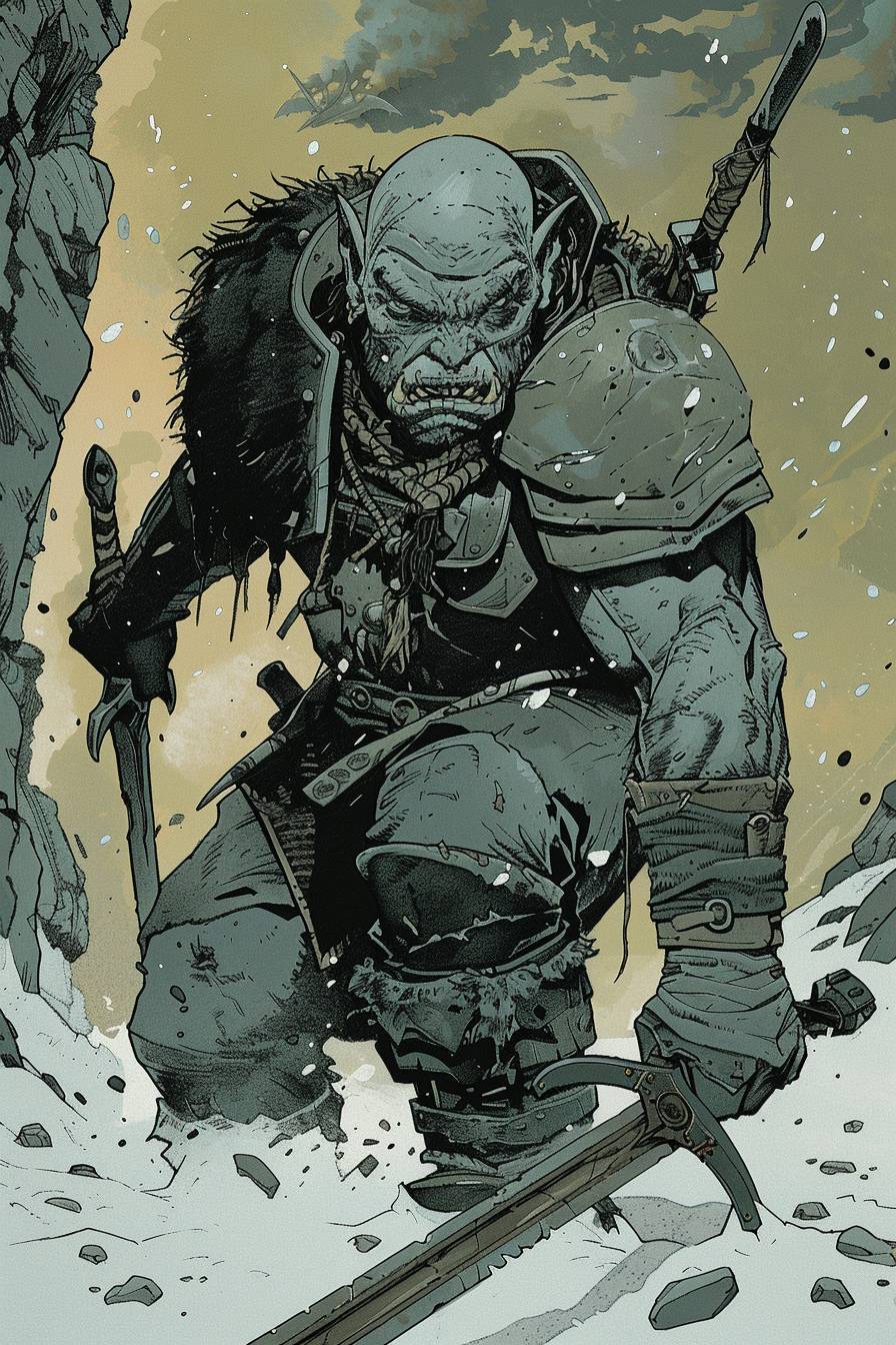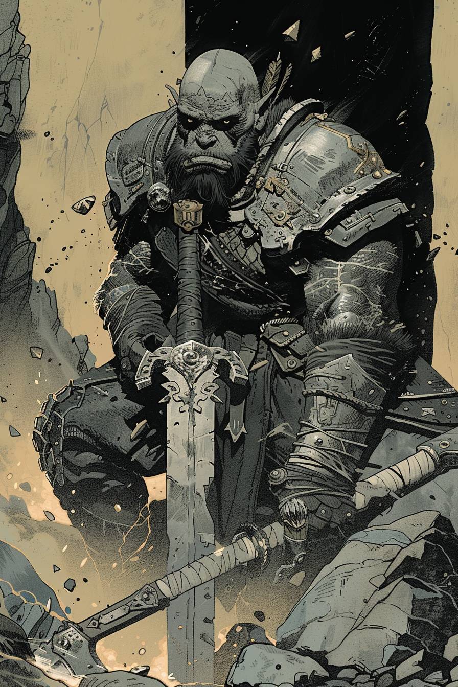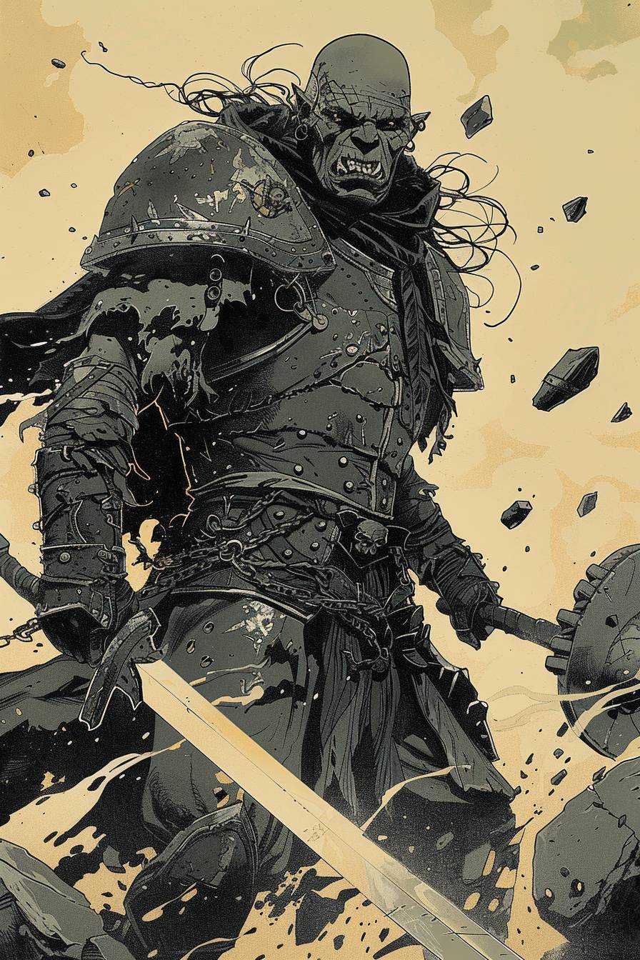 heavy armored orc berserker amidst brutal battle. Dynamic action illustration --sref 2540517565 --ar 2:3 --v 6.0 --s 250