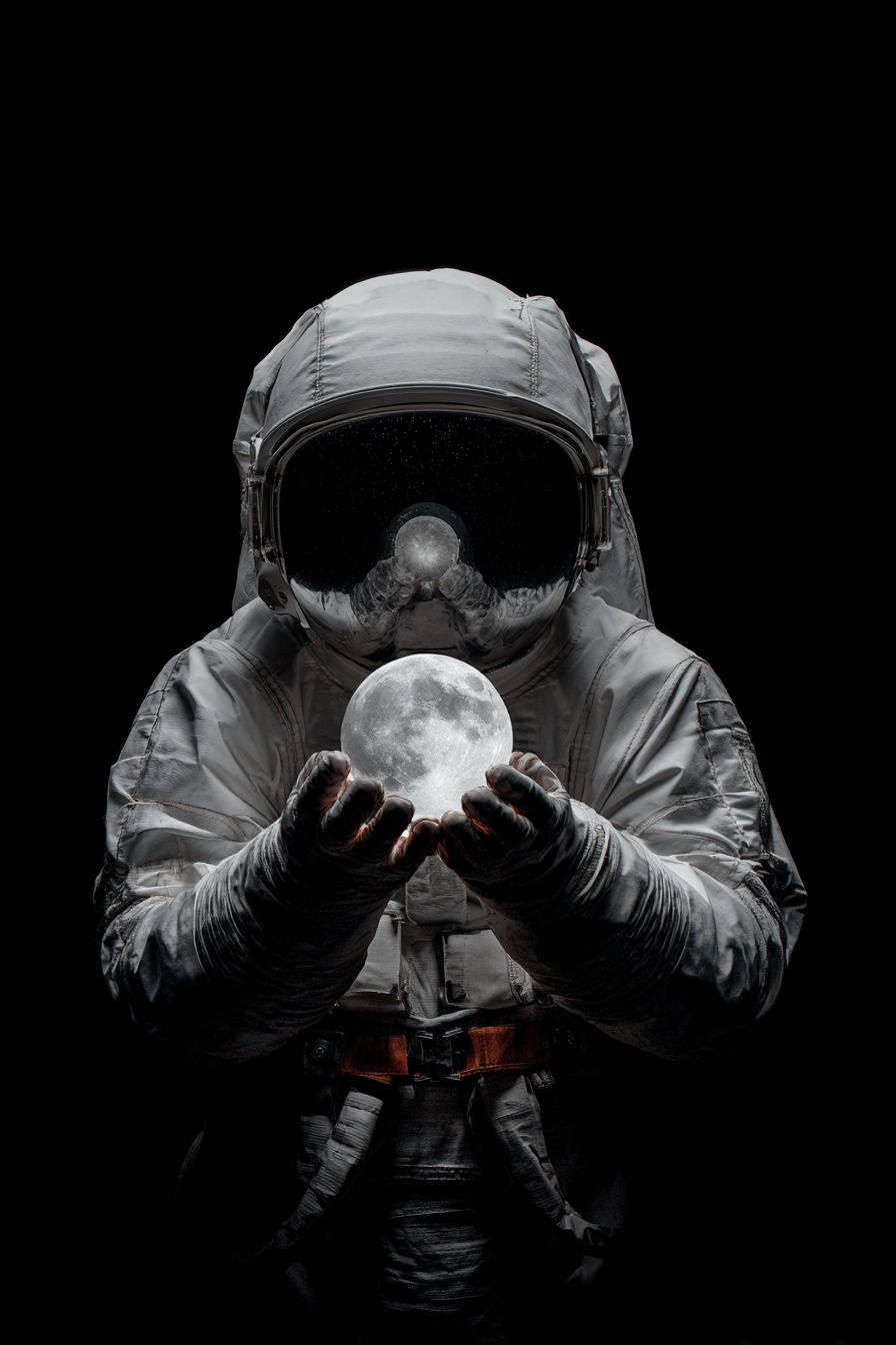 一位宇航员手握着月球的画面,反射摄影,科幻,2K,高分辨率。