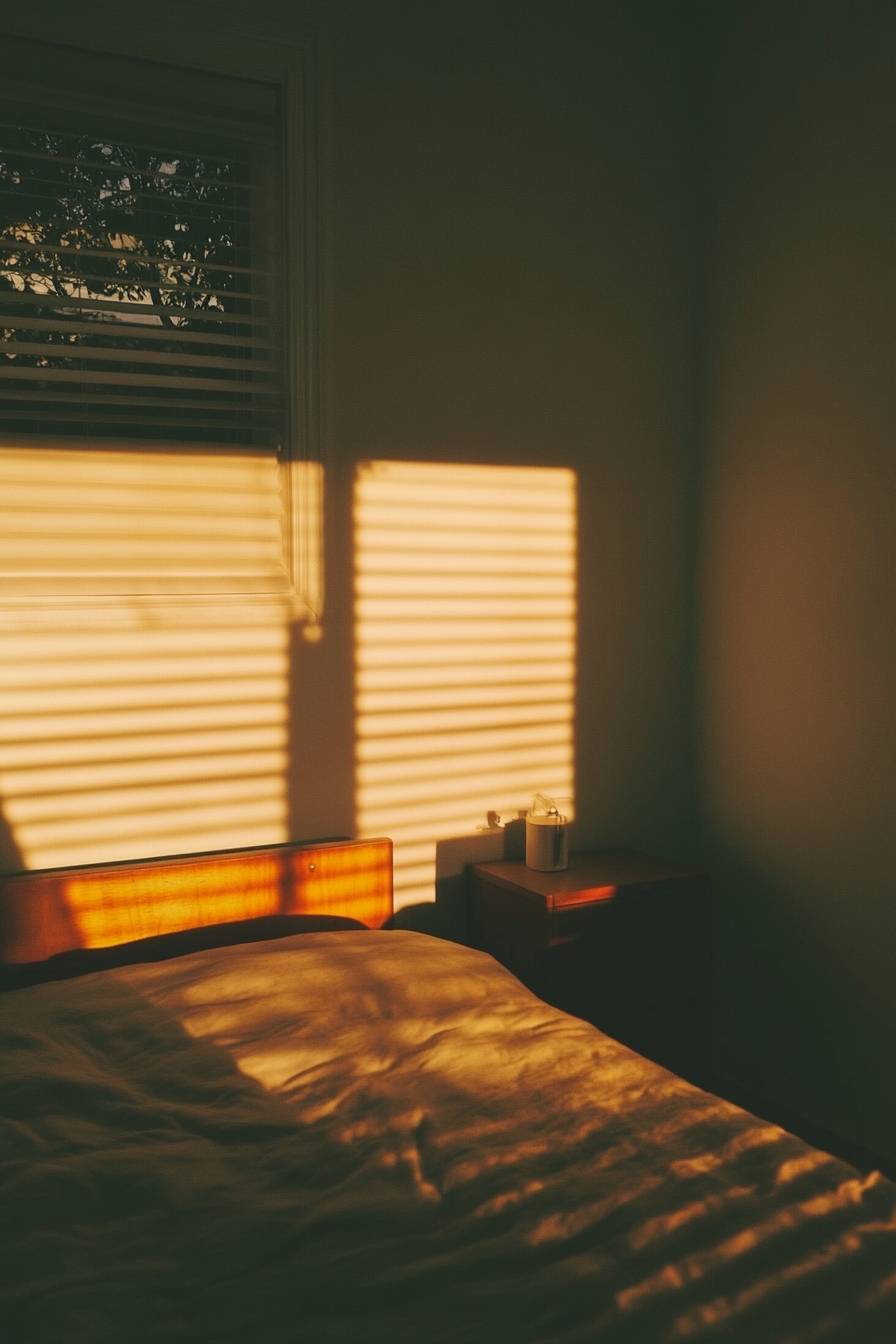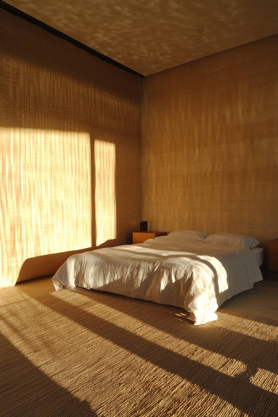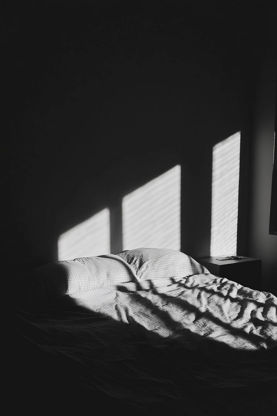 Minimal bedroom with a bed and small nightstand --profile 1pp1coq --ar 2:3 --v 6.1