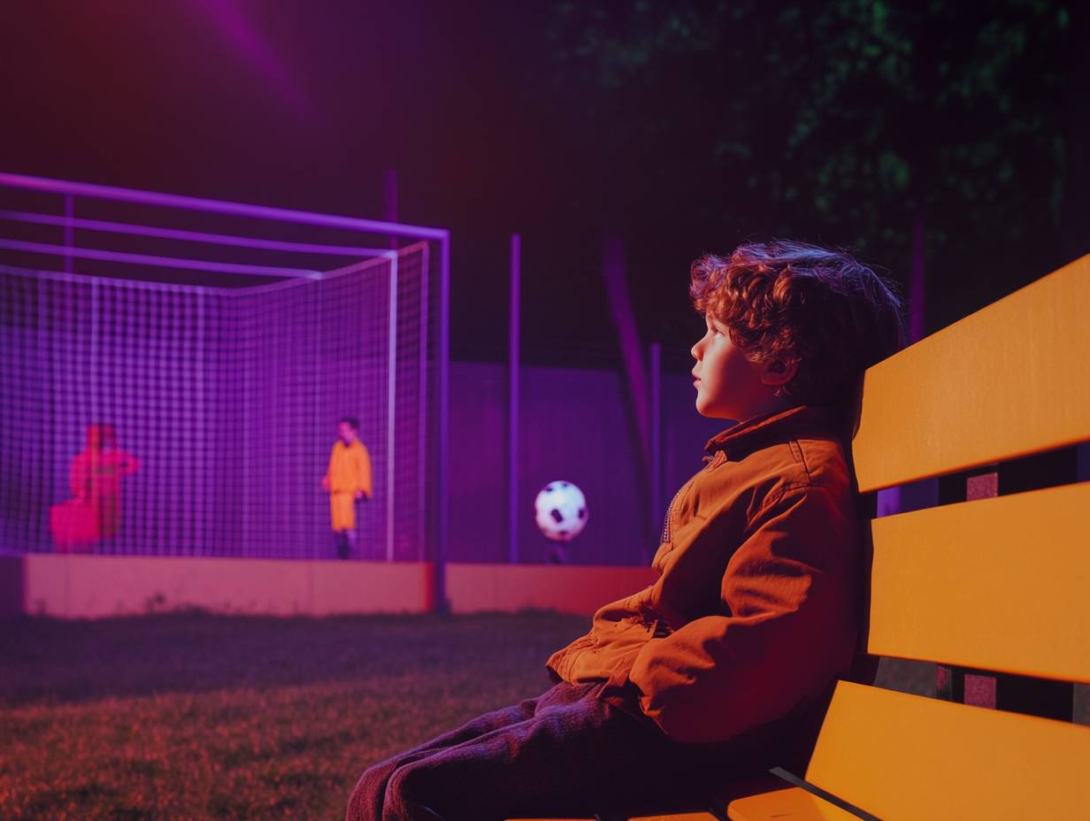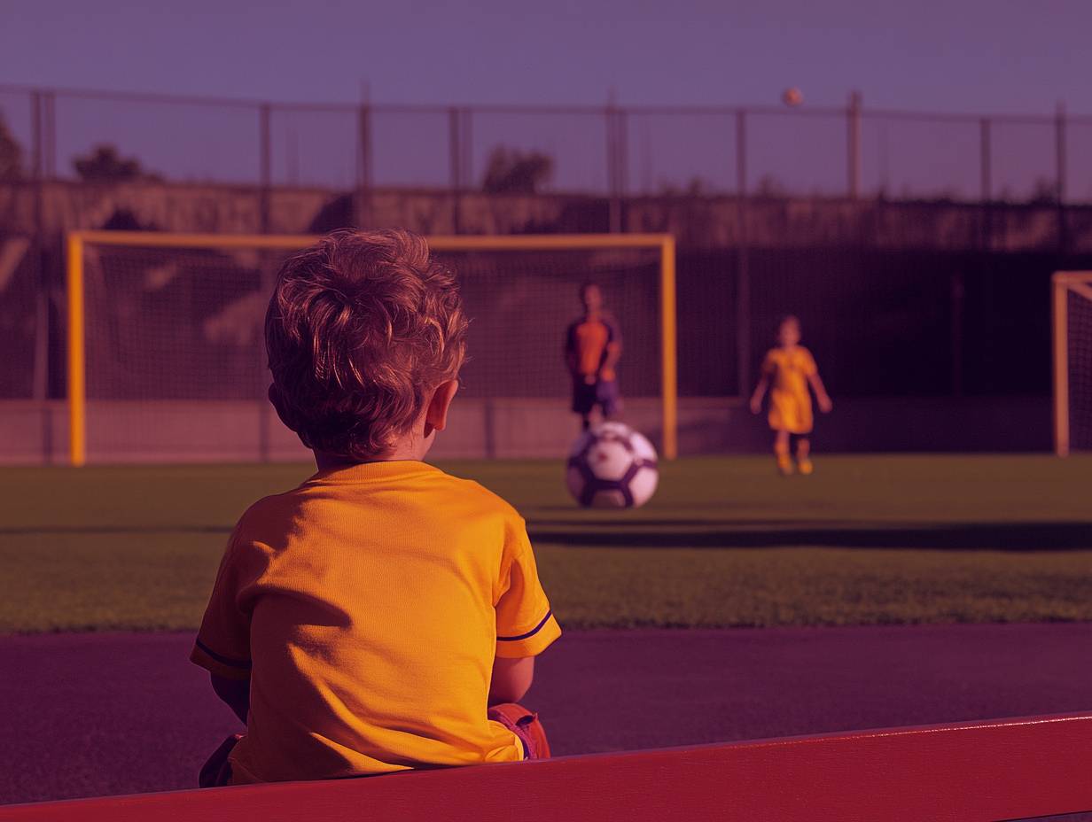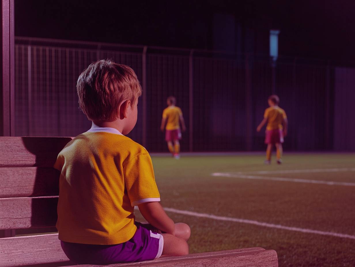 The little boy sitting on the bench is watching others play soccer. --sref 2376998380 --ar 4:3 --v 6.1