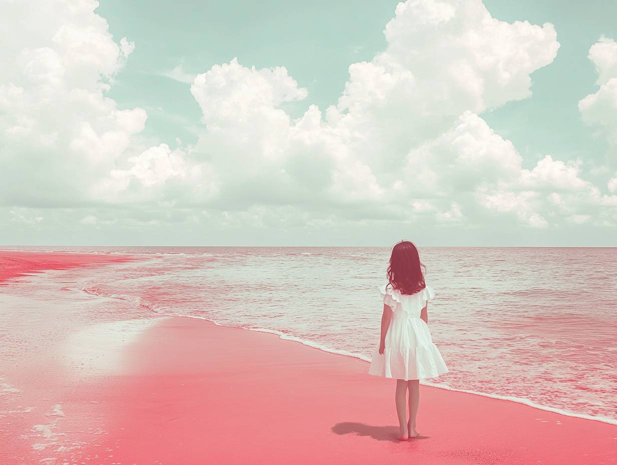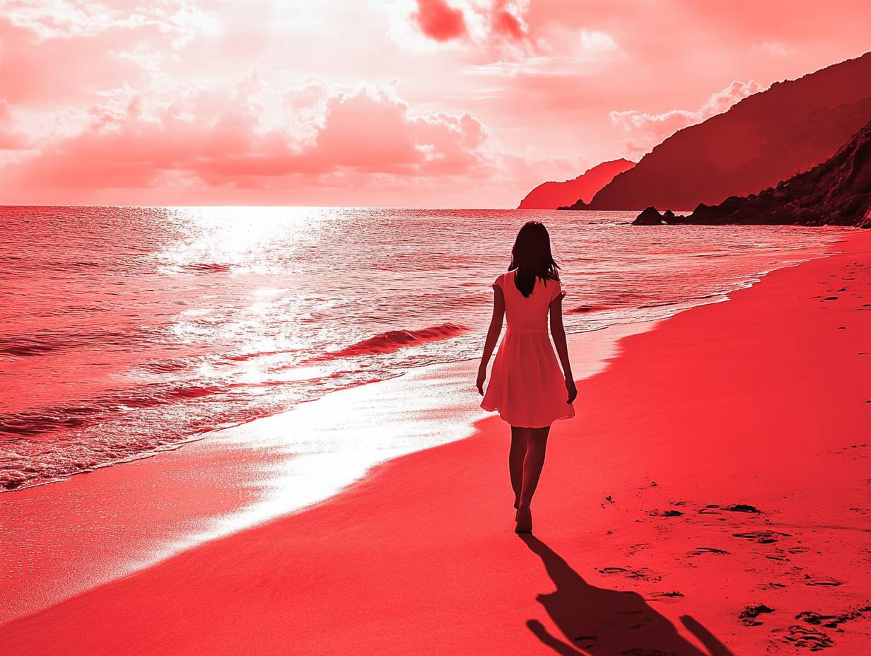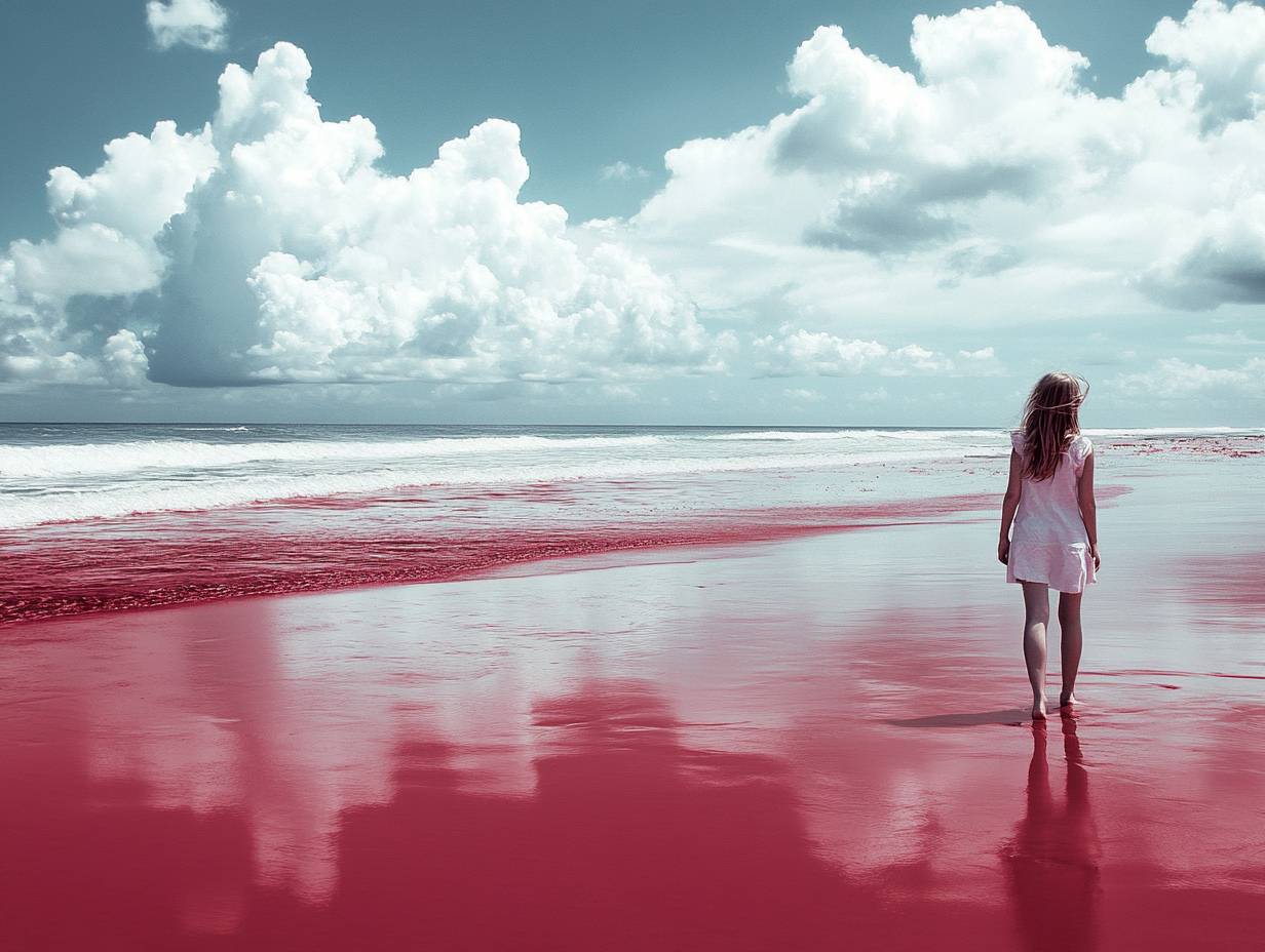 年轻女孩在红色海滩上。人名:任翰,双色摄影。