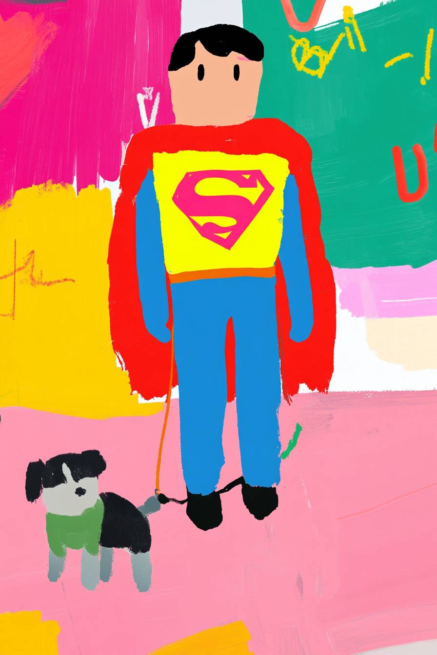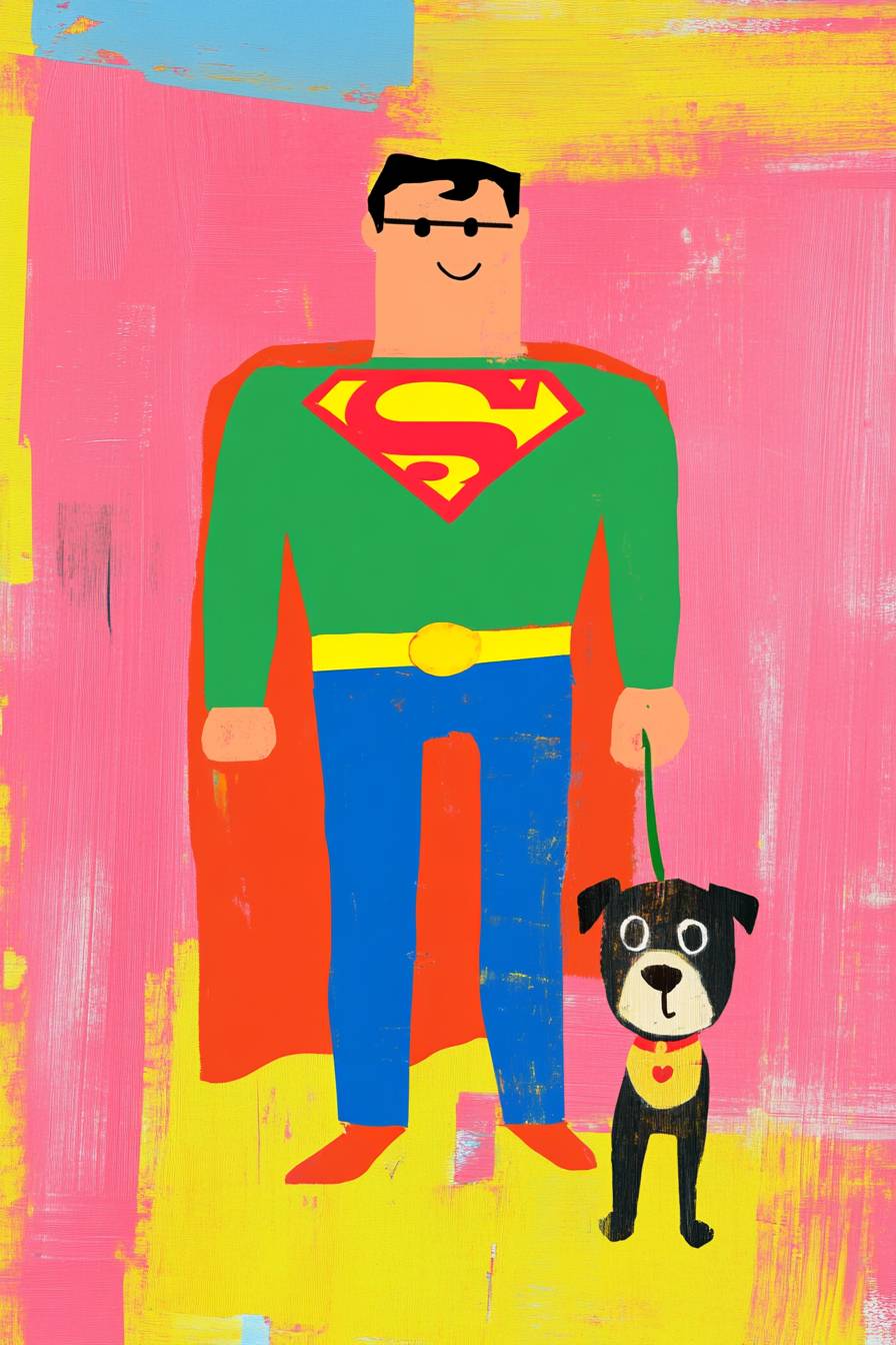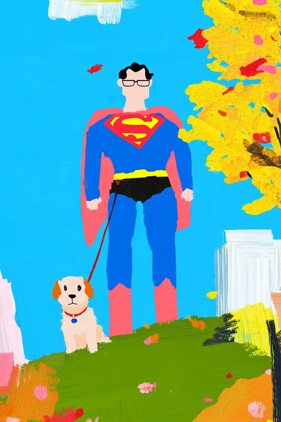 Superman with a puppy on a leash --sref 4210831192 --ar 2:3 --v 6.1