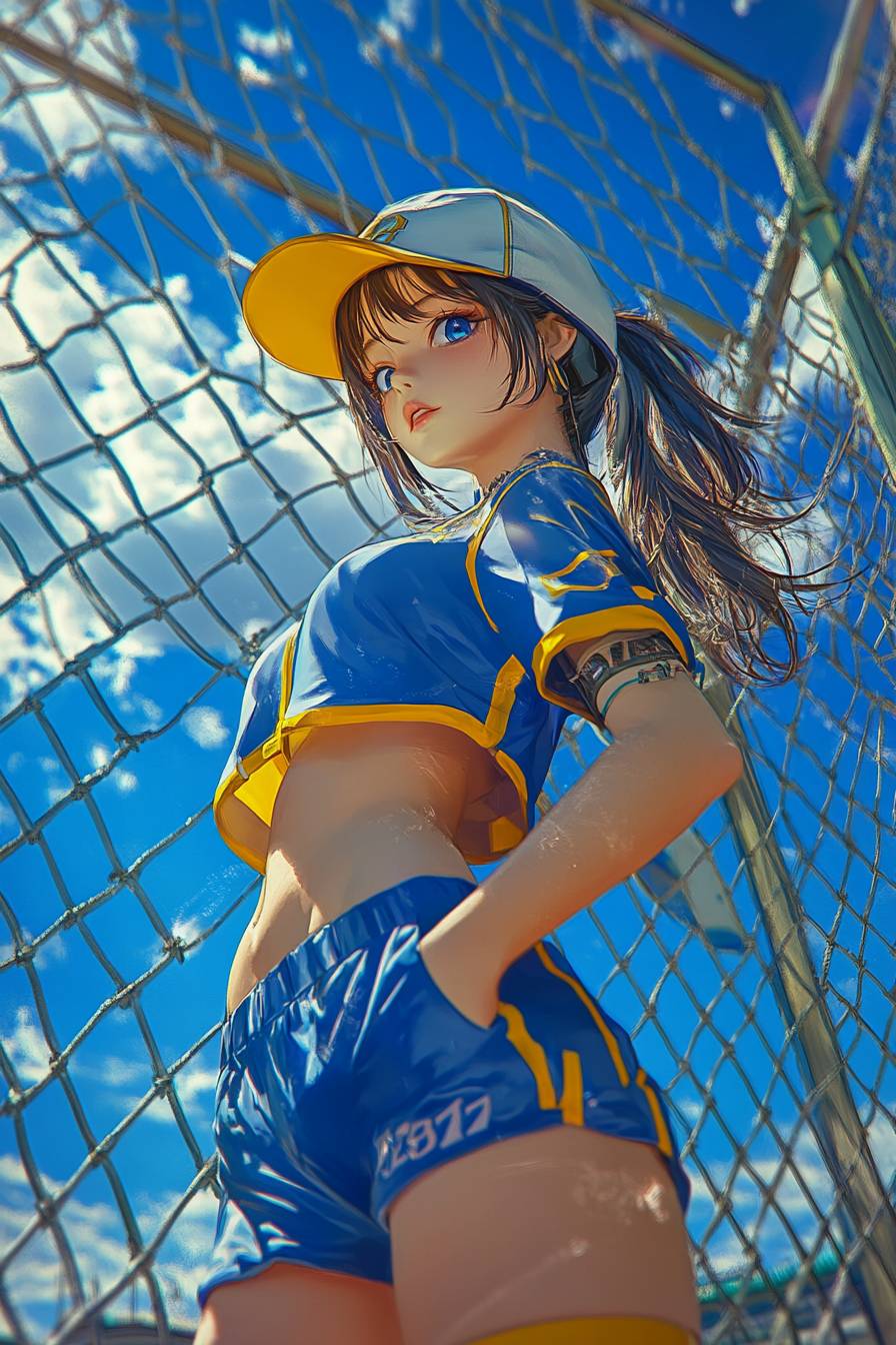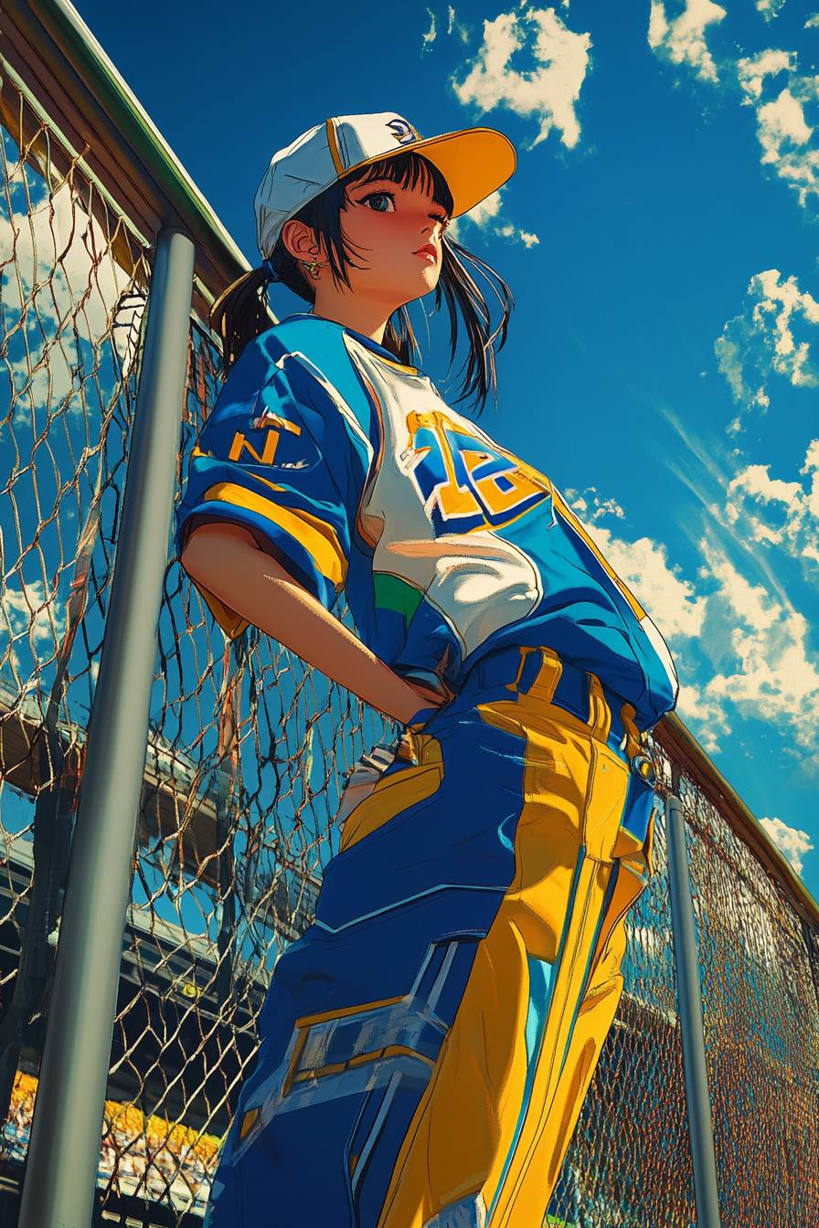 动漫风格的少年插画,展示了一位棒球女孩在体育场围栏前的姿势,她穿着蓝色和黄色的制服,戴着白色帽子,背景色彩丰富,视角壮观,蓝天和明亮的色彩。背景呈现出赛博朋克风格,角色设计高度细致。这幅图像为高分辨率的全身照,使用广角拍摄,使用Octane Render渲染,具有超细致的元素。