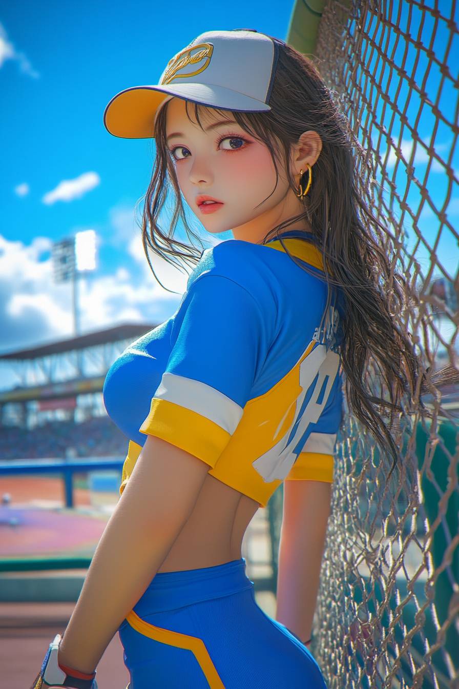 一位棒球女孩在体育场围栏前摆姿势,穿着蓝黄制服和白色帽子,背景为赛博朋克风格。