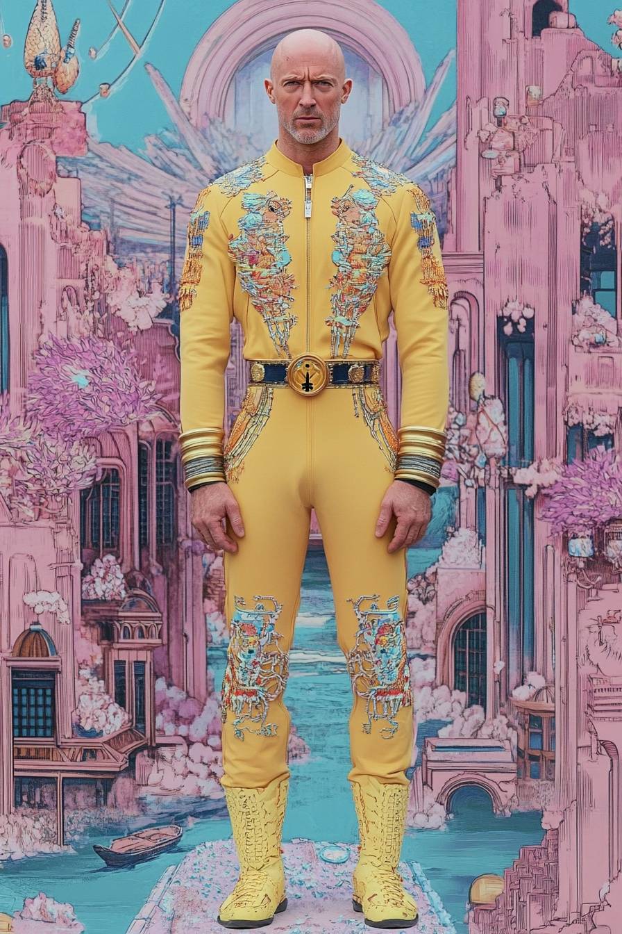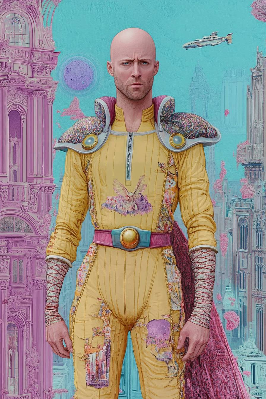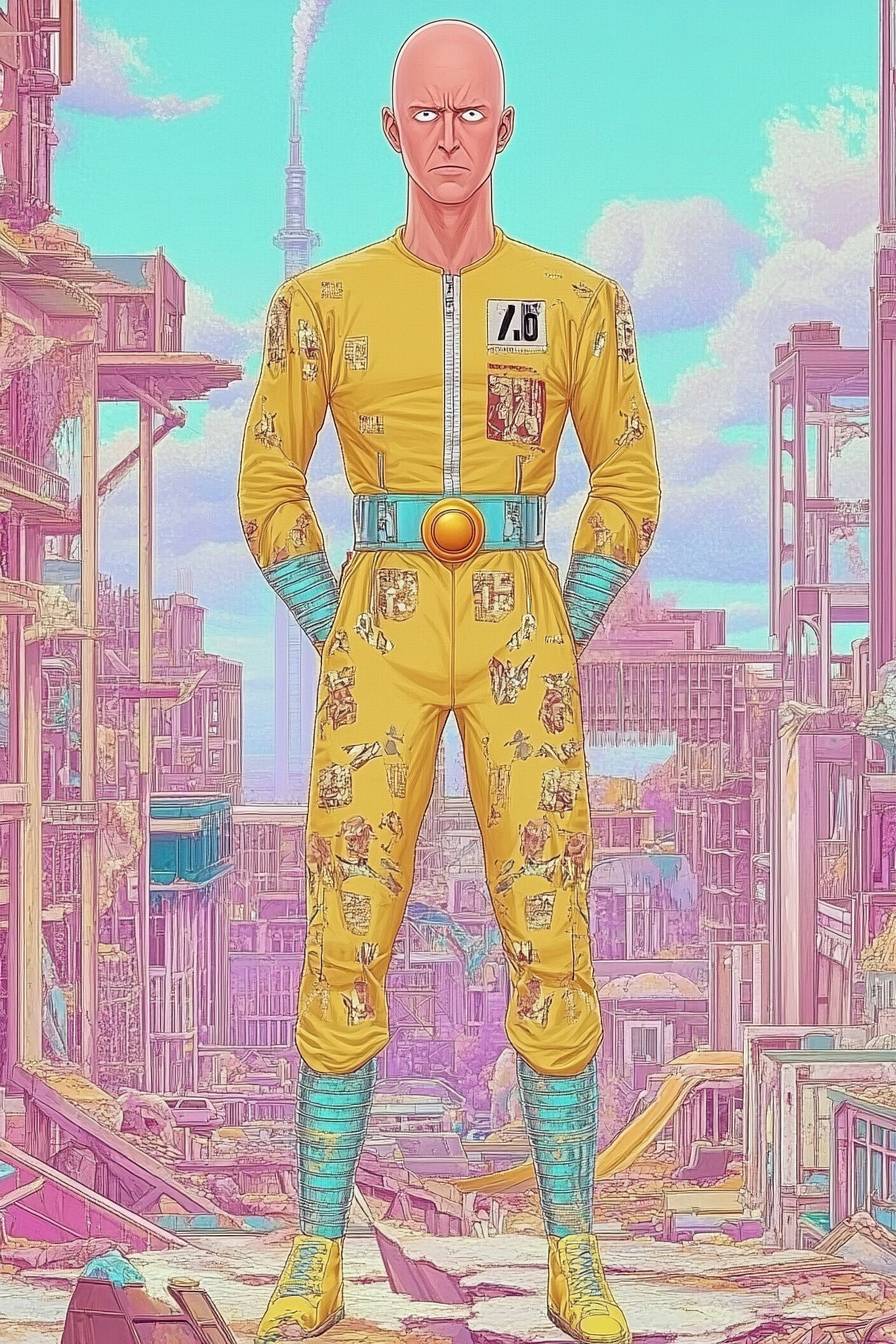 休·杰克曼打扮成《一拳超人》的埼玉,穿着黄色连体衣,光头,疲倦的表情,废墟城市,精致的动漫风格