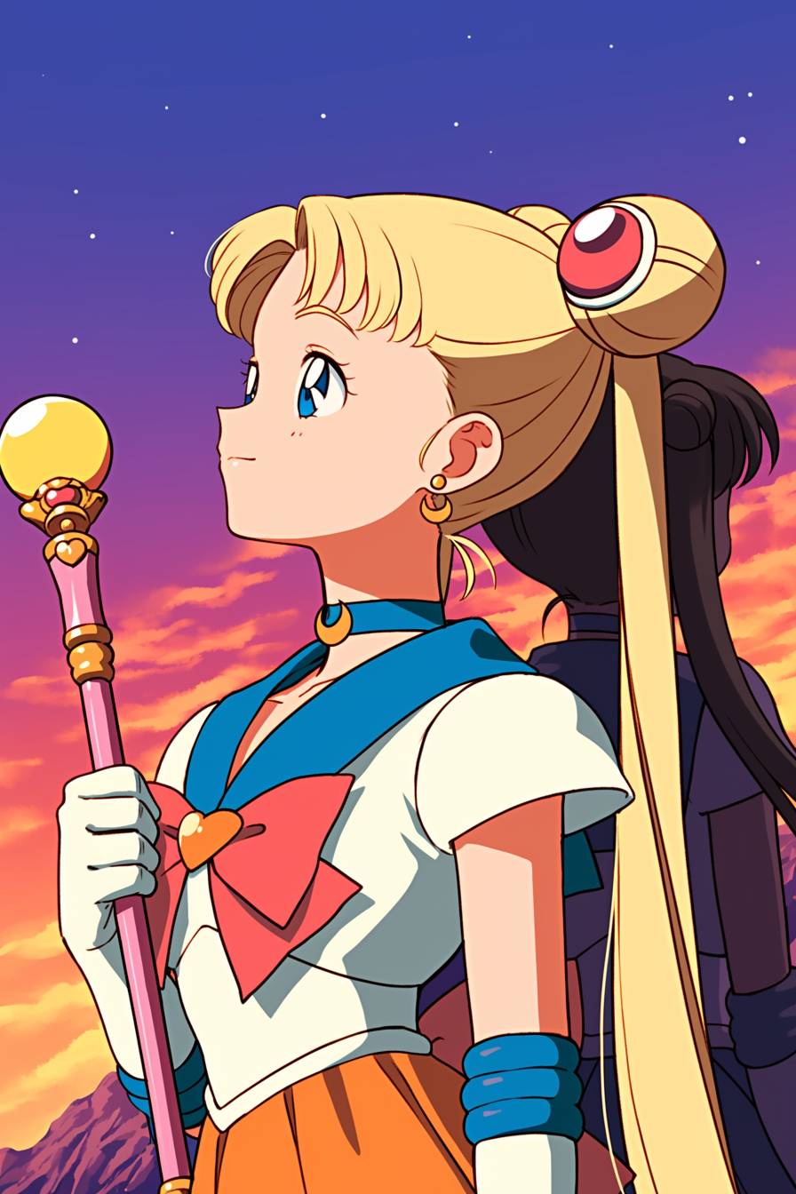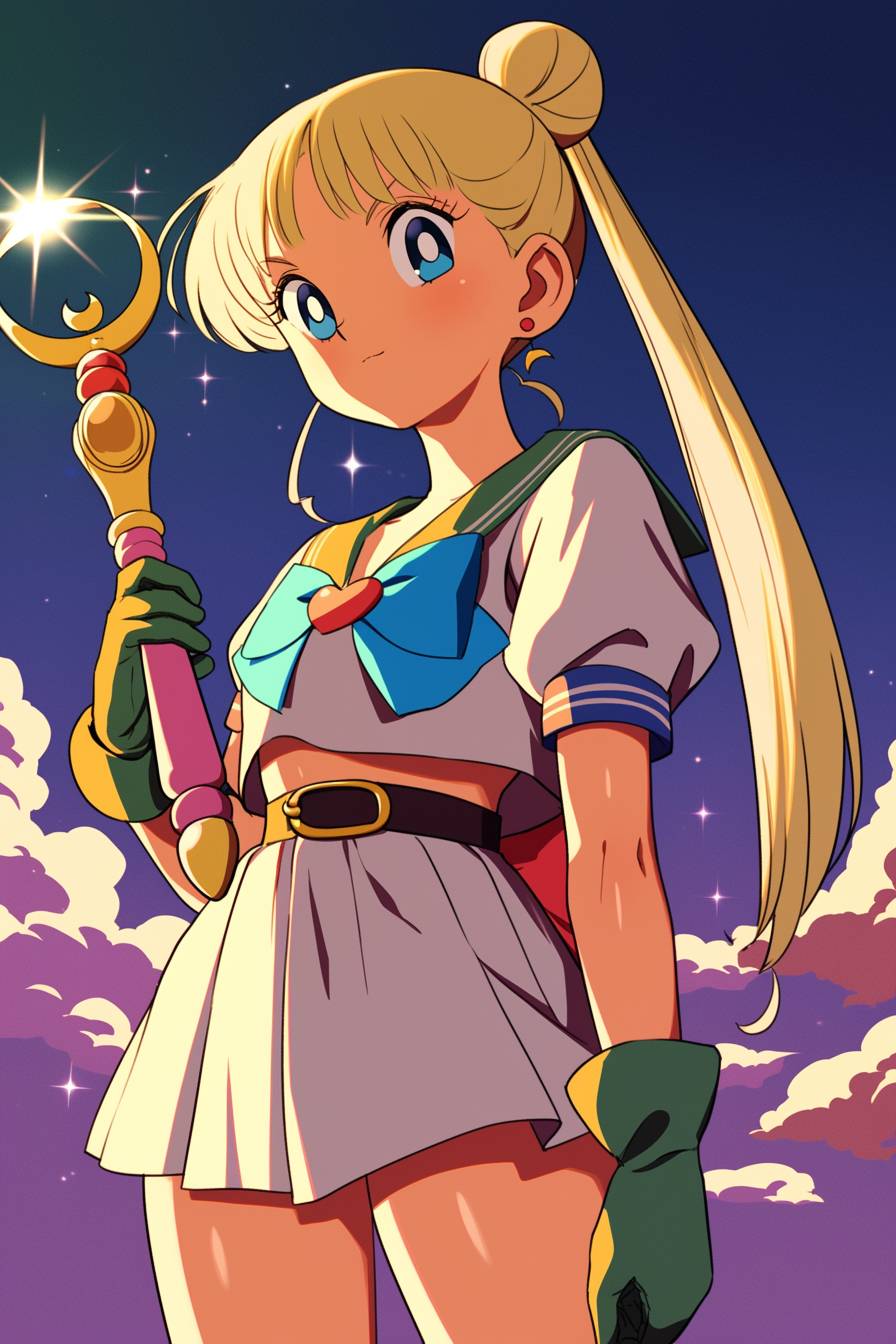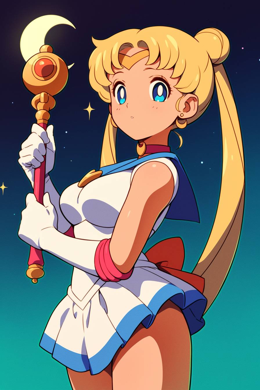 泰勒·斯威夫特扮演水手月亮,穿着闪亮的白色和蓝色水手服,长长的金色双马尾,手持魔法棒,在月光下的天空中,细致的动漫风格,色彩鲜艳。