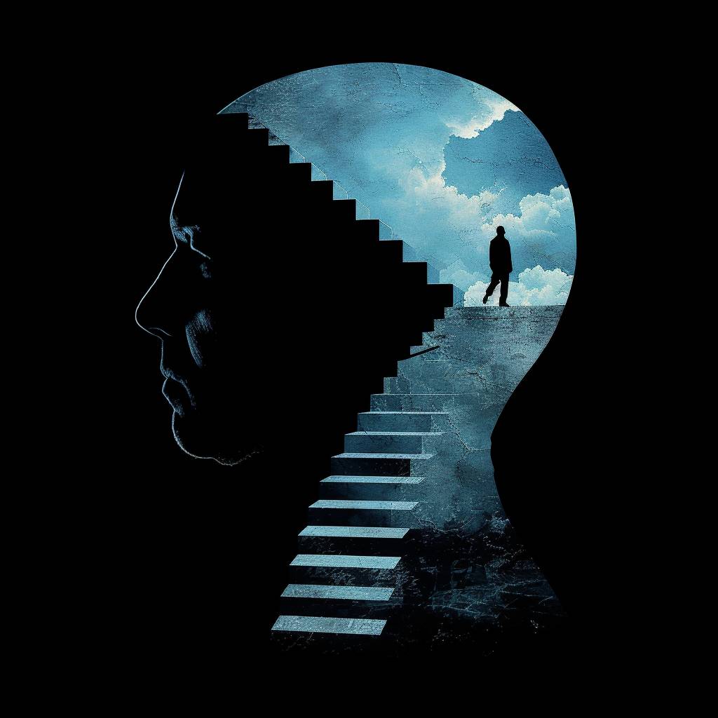 Create a digital artwork featuring a sculptural silhouette of [old man’s] head with an open mind revealing stairs inside. A lone figure is seen ascending the stairs, symbolizing personal growth. The scene is set against a stark black background with minimalistic design elements. Illuminate the piece with a [blue-white gradient] lighting for a surreal effect. Ensure the artwork is in sharp focus, with a surreal, ethereal atmosphere --v 6.0