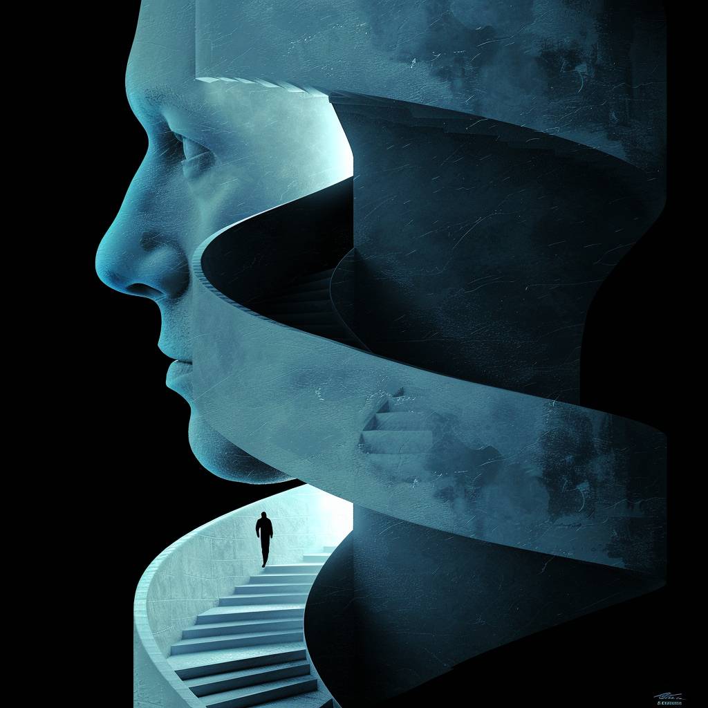 创作一幅数字艺术作品,描绘一位老人的头部雕塑轮廓,头颅打开,内部显露出楼梯。一个孤独的人物正在楼梯上爬升,象征着个人成长。整个场景设在一个纯黑的背景下,设计元素简约。用蓝白渐变的光照明,以营造超现实效果。确保艺术作品清晰聚焦,氛围超现实、空灵。