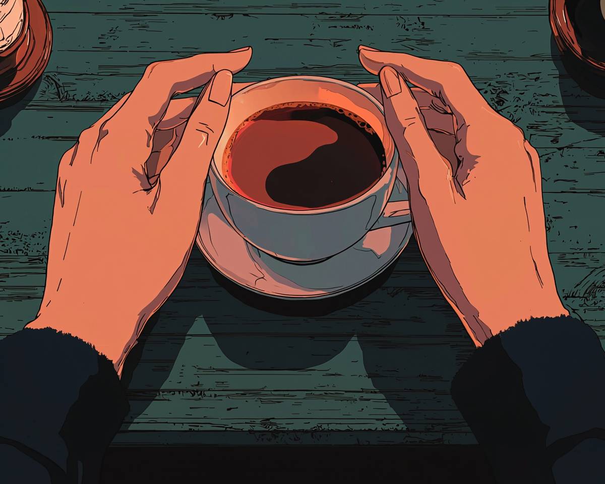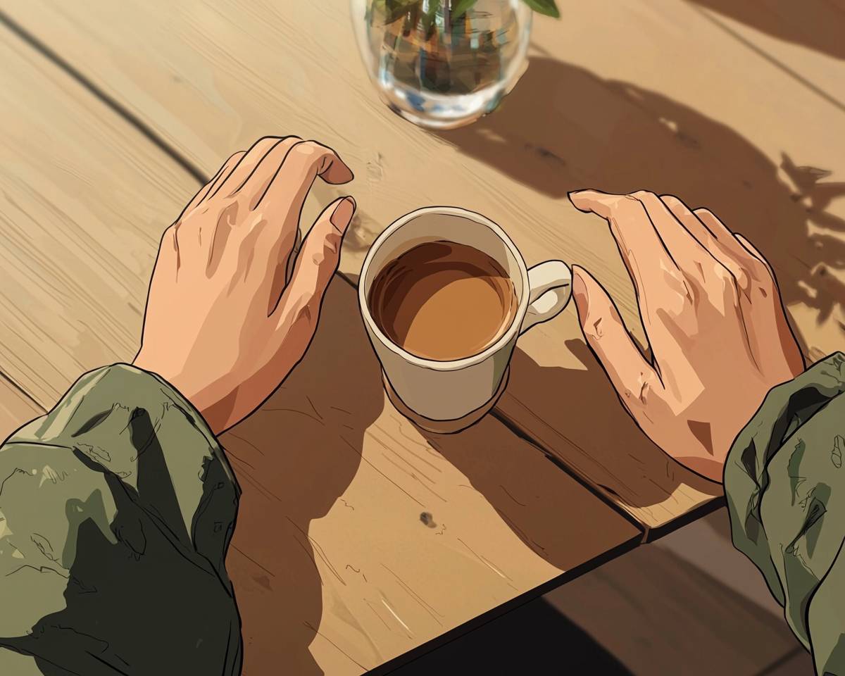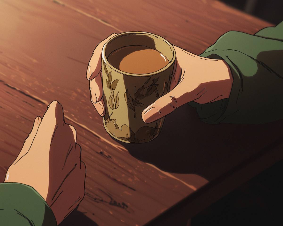 close shot to somone hands on a table holding a coffe cup, lofi anime style in the style of anime --ar 5:4 --q 2 --v 6.1