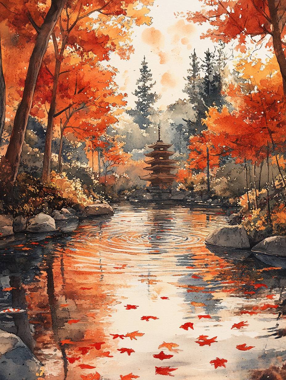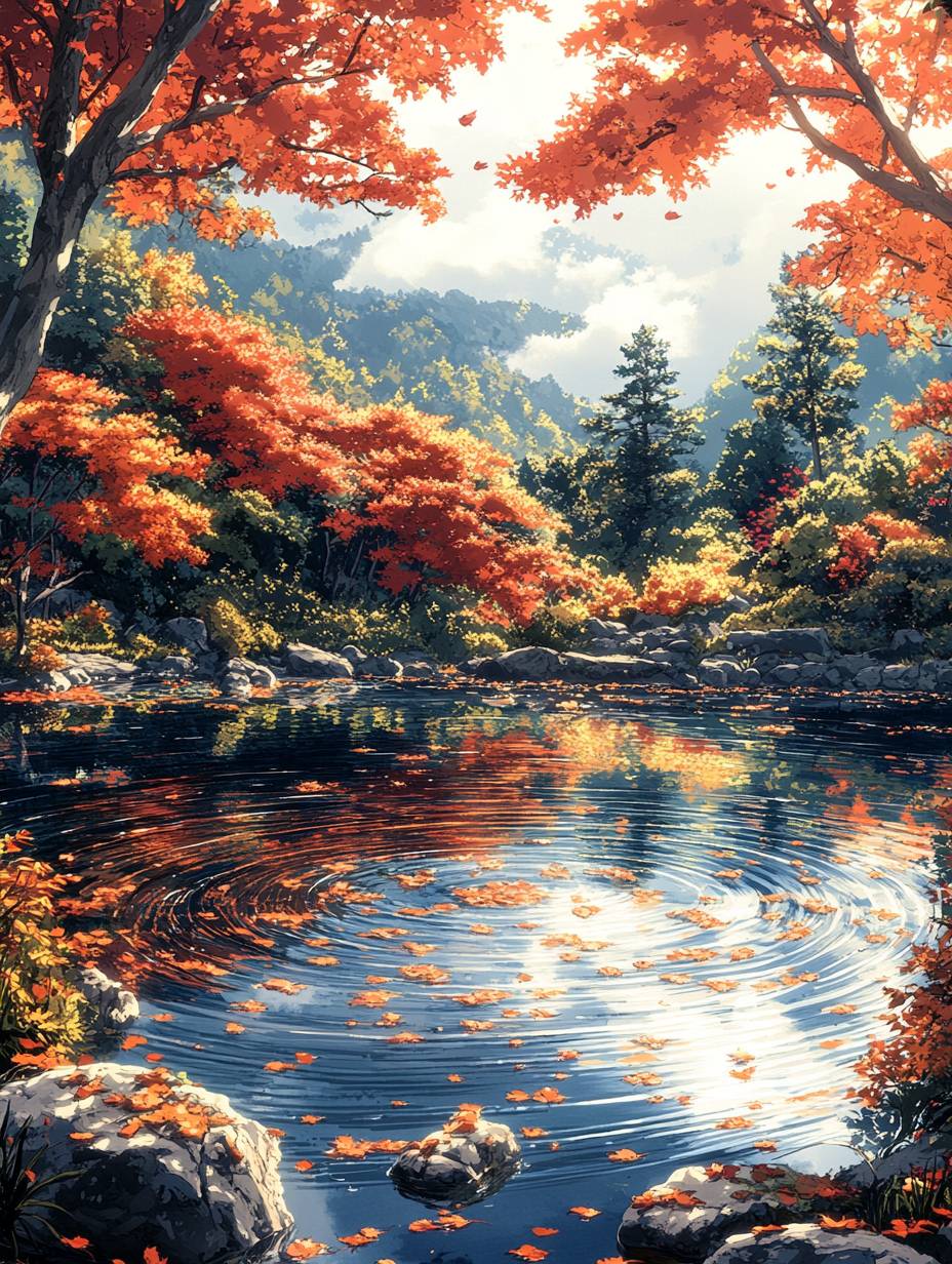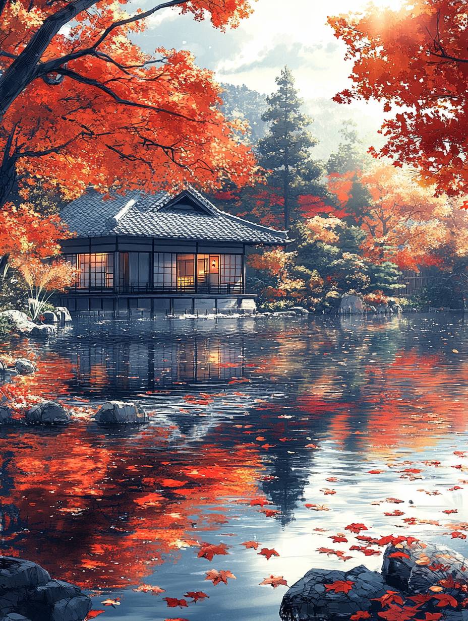 A serene Japanese garden in autumn, koi pond with ripples, maple trees shedding crimson leaves, soft sunlight filtering through, in the style of Studio Ghibli, detailed illustration, --ar 3:4 --stylize 750 --v 6.1