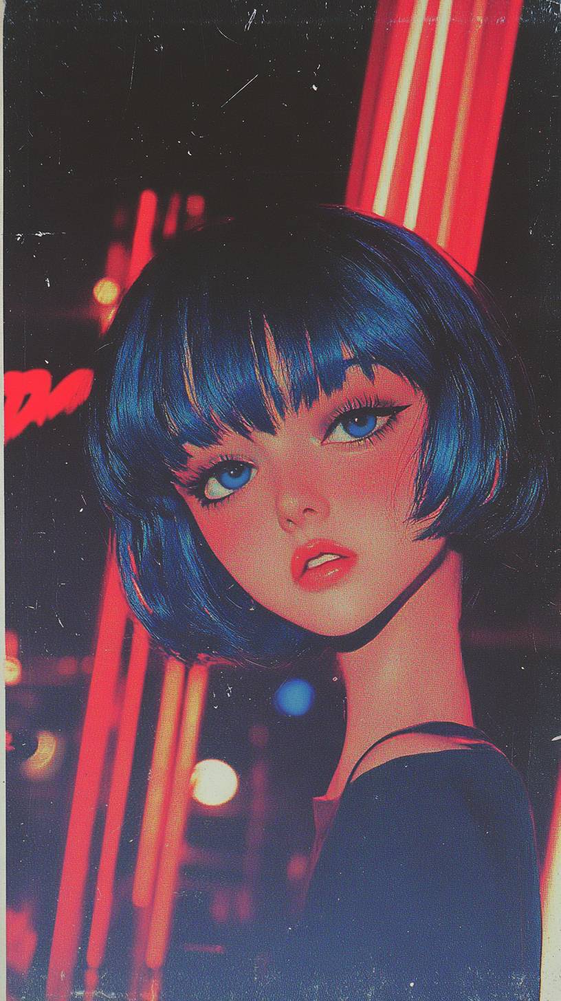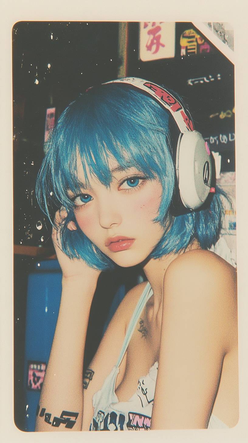 宝丽来效果,2000年代的照片,福音战士,绫波丽,蓝色头发,蓝色眼睛,肖像,穿着2000年代复古时尚,明暗对比,夜晚的东京