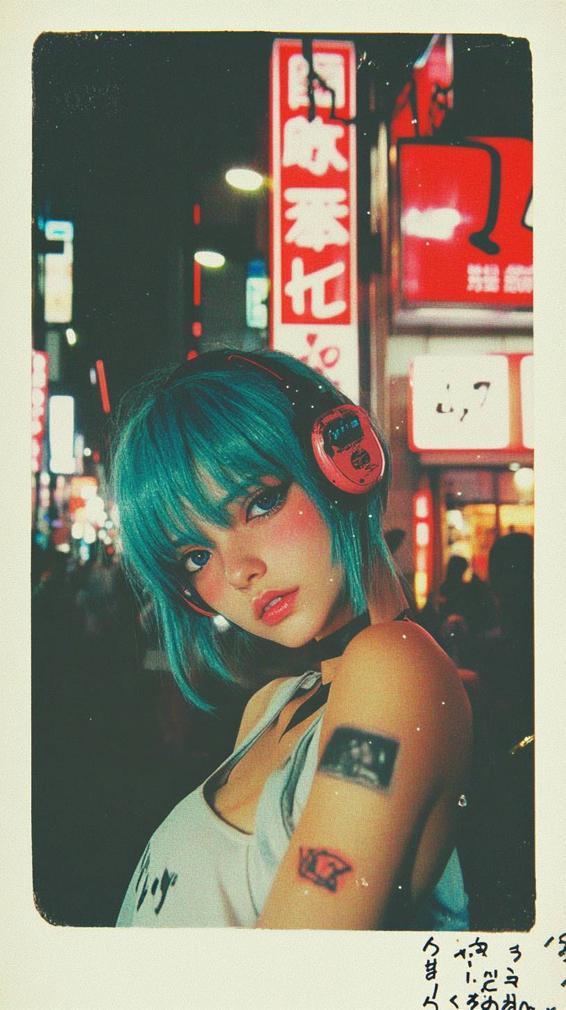 Polaroid effect,2000s photo, Evangelion, Rei Ayanami, blue hair, blue eyes, portrait, wearig a 2000s retro fashion,chiaroscuro,at the 2000s night tokyo --ar 9:16 --style raw --profile 6ce3yr6 --stylize 90 --v 6.1