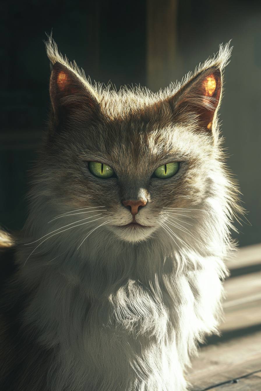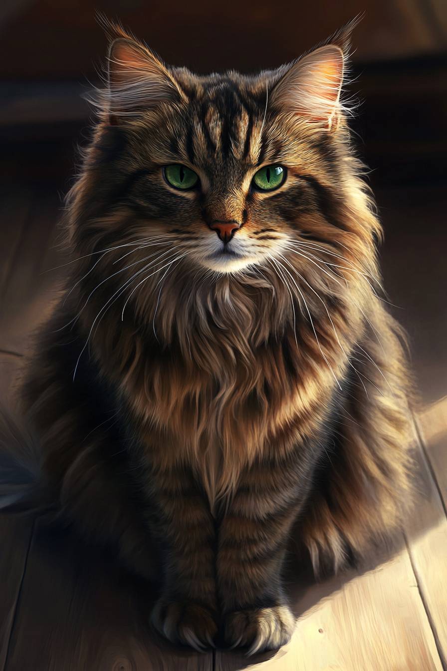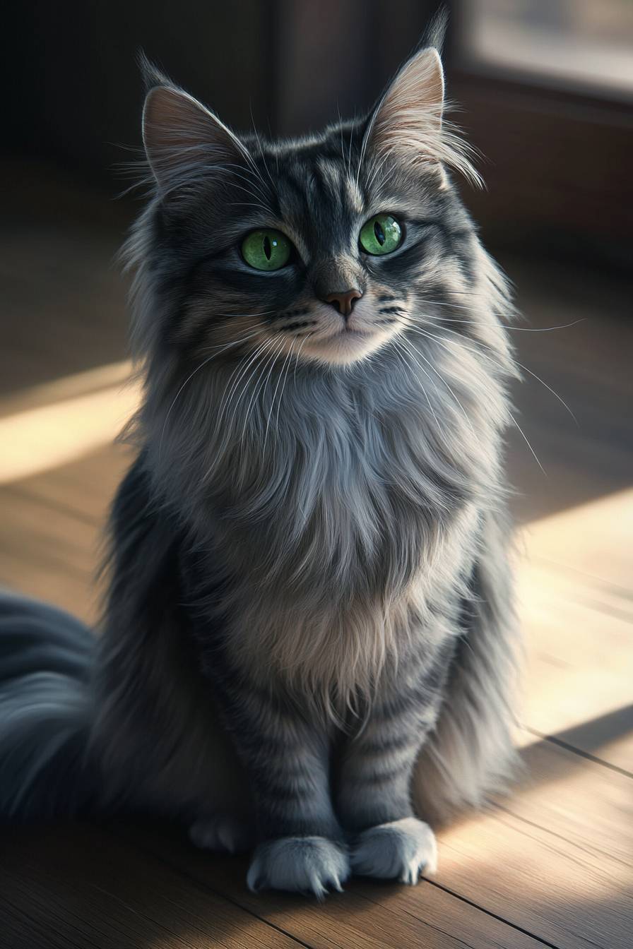 A close-up of a fluffy Maine Coons cat with piercing green eyes, soft fur texture, sitting on a wooden floor, natural sunlight, highly detailed, photorealistic, 4k resolution --ar 2:3