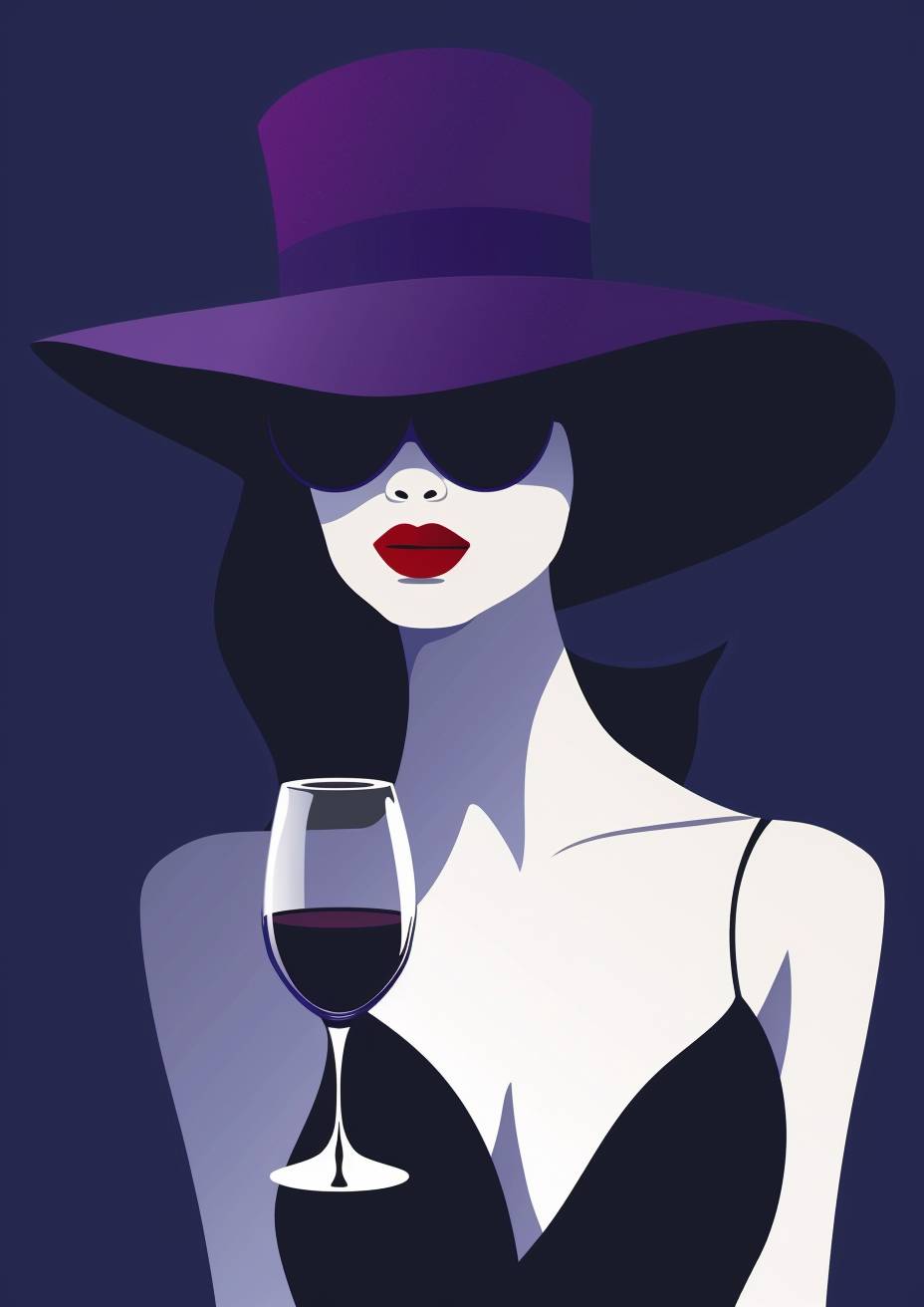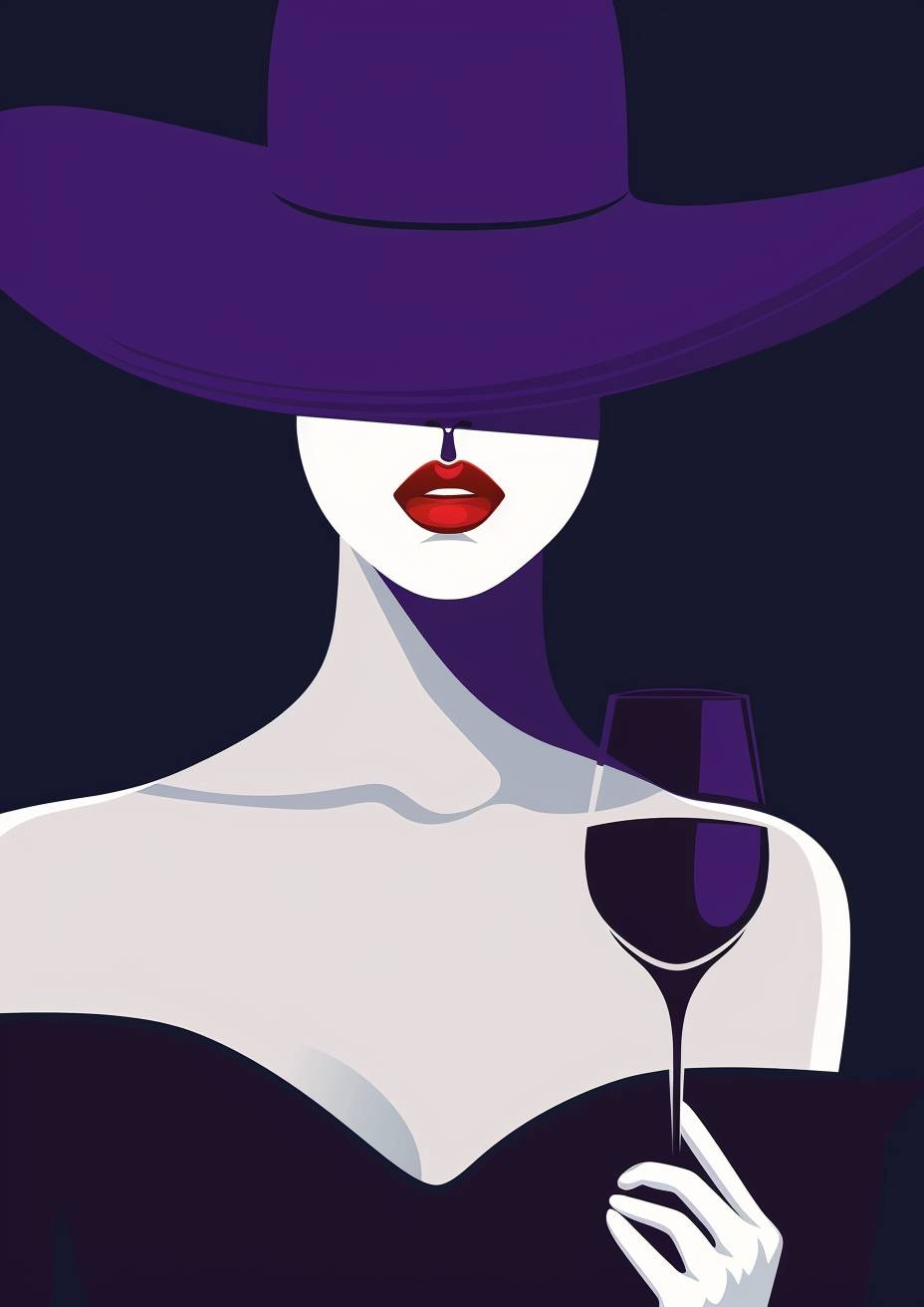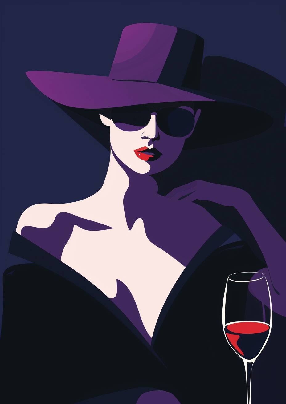 一款极简主义海报设计,描绘了一位戴紫色帽子的神秘女性,她穿着黑色连衣裙,手持一杯红酒,背景为深蓝色,使用高清线条和大胆形状,受到复古时尚海报的启发。