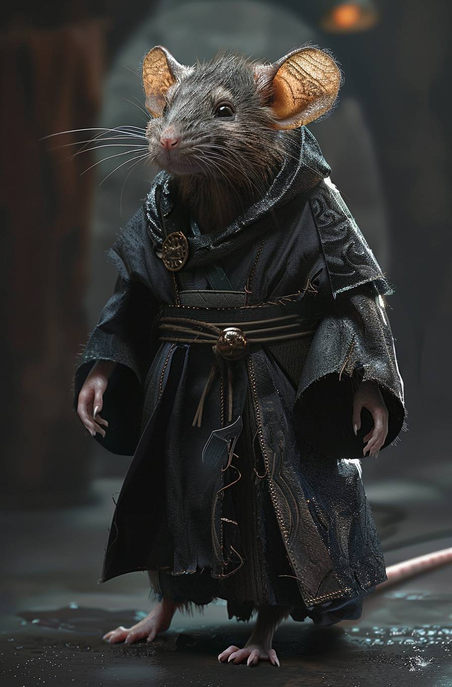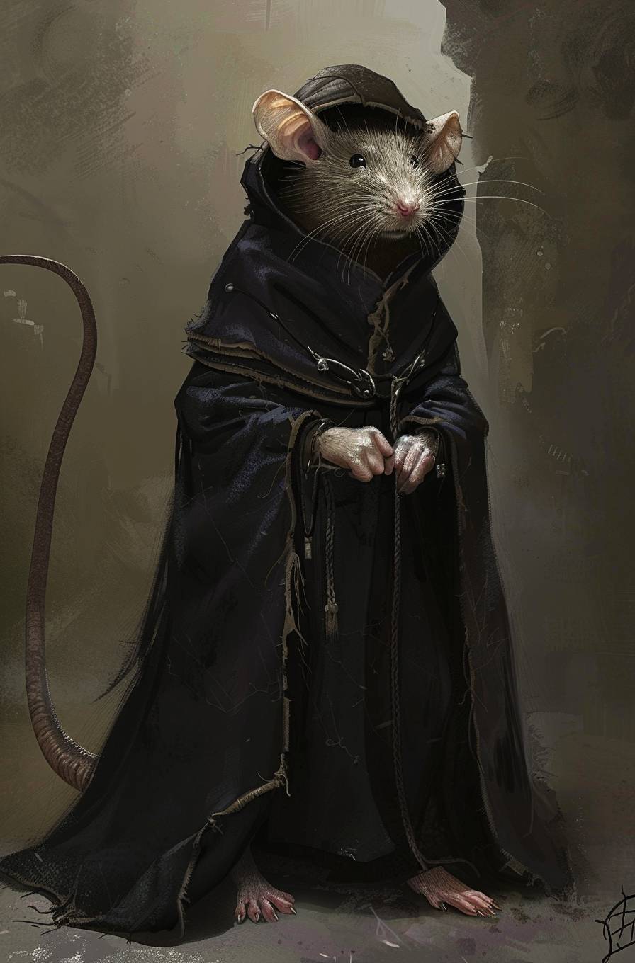 全身身穿黑袍的人形老鼠,幻想艺术风格。