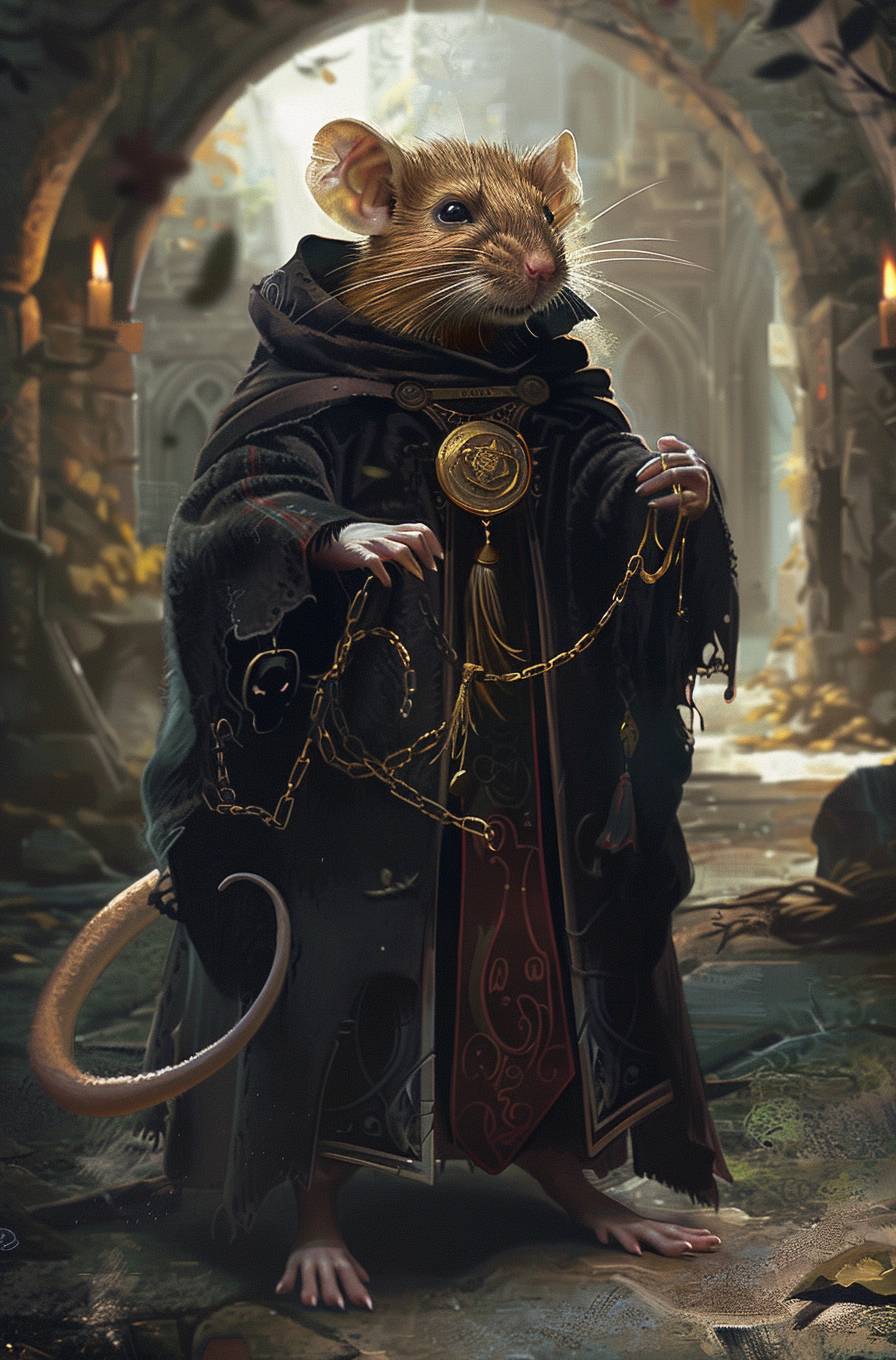 Anthropomorphic rat wearing black robe, ull body shot, fantasy art style --ar 41:62 --v 6.0