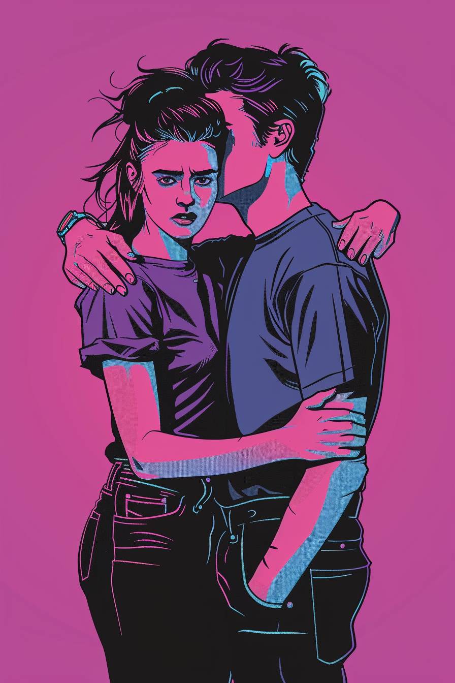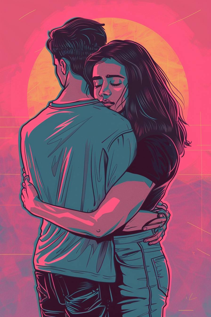 an intensely beautiful simple full body illustration of a woman with a serene look on her face hugging a man in the style of a 1980's tee shirt graphic design --ar 2:3 --stylize 50 --v 6.0