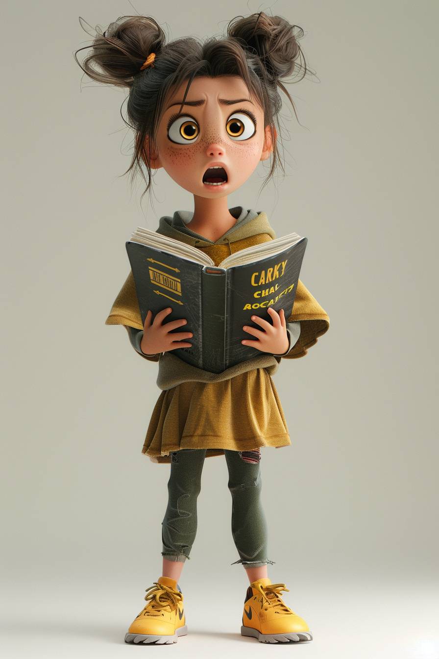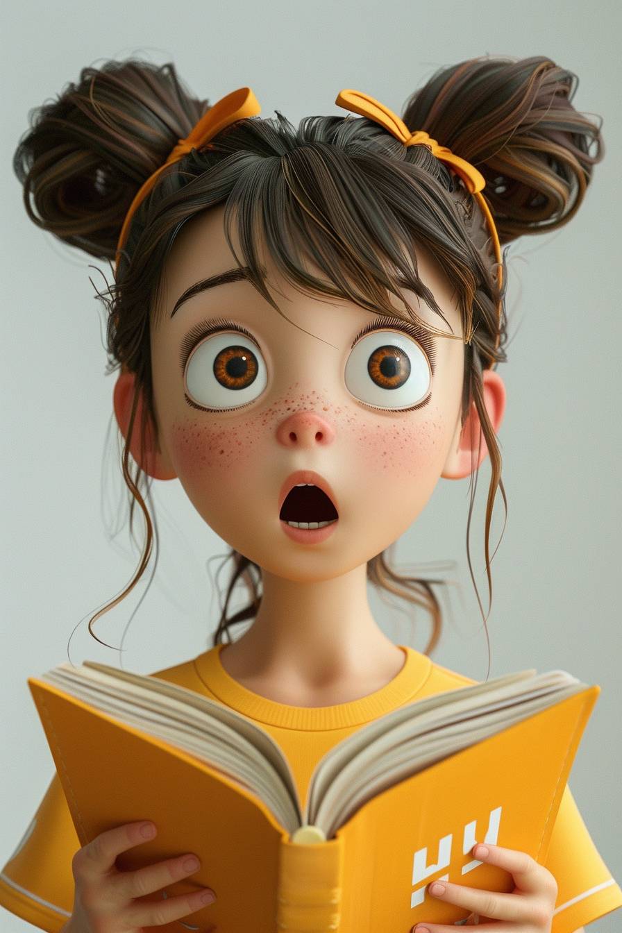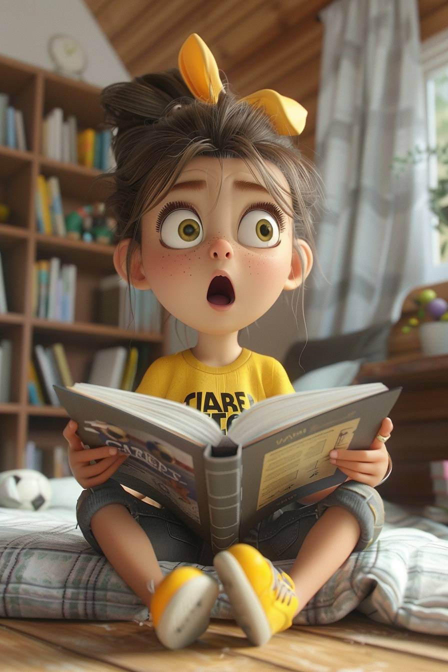 A girl named Clara wearing football t-shirt and yellow shoes, surprise expression, discovering something amazing in a book, 3d render, Pixar style --ar 2:3 --style raw --stylize 250 --v 6.0