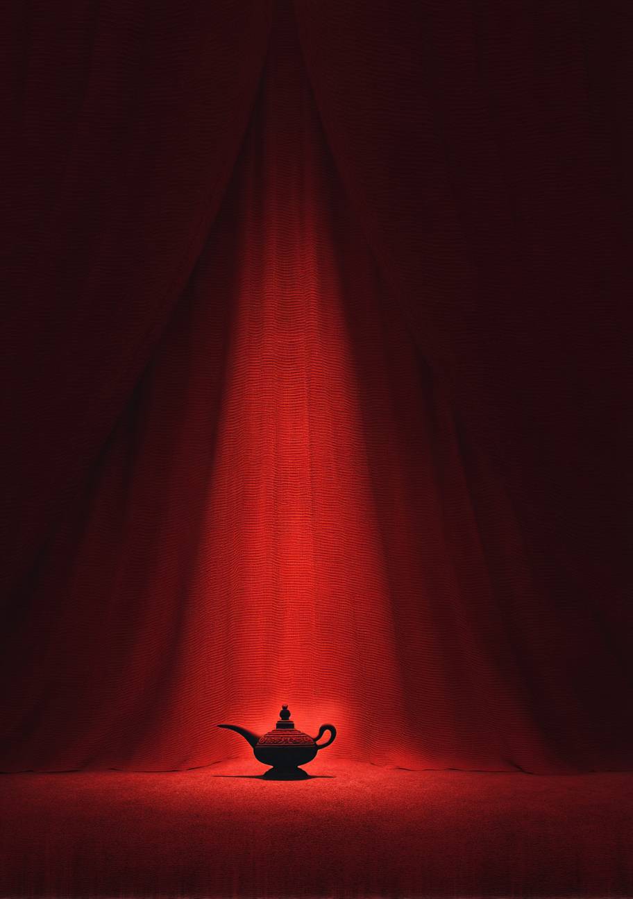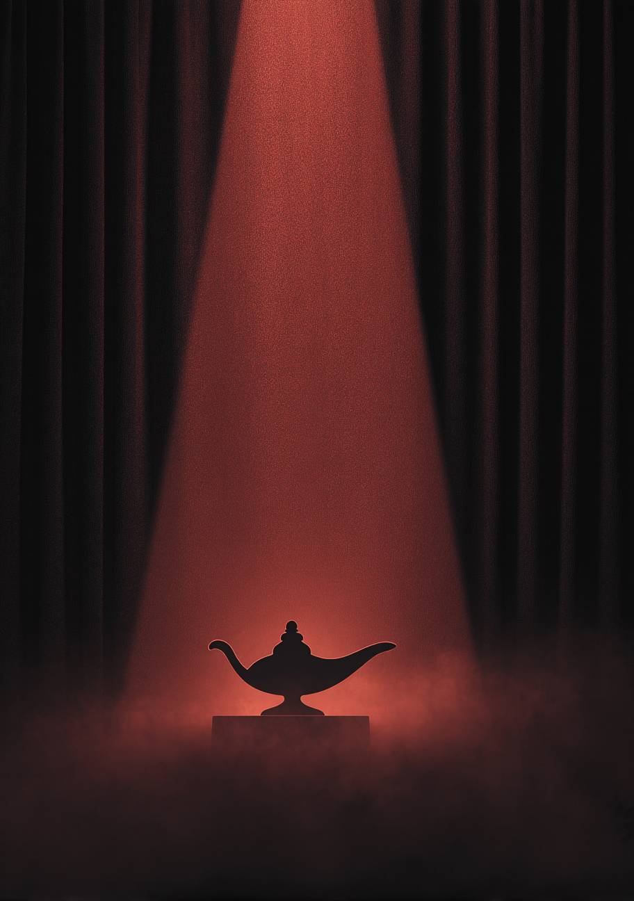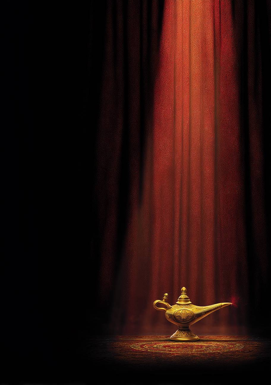 木偶剧节的海报,单色背景,图像的重点是阿拉丁的神灯,电影灯光效果。