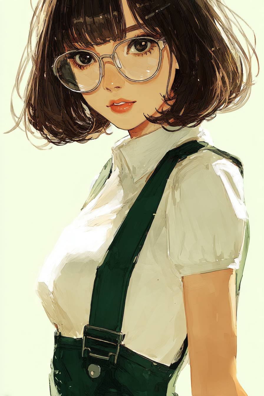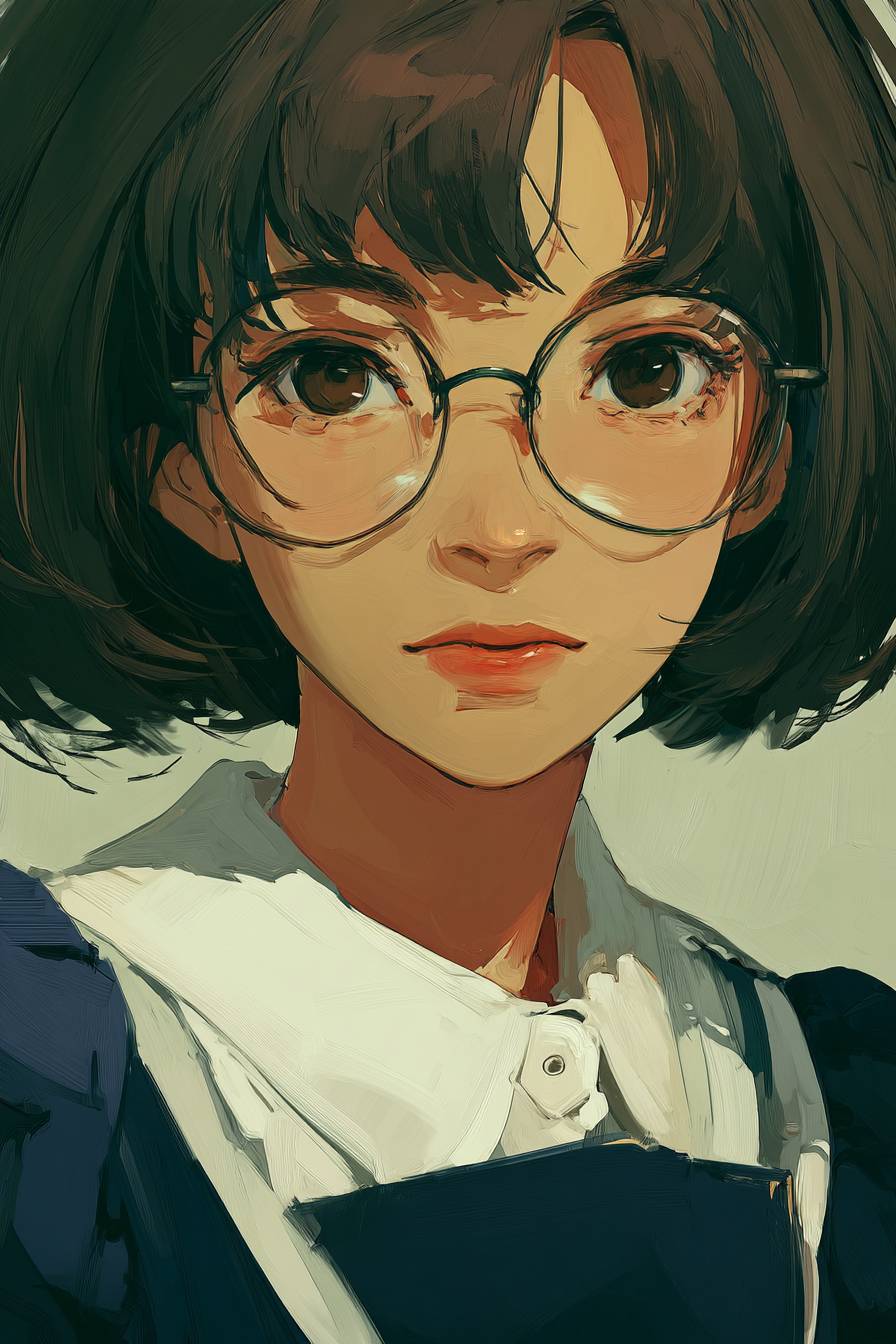 女孩戴圆眼镜,穿先锋制服,短发,半写实风格