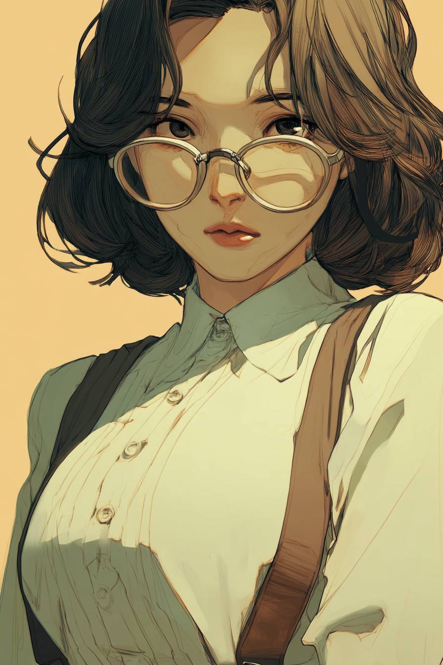 女孩,圆形眼镜,先锋制服,波波头,柔和,半现实主义风格,漫画