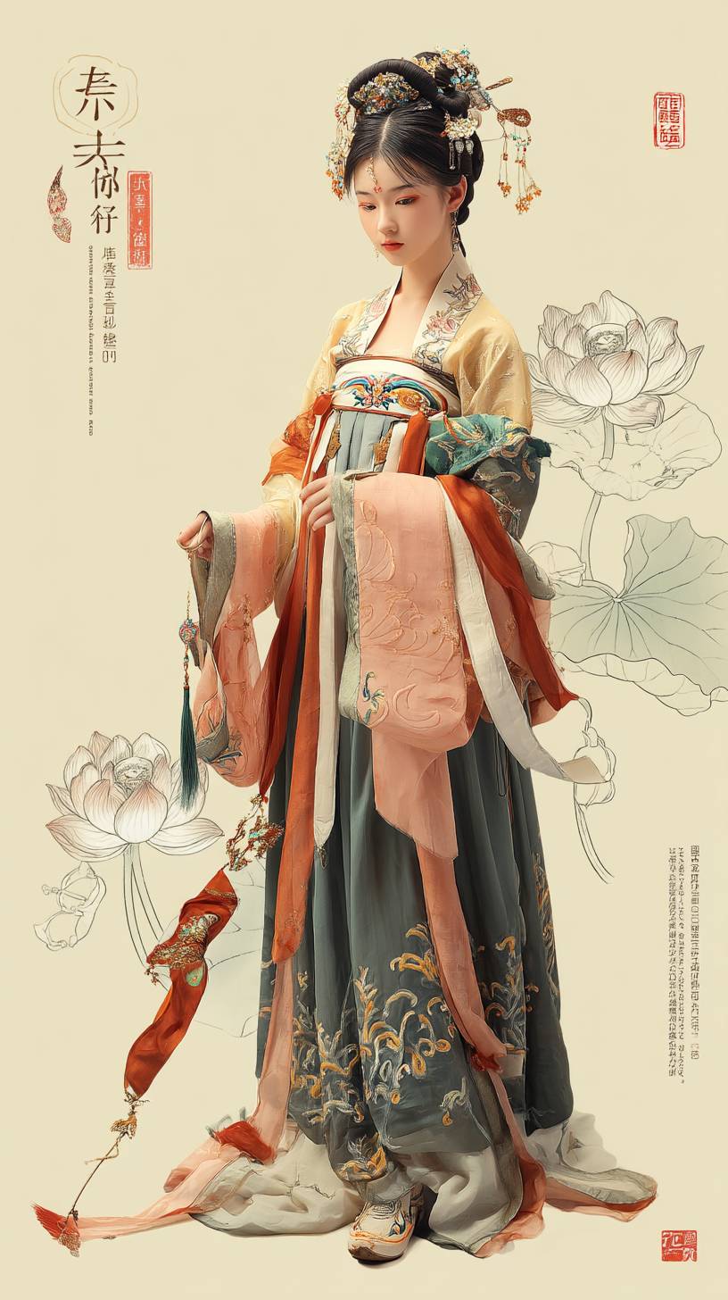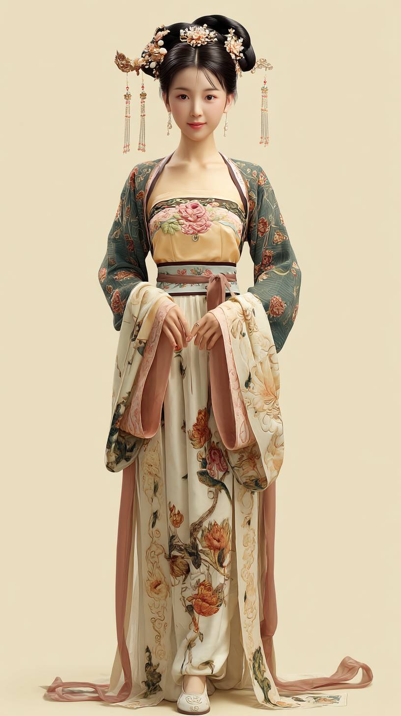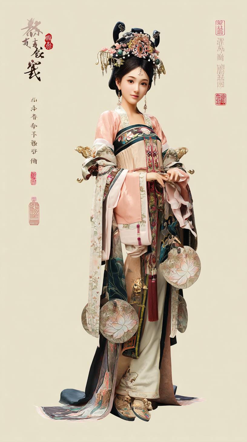 工笔风格的古代美人,高高的发髻上饰有珍珠和玉饰的发饰,全身正面立 portrait,细长的眉毛和含情的眼睛,云朵般的发型搭配玉簪,淡粉色交领襦裙搭配莲藕色,精致的衣物图案和华美的刺绣,站在古风庭院中,双手自然下垂,双脚并立,矿物颜料层叠染色,衣物褶皱用铁丝描绘,背景纯净,米色背景。