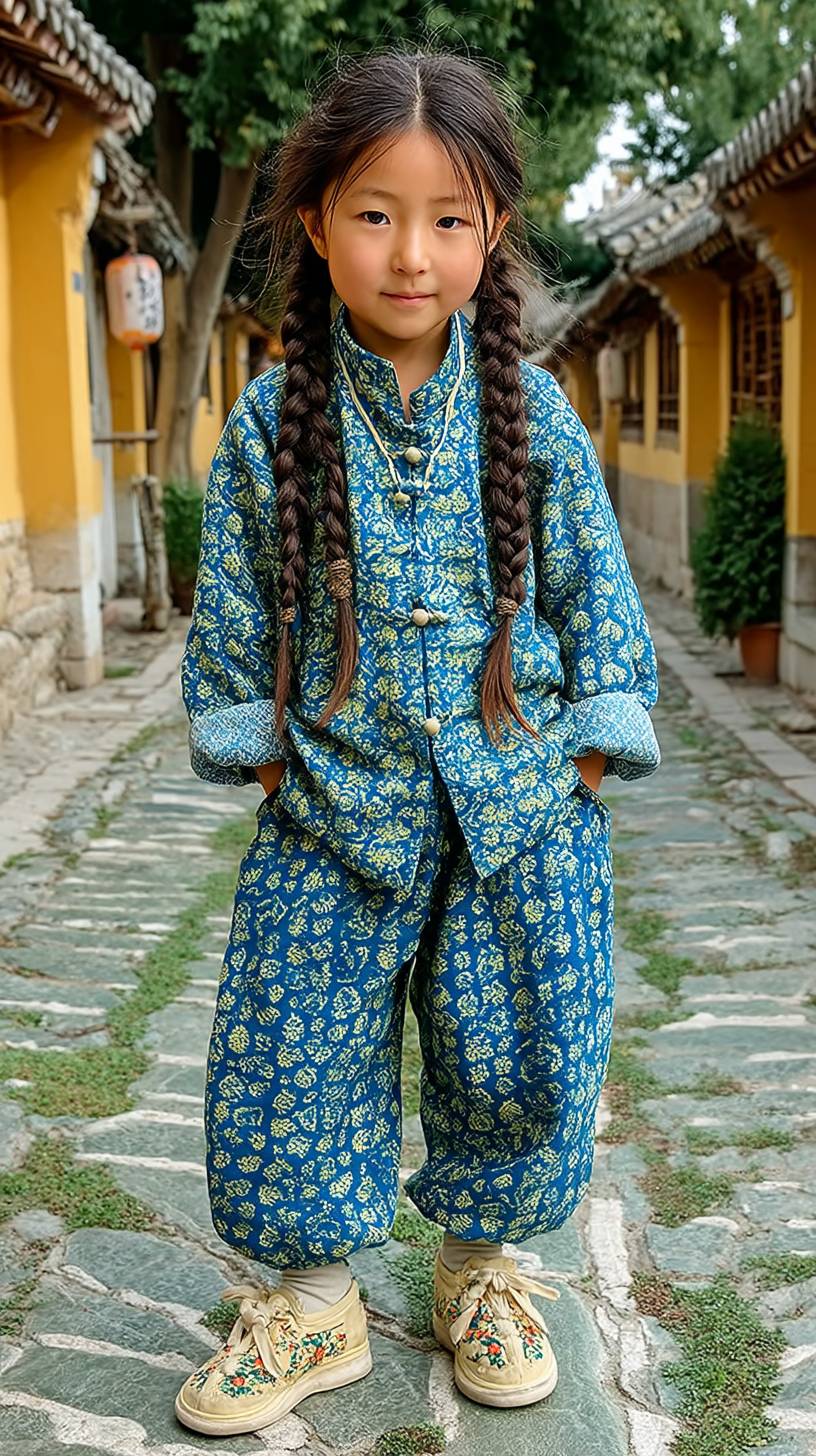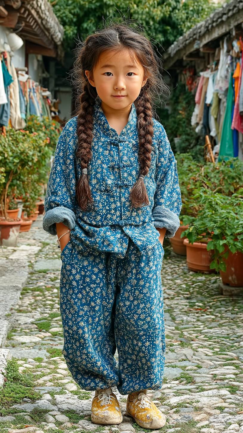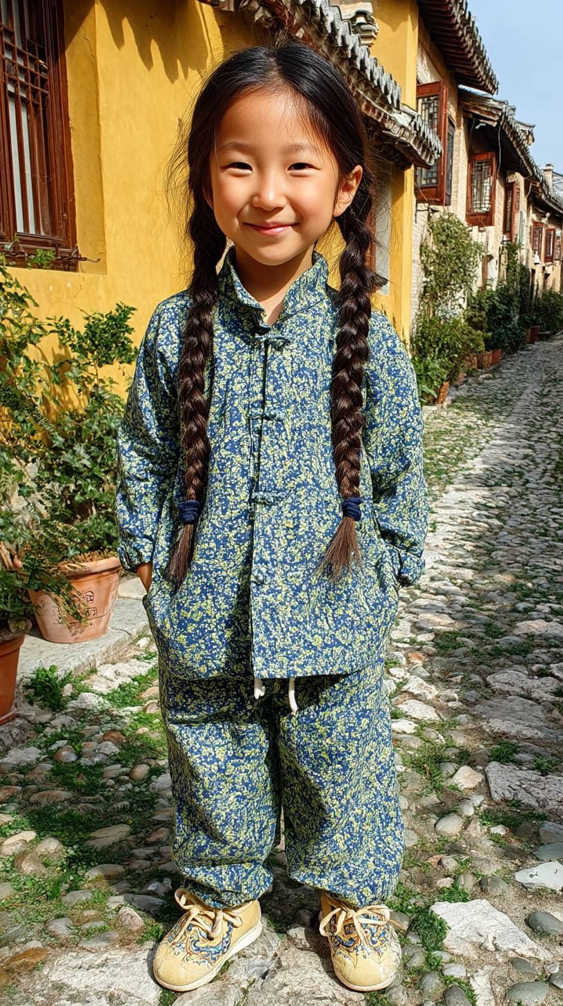 五岁中国女孩,正面全身,圆脸自然带红晕,深棕色杏仁眼流露出天真,黑色双辫稍显蓬松,鼻尖散布着淡淡的雀斑,穿着靛蓝印花的棉质衬衫和裤子,脚踩刺绣布鞋,温暖的冬日阳光洒在绿石路上。