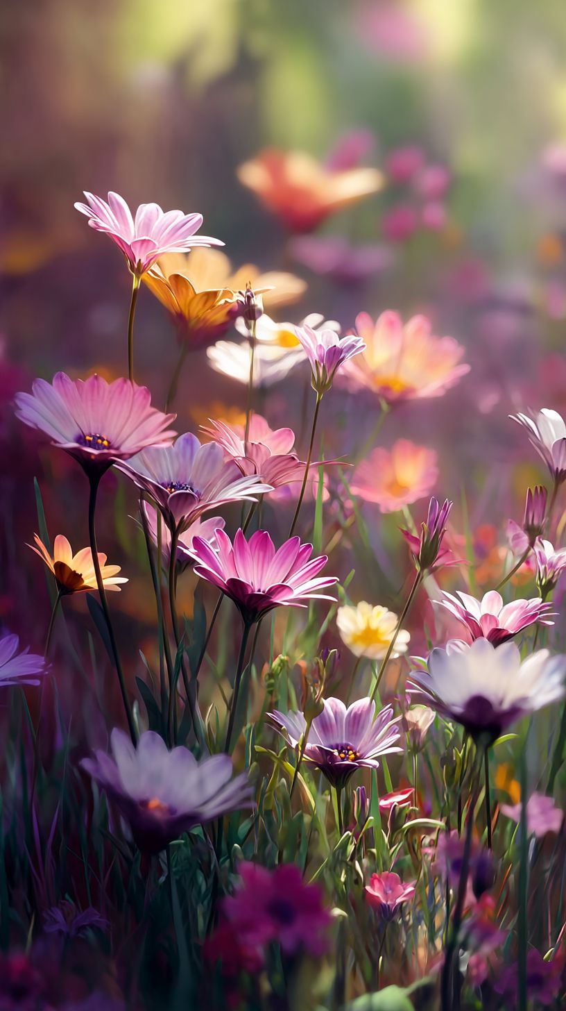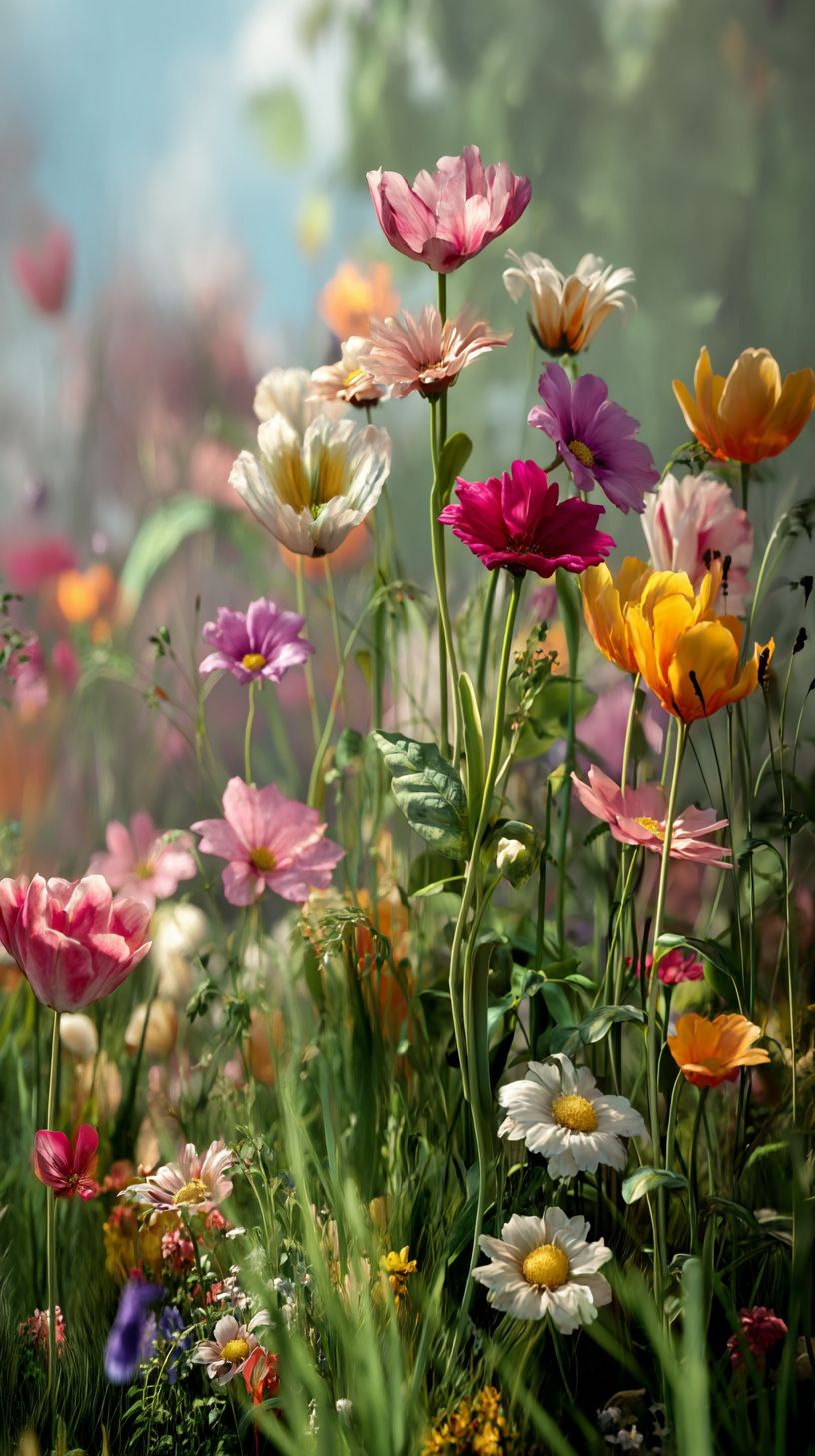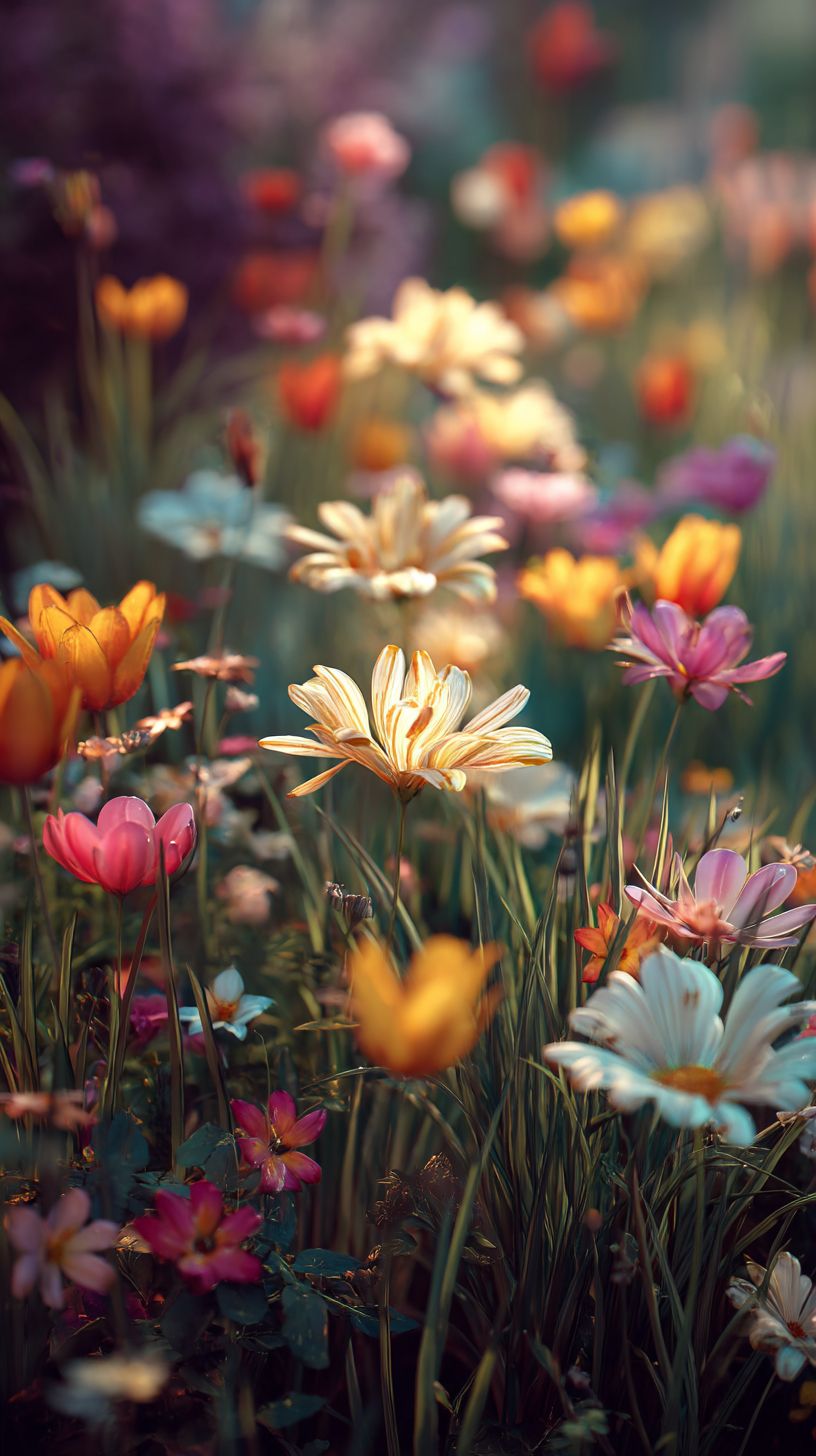 soft flower garden in full bloom, variety of colorful flowers including daisies, tulips, and wildflowers, lush green grass, warm ambient light, gentle breeze effect on petals, slightly dreamy and ethereal atmosphere, shallow depth of field, realistic and highly detailed --ar 9:16 --v 7.0