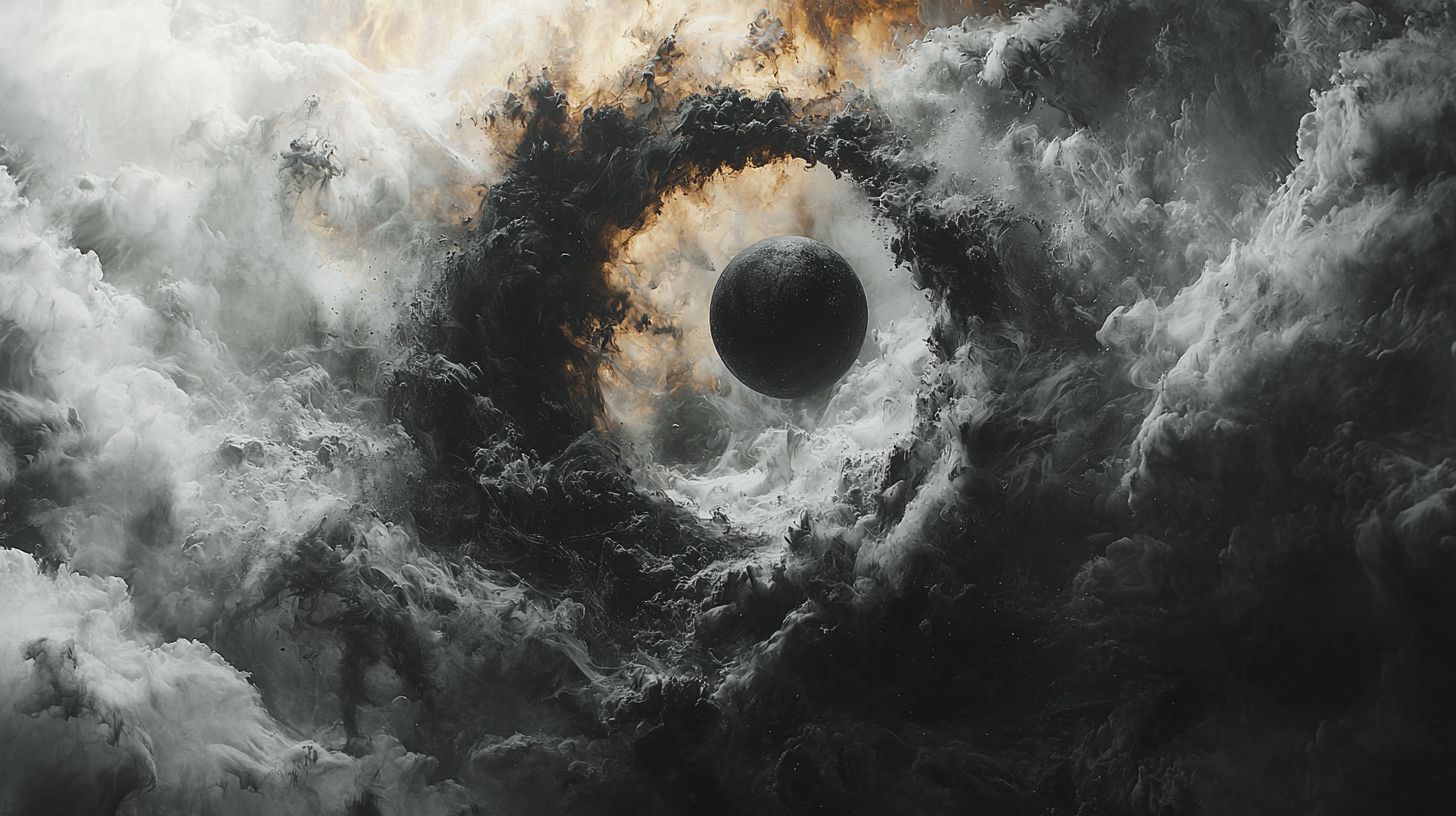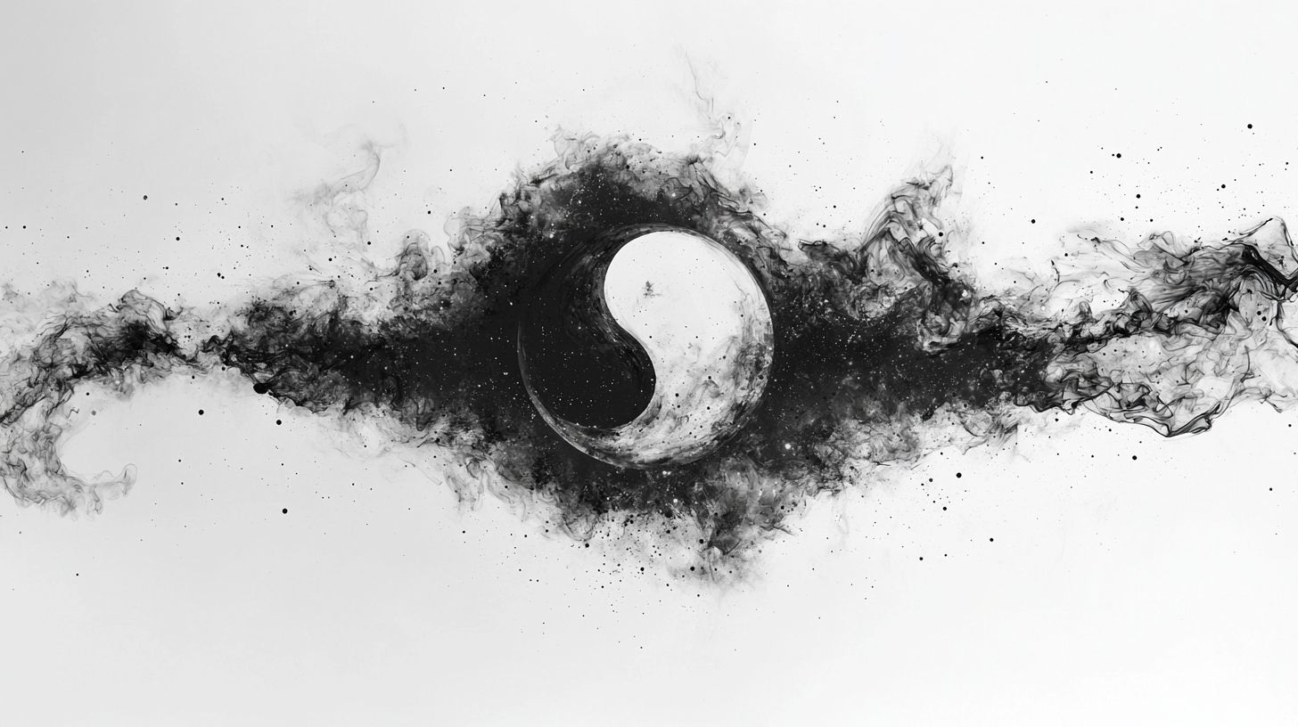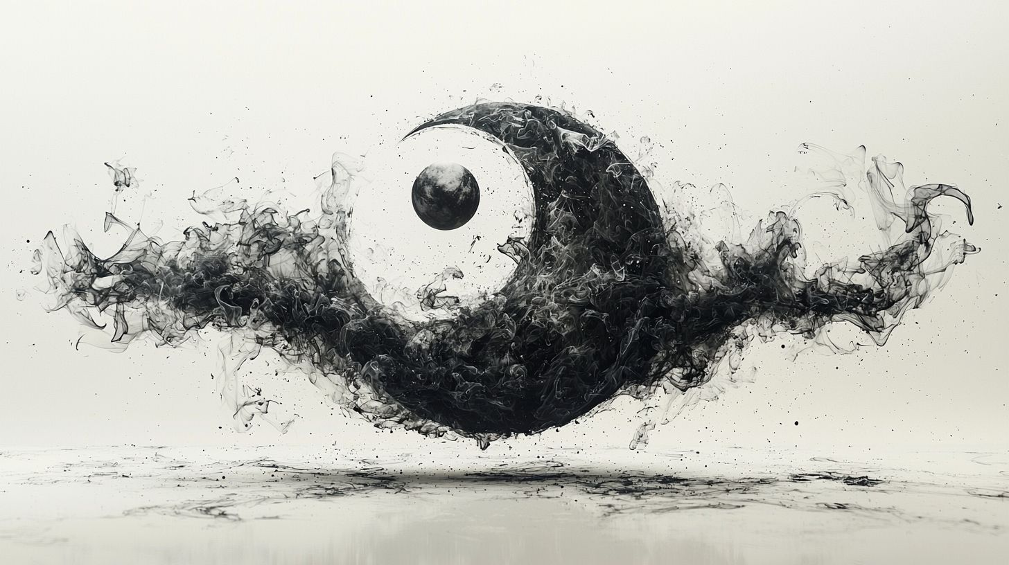 阴阳符号在空虚中旋转,墨云形成太极图,极简黑白风格。