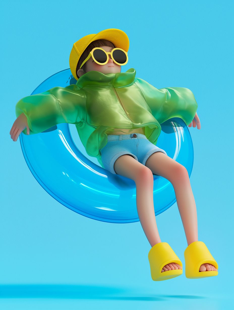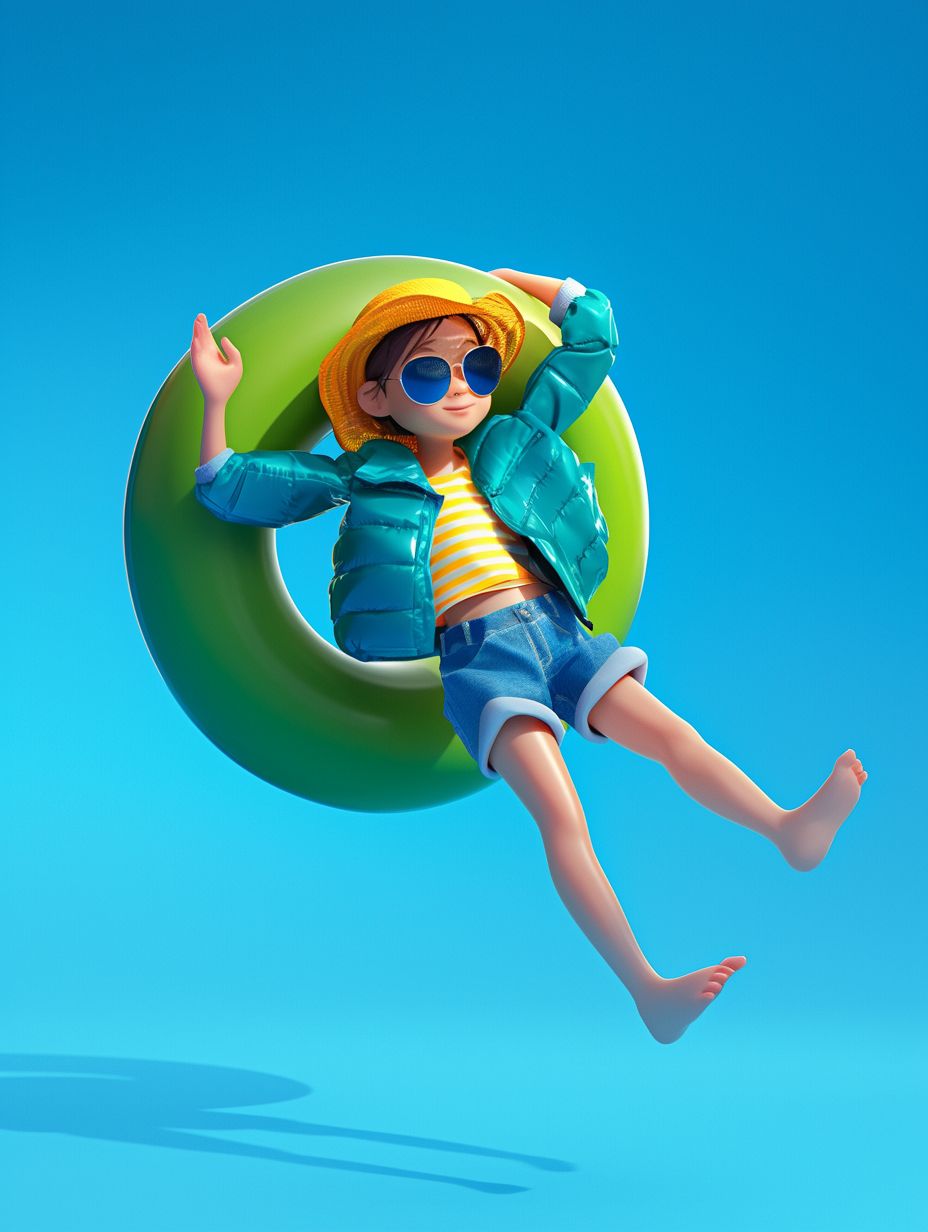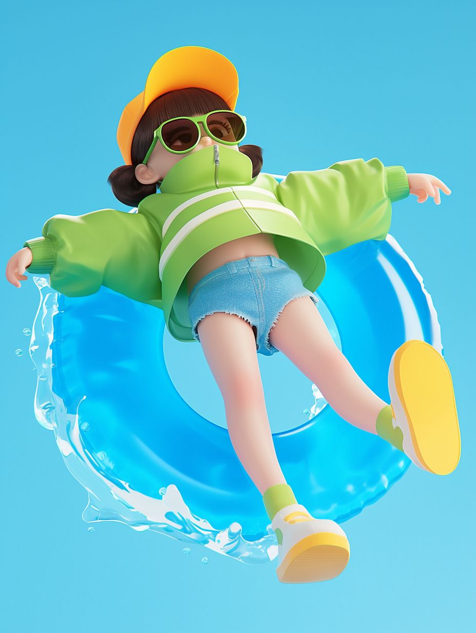 A cute little girl wearing shorts and a green jacket, floating in the air on an inflatable ring against a blue background, wearing a yellow hat with sunglasses on top, brightly colored, full body shot. Cartoon characters, Pixar animations, and Disney blind box toy design. High definition rendering, 3D modeling, and bright studio lighting --ar 3:4 --niji 6 --raw