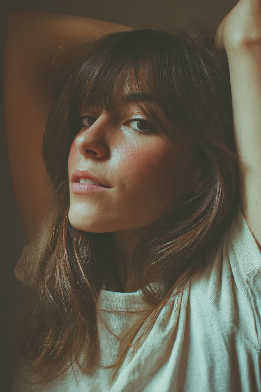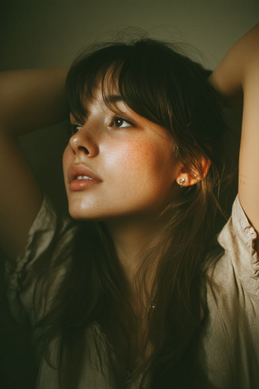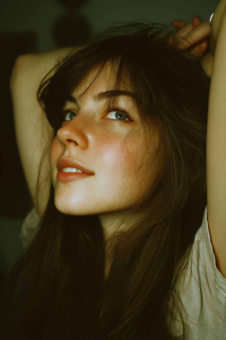 portrait of a beautiful spanish young woman, natural lighting, soft focus, vintage film look, slight odd smile, cozy background, moody atmosphere, pastel tones, reflective mood, inspired by music, heartbreak and healing, cinematic lighting, iphone, flash photo, nostalgic, snapshot, slightly flushed cheeks. Big, clear eyes with a dreamy gaze. Long layered brown hair with a natural shine, softly framing the face. Slightly open mouth and a tilted angle that captures a casual yet ethereal vibe.s. Natural lighting, soft shadows, realistic smartphone camera effect. Close-up portrait with a gentle and mysterious mood. a candid side-profile shot taken while she’s looking away and she is with very short sleeve raising her hands to put them behind her head. --ar 2:3 --v 7.0 --raw
