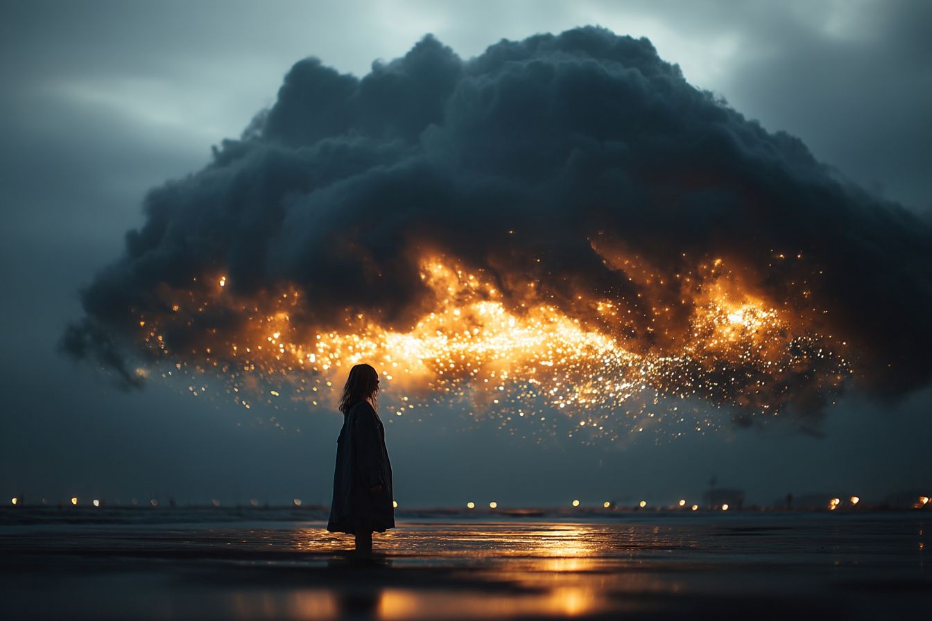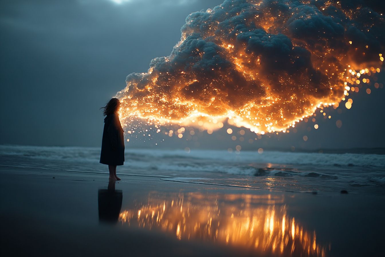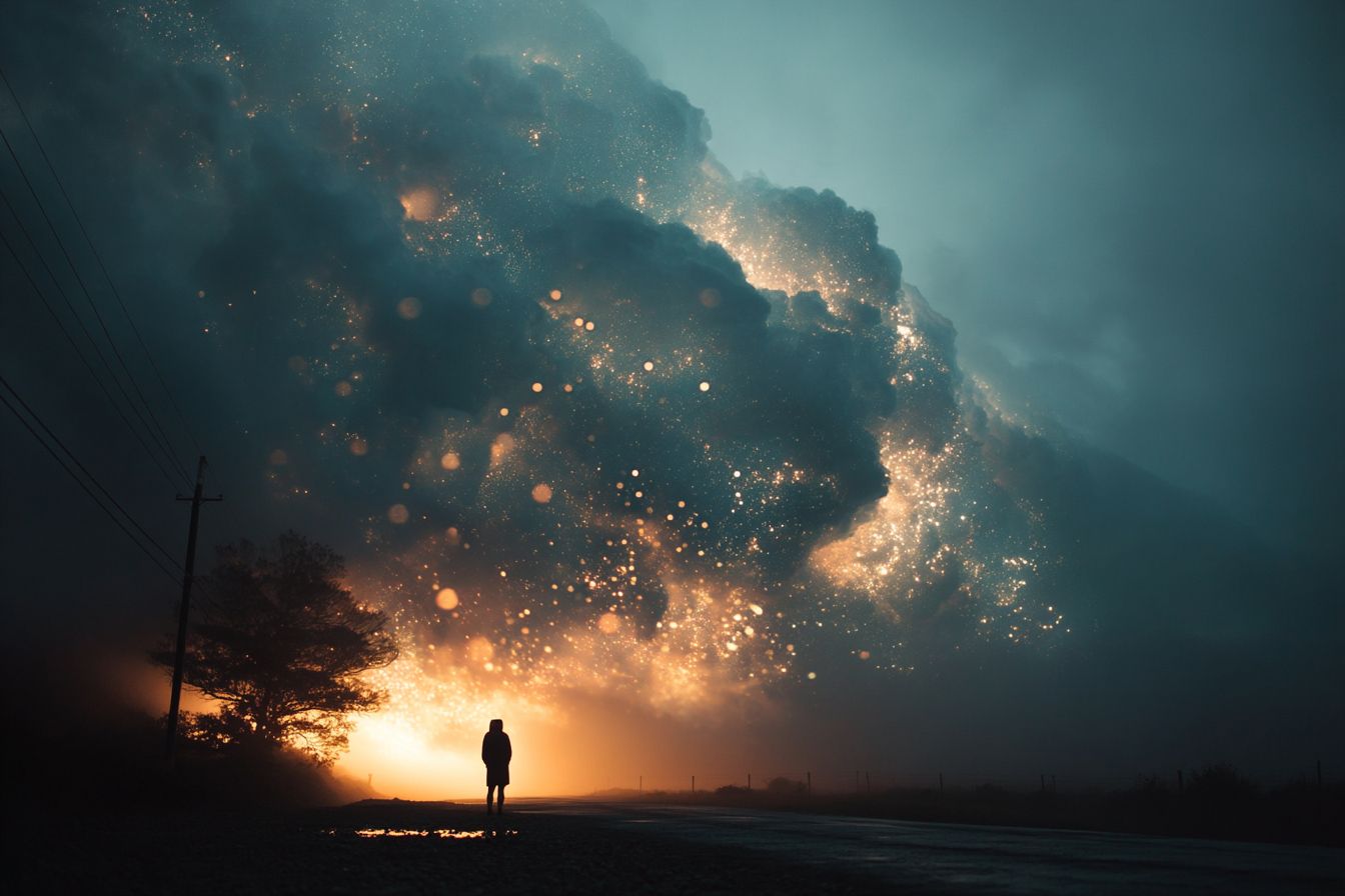 天上漂浮着异世界的云朵,内部闪烁着光芒,这朵云与地面上的一个人相连,呈现出天空的火焰,舞动着虚化效果,令人难以置信的电影感。