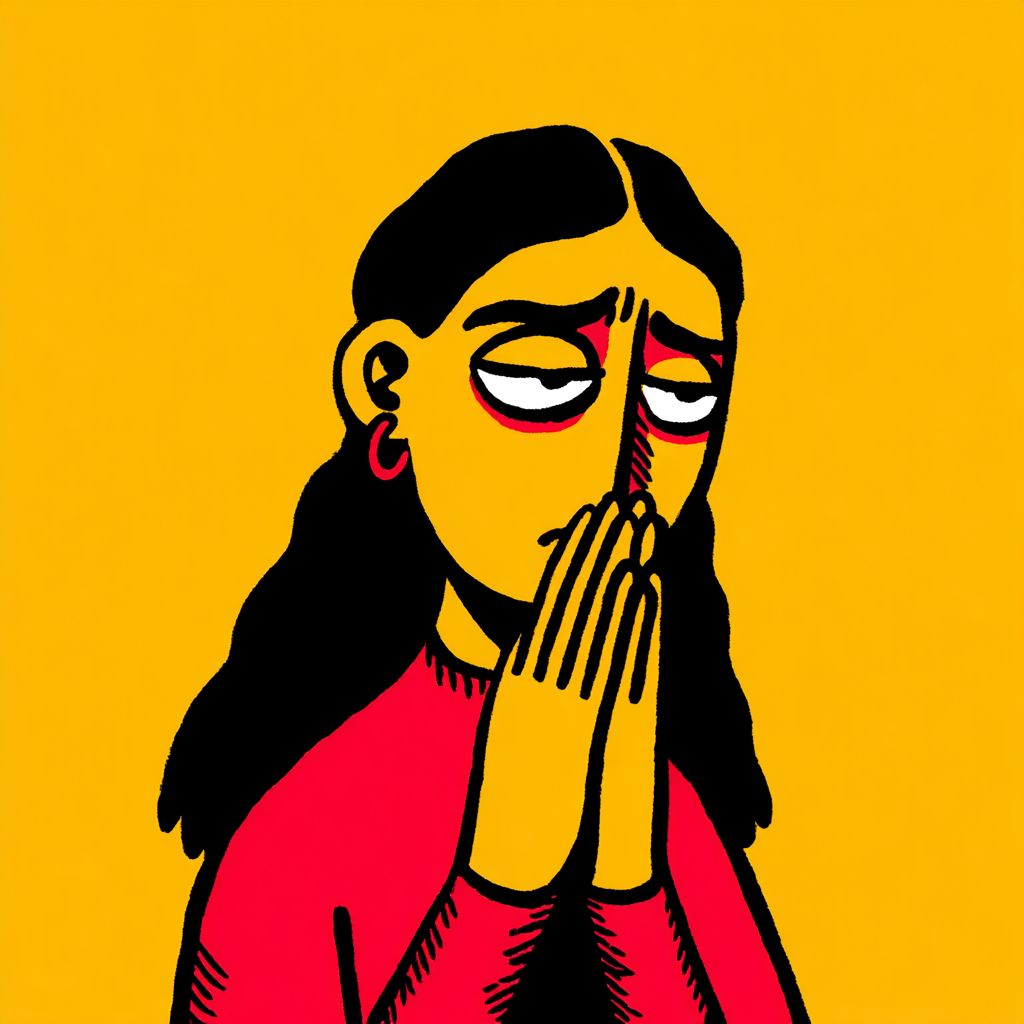一位女性似乎在祈祷。她的左眼闭合,右眼微微睁开,脸上露出一丝困扰的表情。卡通风格。