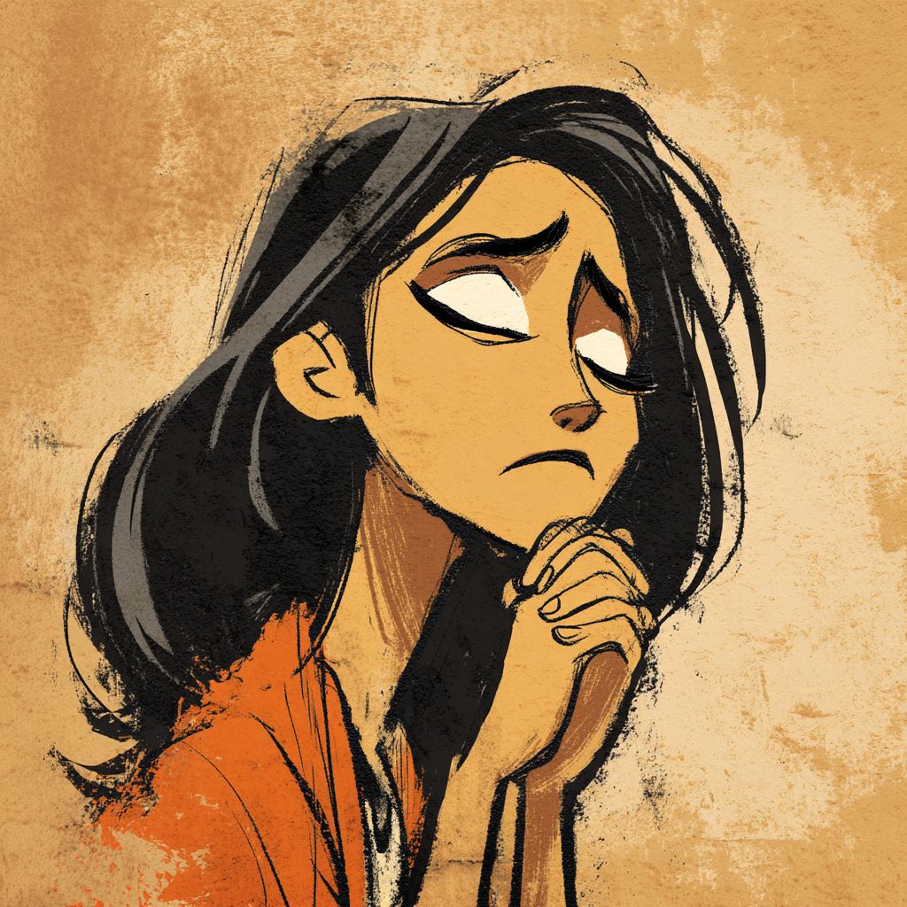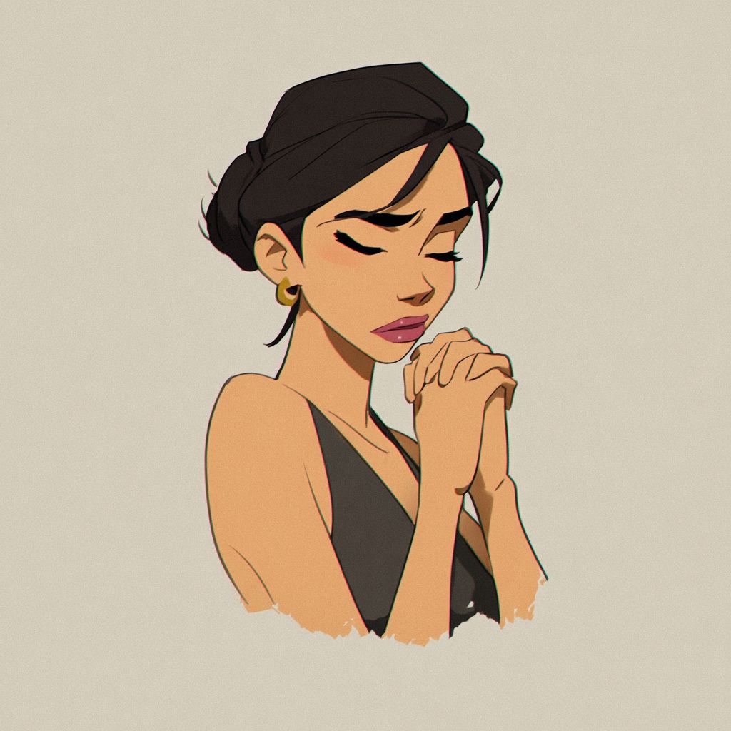 A woman appears to be praying. Her left eye is closed, and her right eye is slightly open. A grimace that seems to be troubled. cartoon style --v 7.0