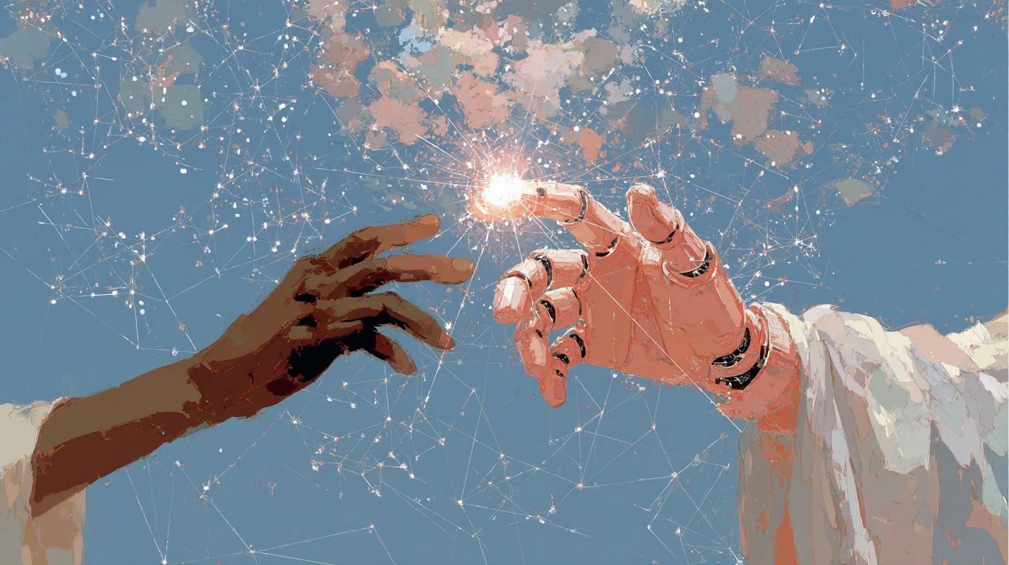 人类手与机器人手温柔相连,二者间闪烁着光芒