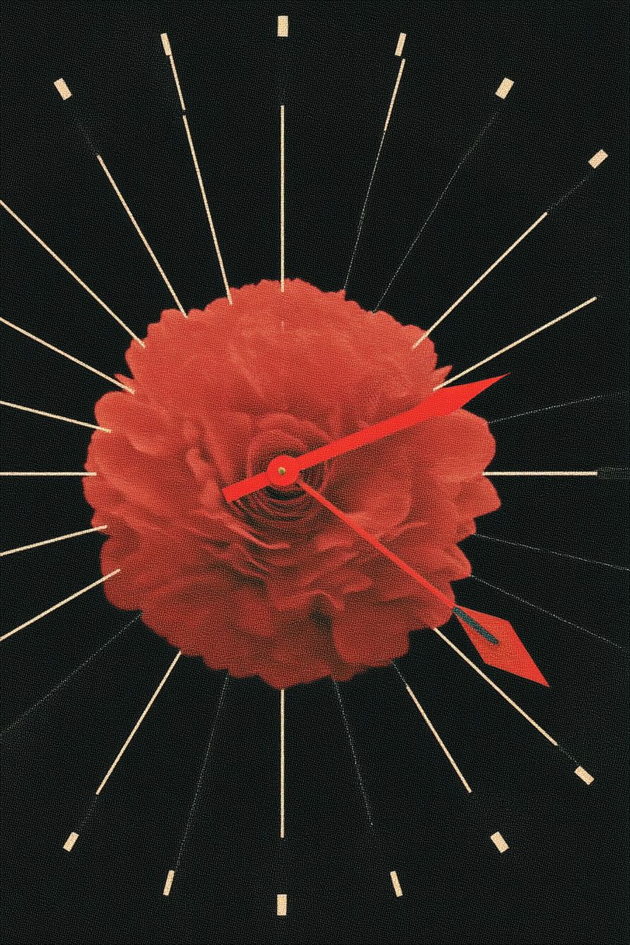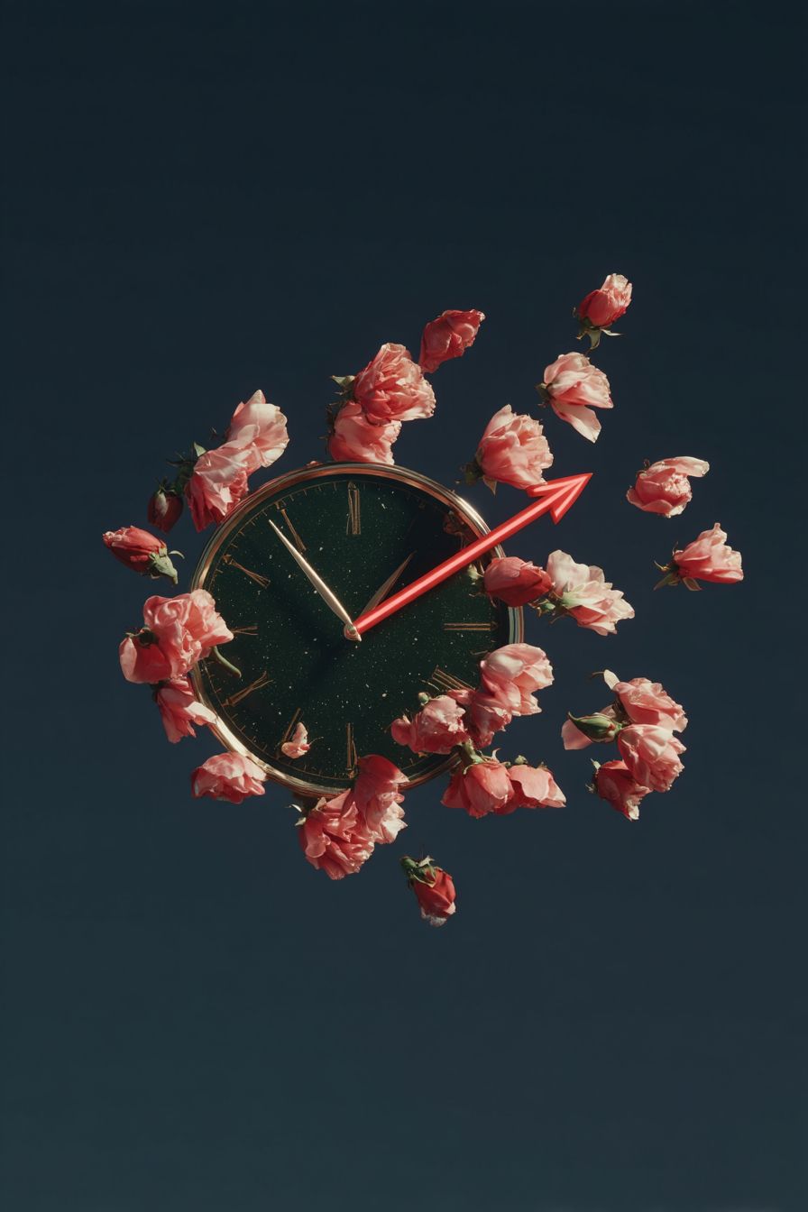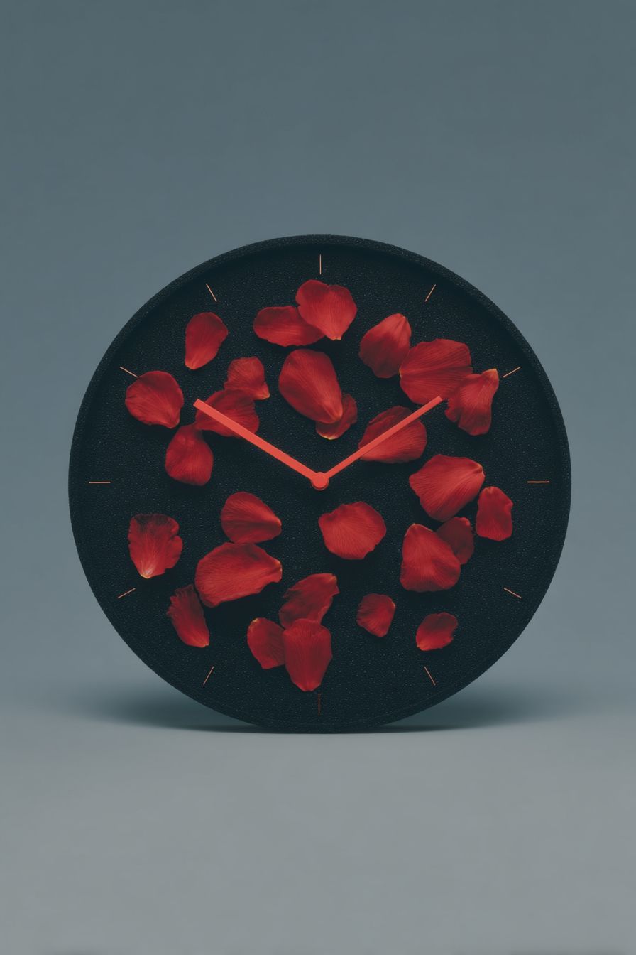 A classic wall clock pierced through the center by a bright red, heart-shaped arrow, vibrant red petals bursting outward as time stands still at midnight. --chaos 25 --ar 2:3 --quality 2 --profile mnbyj7d --stylize 1000 --v 7.0