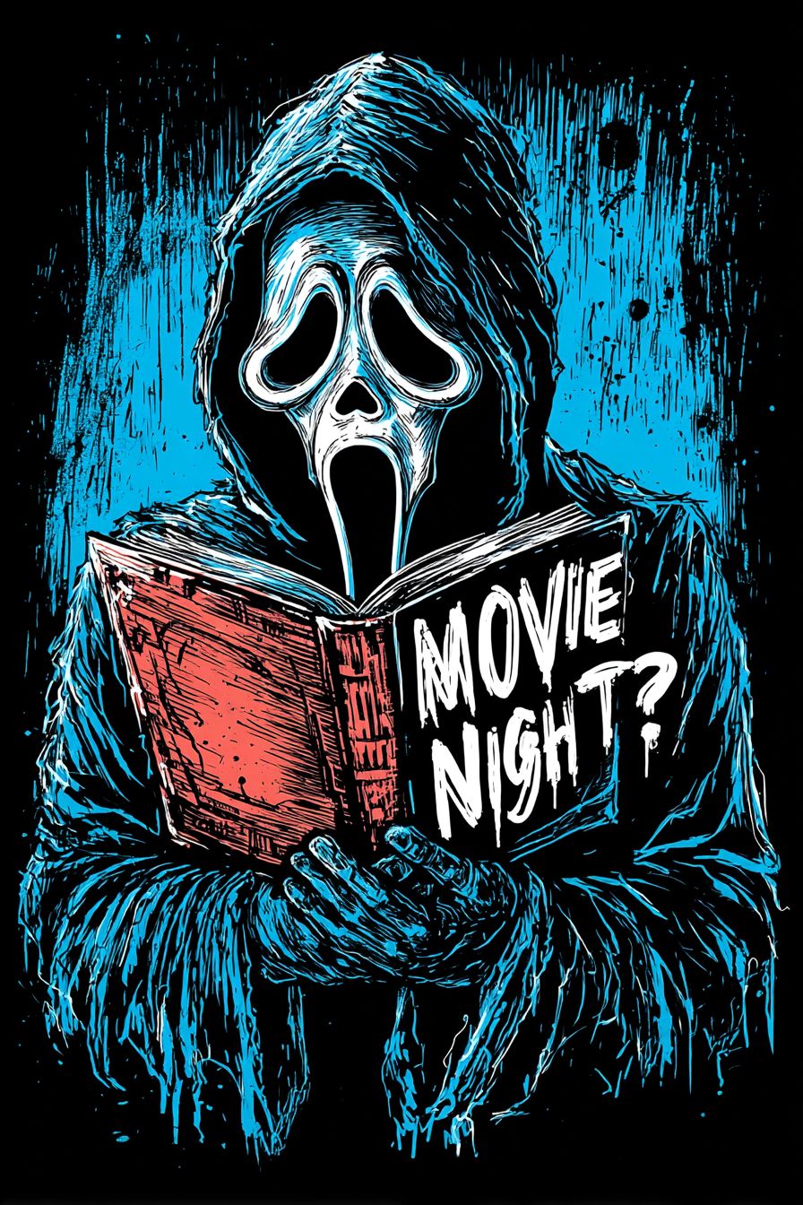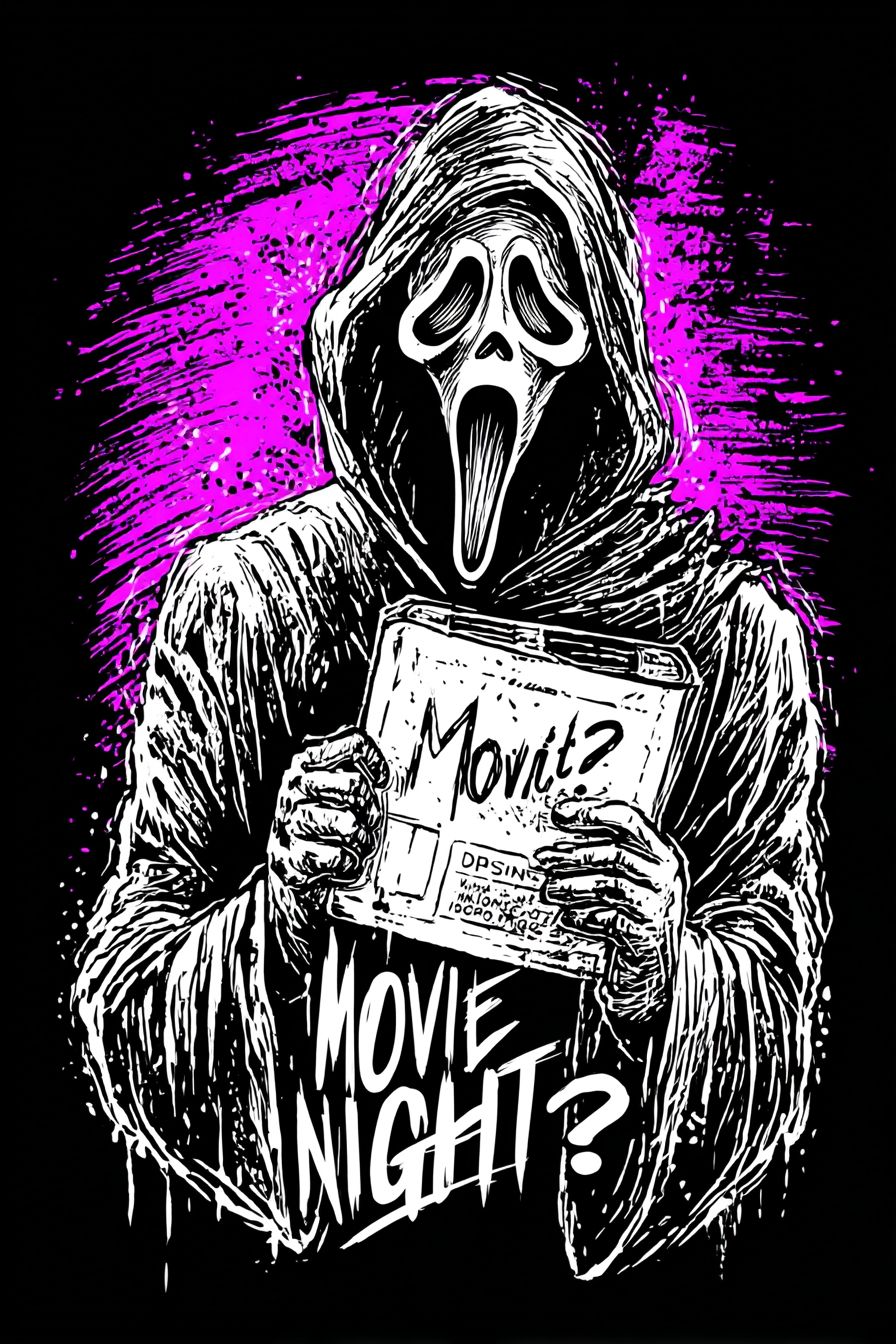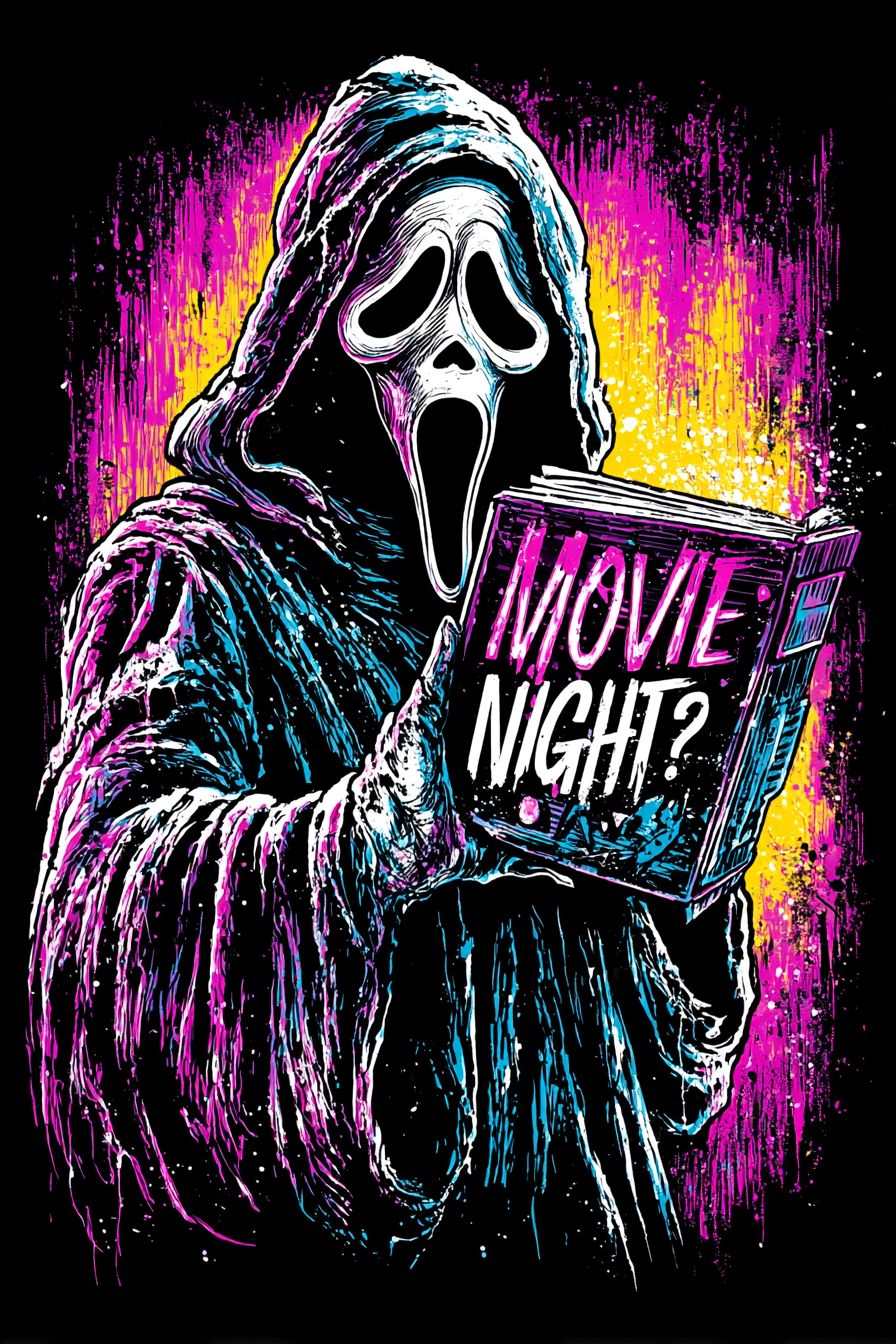 comic book cover of Ghostface from Scream holding a vhs tape with text reading "Movie Night?". In retro font, retro 1980s pulp horror, illustrated as a professional tshirt illustration, Stylized. Close attention to detail, very detailed, clean details. black background --chaos 8 --ar 2:3 --profile mp7k79i --stylize 456 --v 7.0