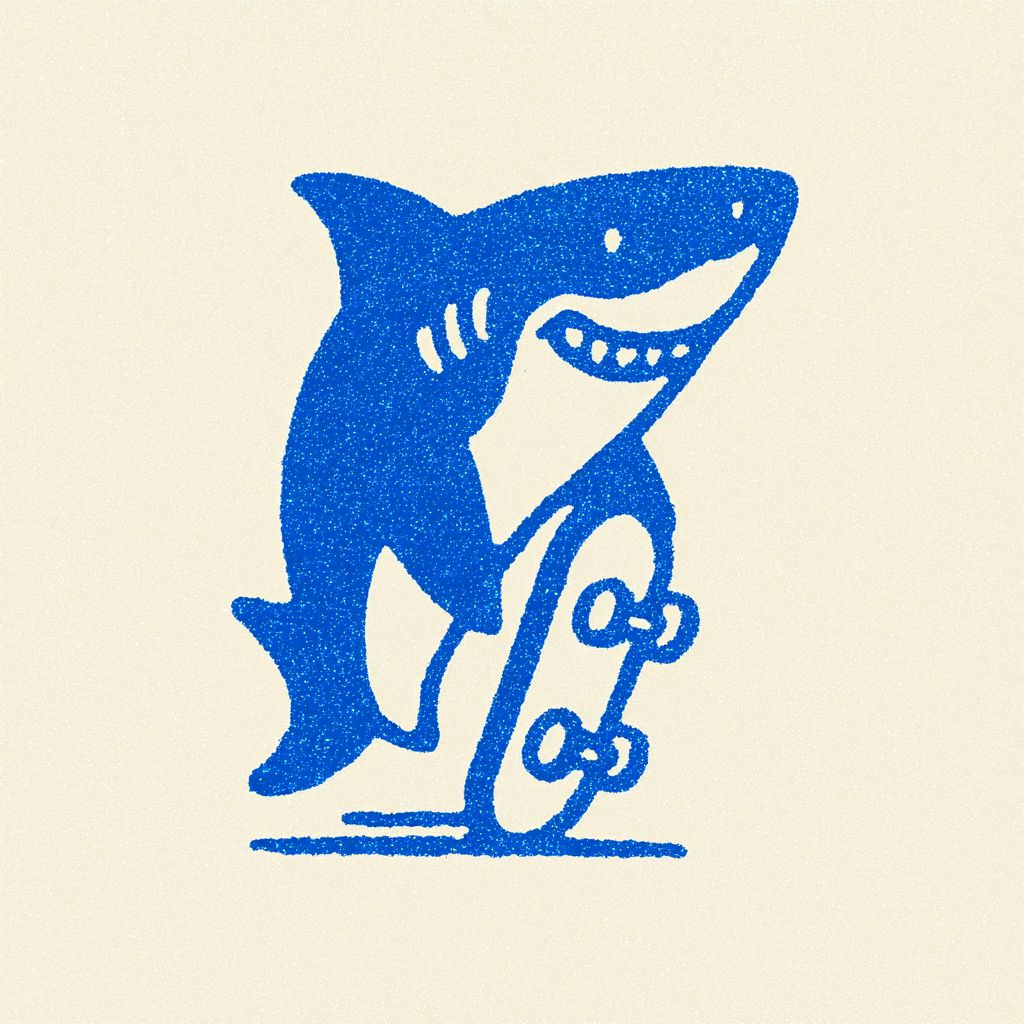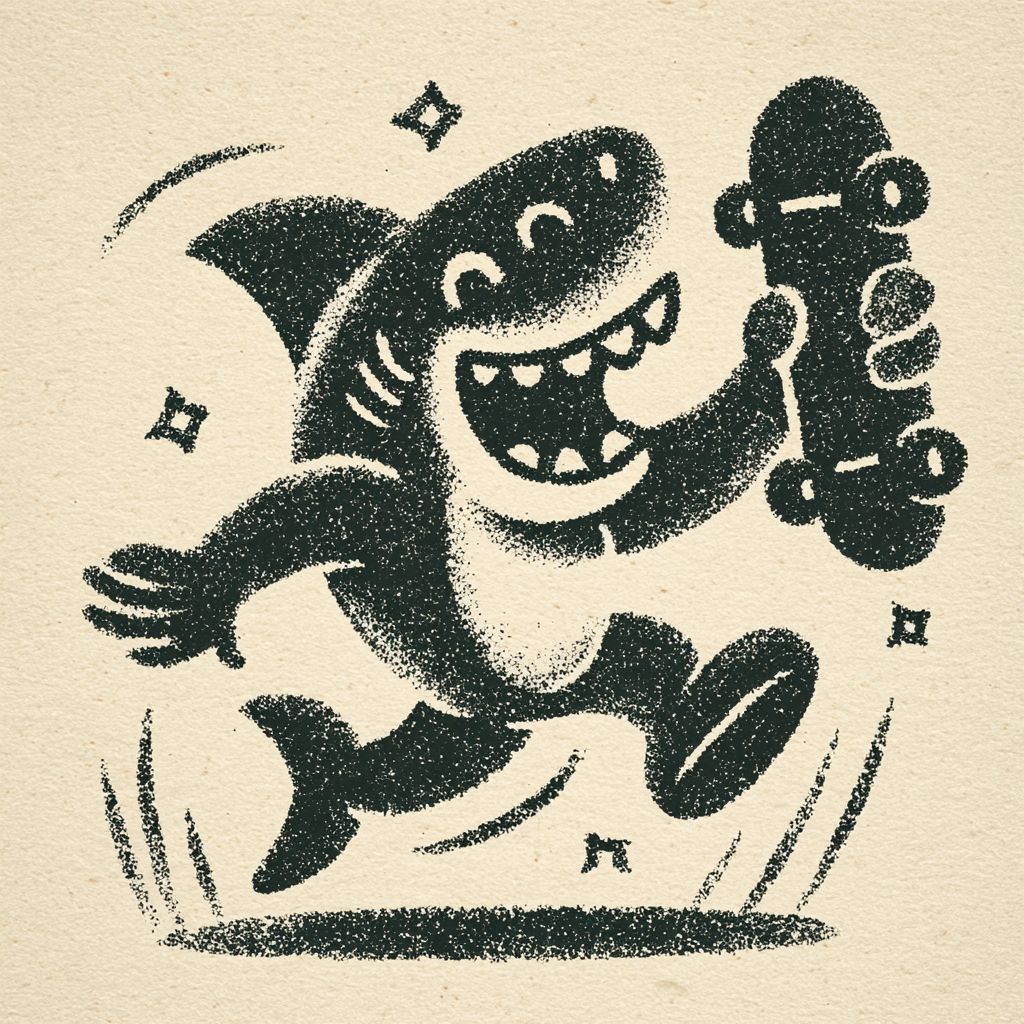 可爱的复古卡通吉祥物角色鲨鱼,采用1950年代丝网印刷风格,手里拿着一个破损的滑板。极度简化的形状,呆萌的比例,粗厚的轮廓,没有面部细节,只用点和曲线表示,单色墨水设计。风格类似于旧美国餐厅的标志。非常适合复古T恤印刷。乳白色背景。