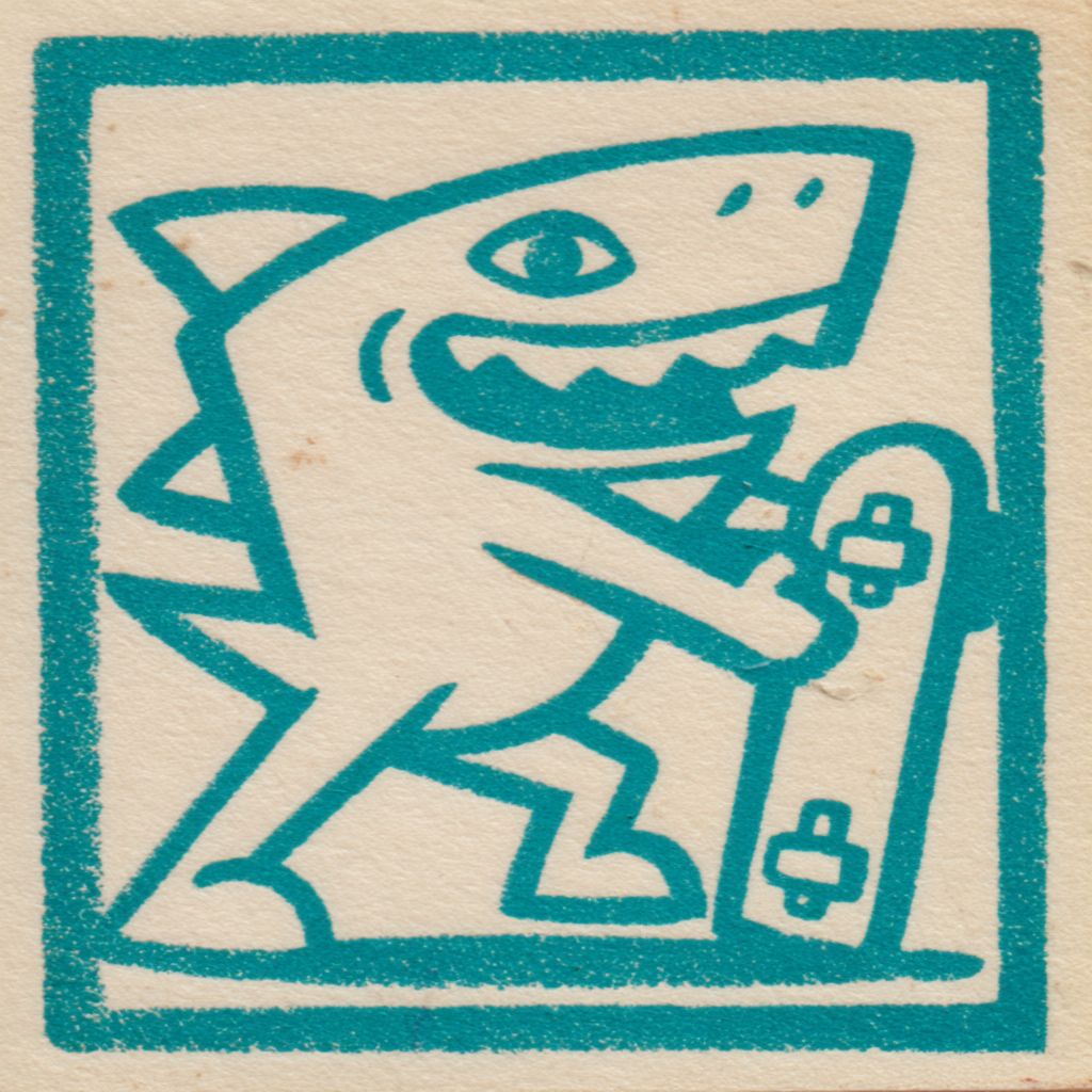 Cute vintage cartoon mascot character shark in 1950s screen print style, holding a broken skateboard Extremely simplified shapes, chibi-like proportions, thick outline, no facial detail beyond dots and curve lines, one-color ink design. In the style of old American diner logos. Perfect for retro T-shirt print. Off-white background. --chaos 40 --profile vg7y6ad --v 7.0