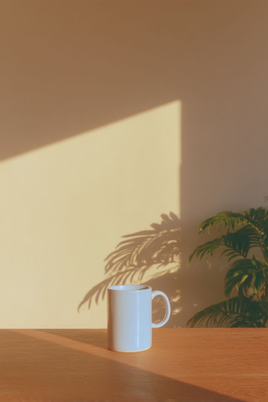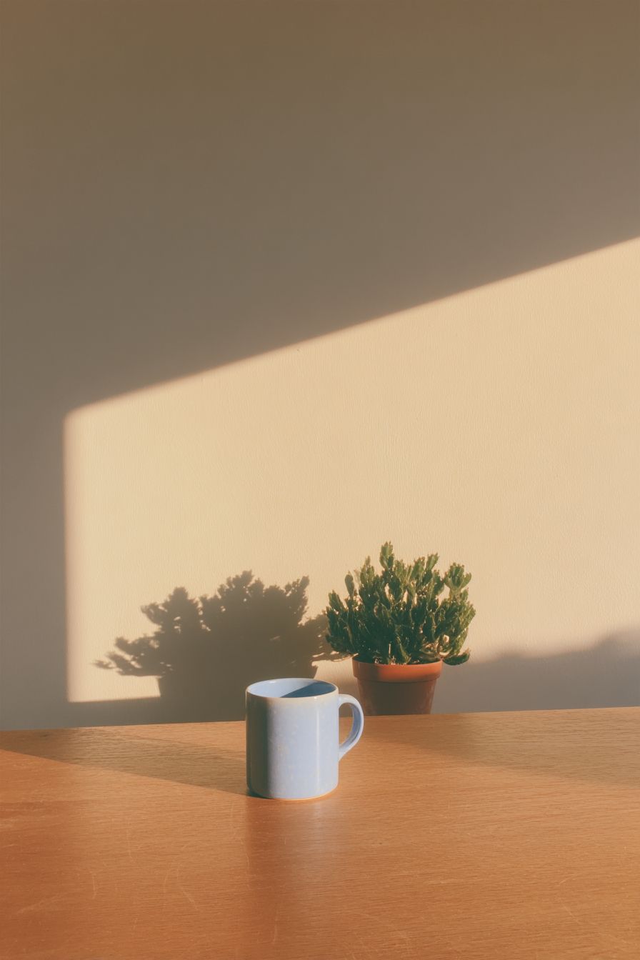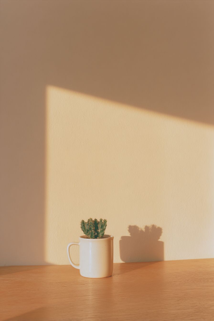 warm sunlight hitting a potted plant inside of a coffee mug on a wooden desk --ar 2:3 --raw --profile kccutk2 --stylize 750 --v 7.0