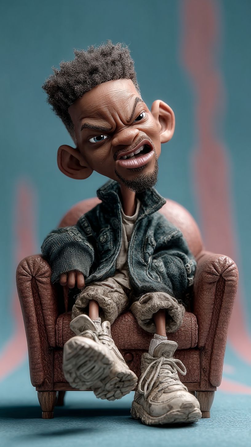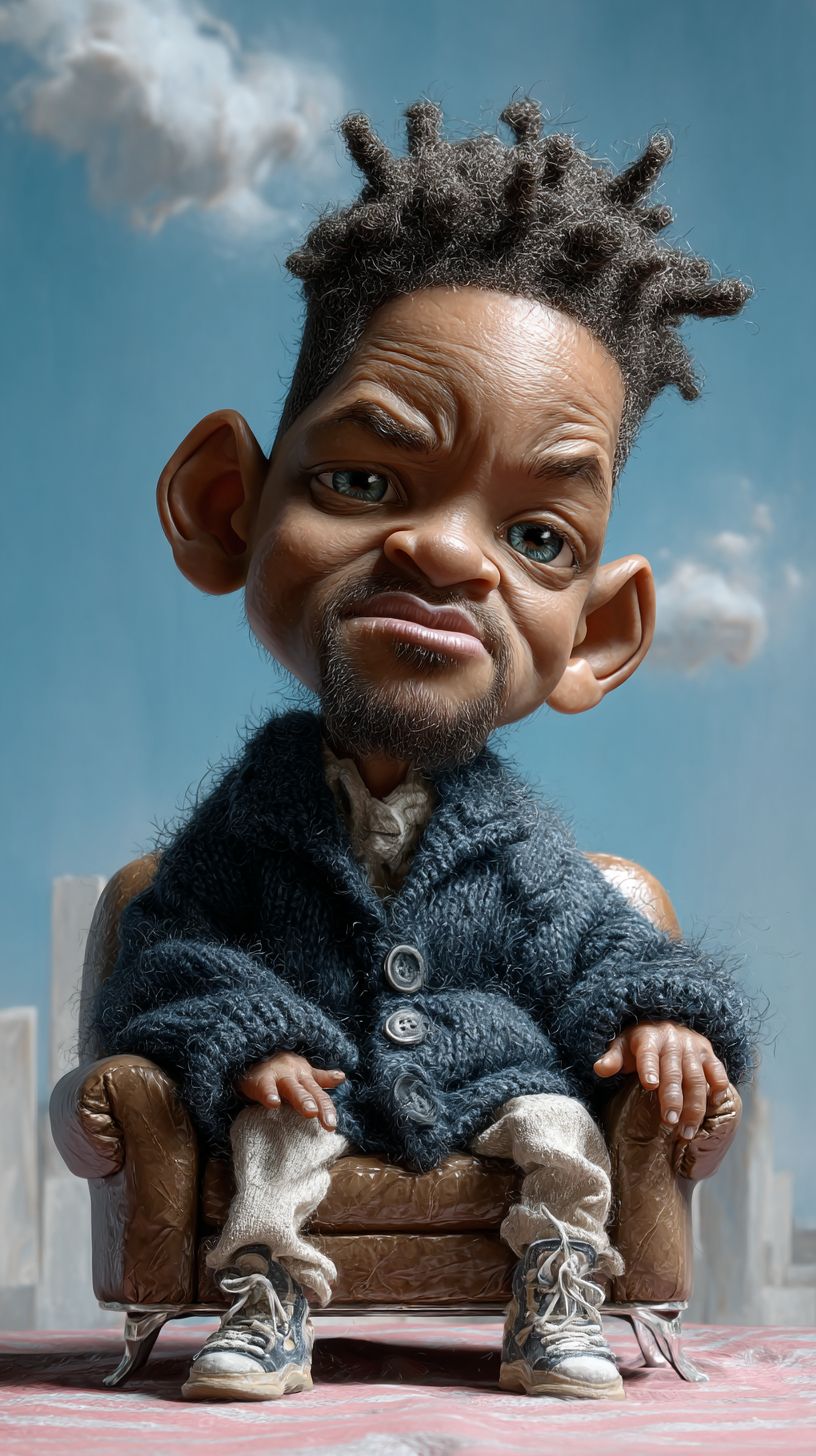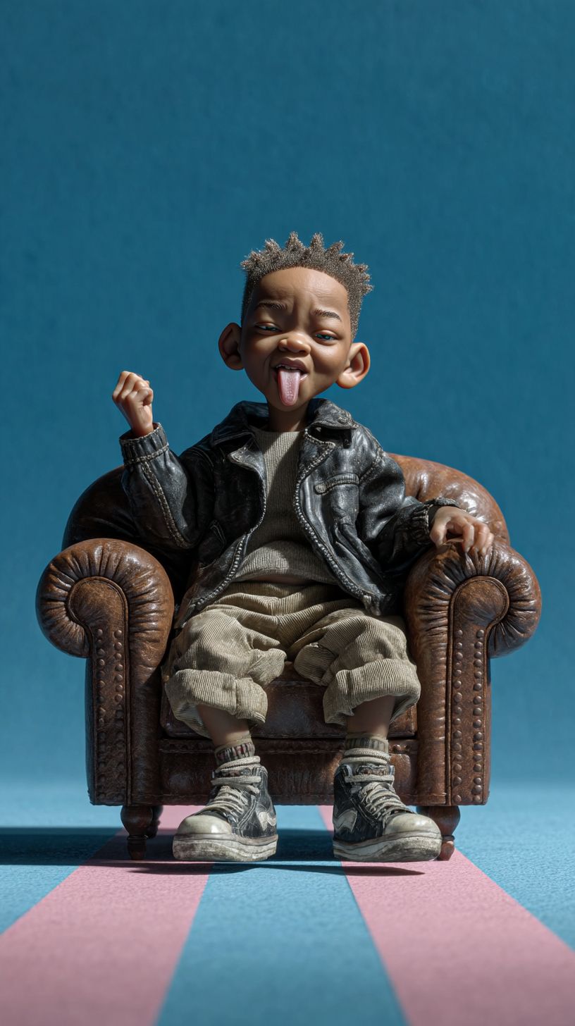 A photo of a 1-year-old baby version of Will Smith, with similar eye shape, hair, and warm skin tone. Smiling with teeth, big eyes, turned to the left side. Photorealistic. Big head-bob caricature character. Sitting relaxed in a tiny, stylish leather armchair. A slightly mischievous expression, with a raised eyebrow and a subtle smirk. Focus on capturing the charm, personality, and charisma through exaggerated features and a dynamic pose. The background is light and vividly colourful: sky-blue and milky pink stripes are expressive. Direct soft lighting. --ar 9:16 --raw --profile rism9e6 --stylize 950 --v 7.0