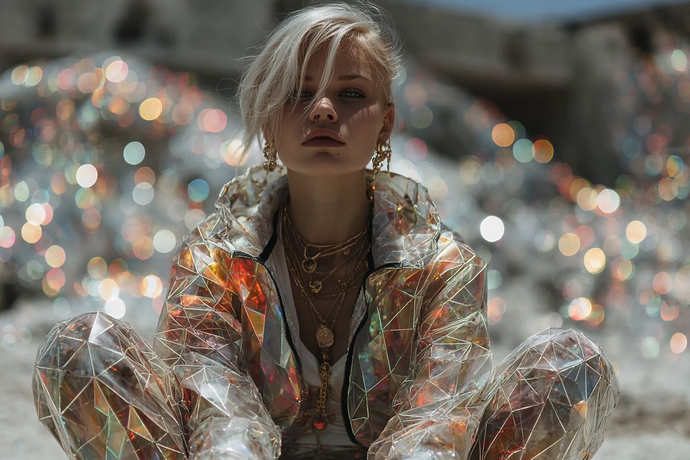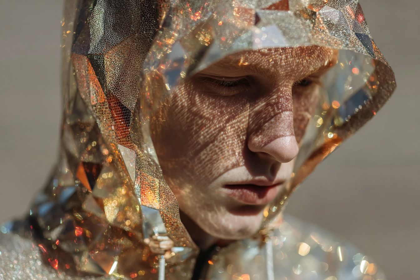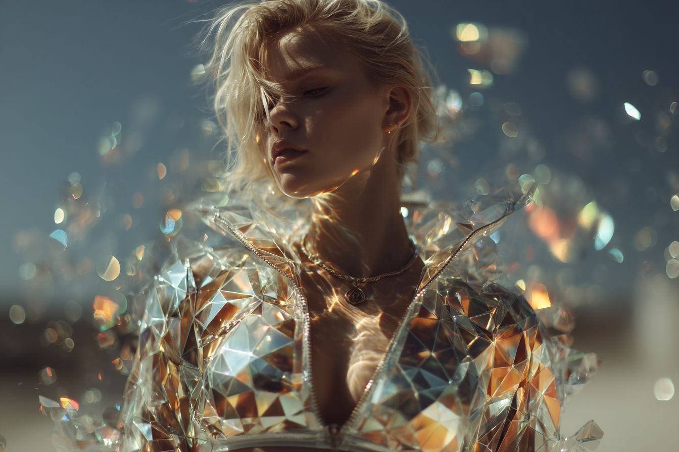Wide-angle cinematic photo of attractive person wearing full-body futuristic low-polygon reflective sportswear, splintered ethereal colours, fractured chromatic light, outdoor brutalist concrete, crystal bokeh, confused depth of field --ar 3:2 --exp 10 --raw --sref 301758625::1 2577280164::2 3049210022::1 --sv 4 --sw 110 --stylize 400 --v 7.0