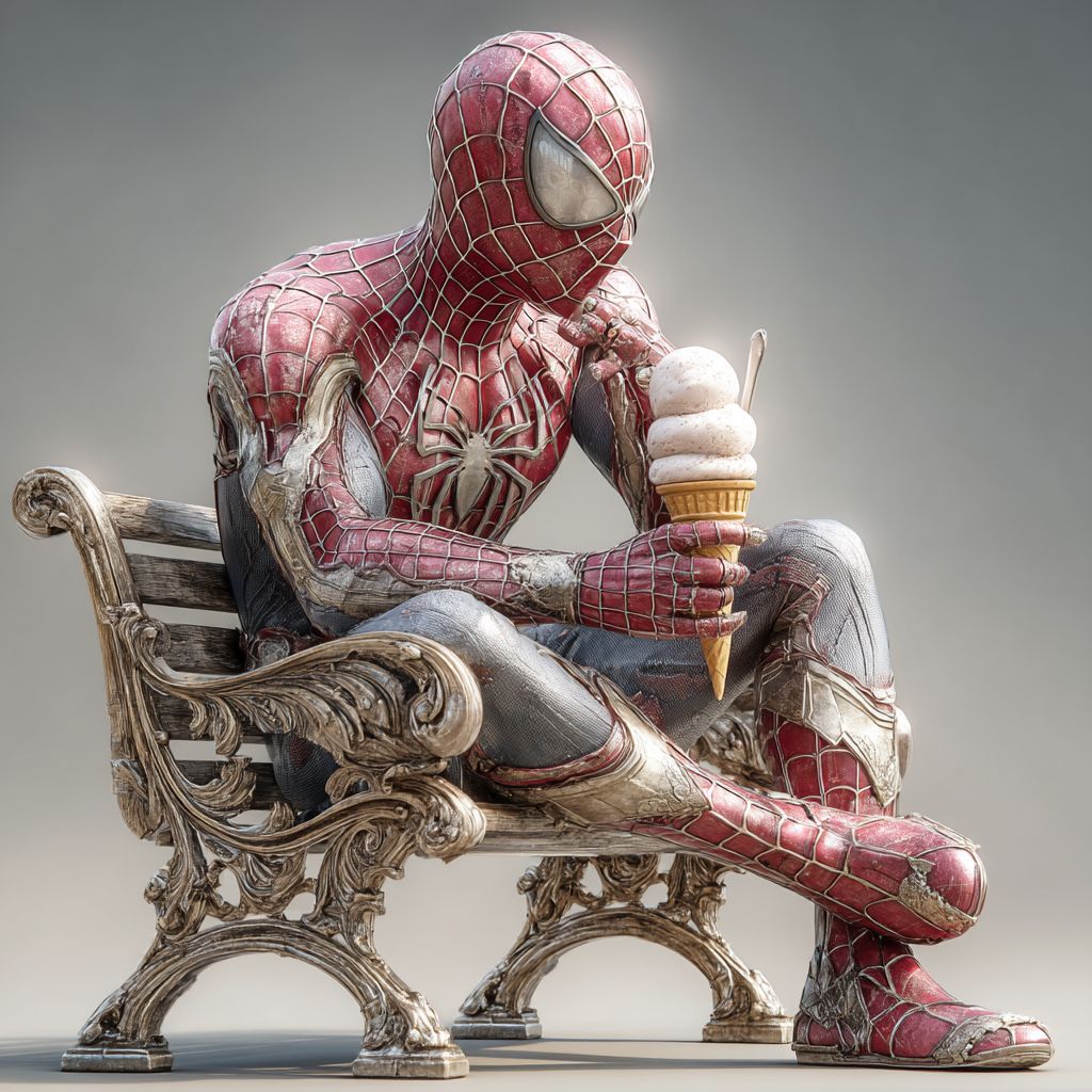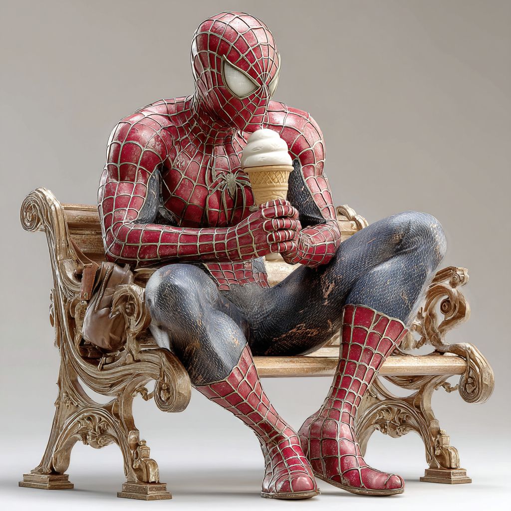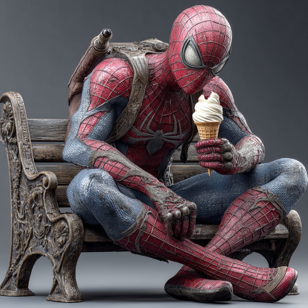 Spider-Man sitting on a small simple bench, eating ice cream cone. Image, real, rich in details, 4k --v 7.0 --s 250