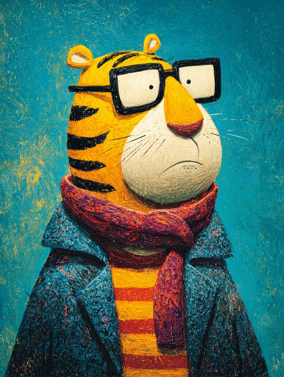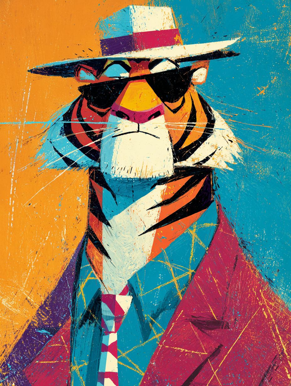 Tiger in style of Bill Finger, christoph niemann and fernando botero --ar 3:4 --exp 20 --profile r2zci6v --v 7.0