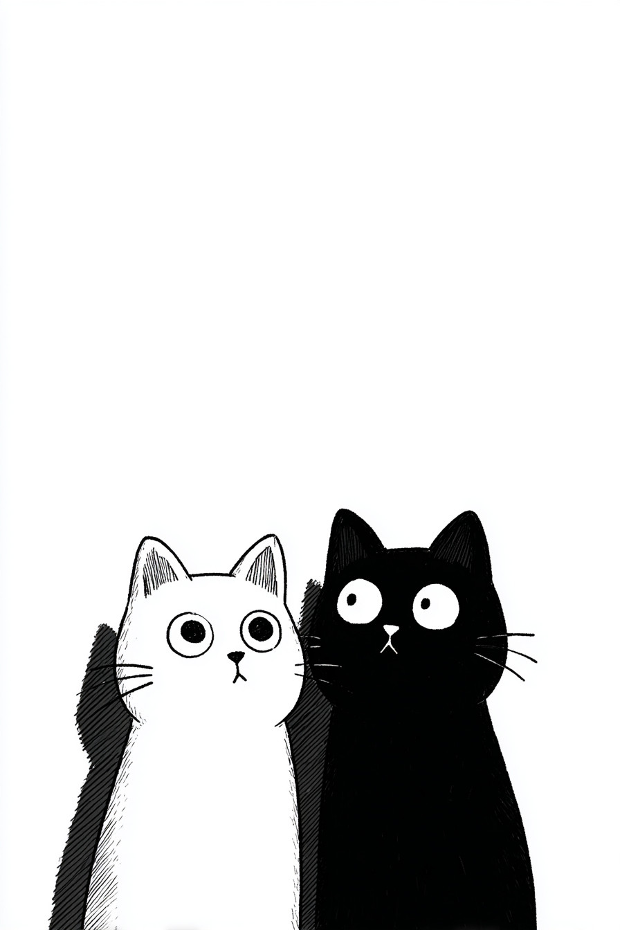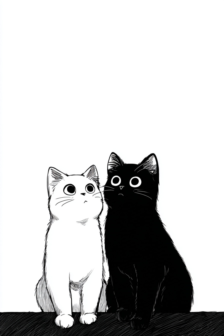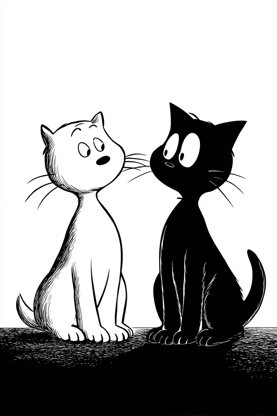Two cute cats, one white and one black, on a white background, line art style, SNOOPY style, comic style. --ar 2:3 --v 7.0