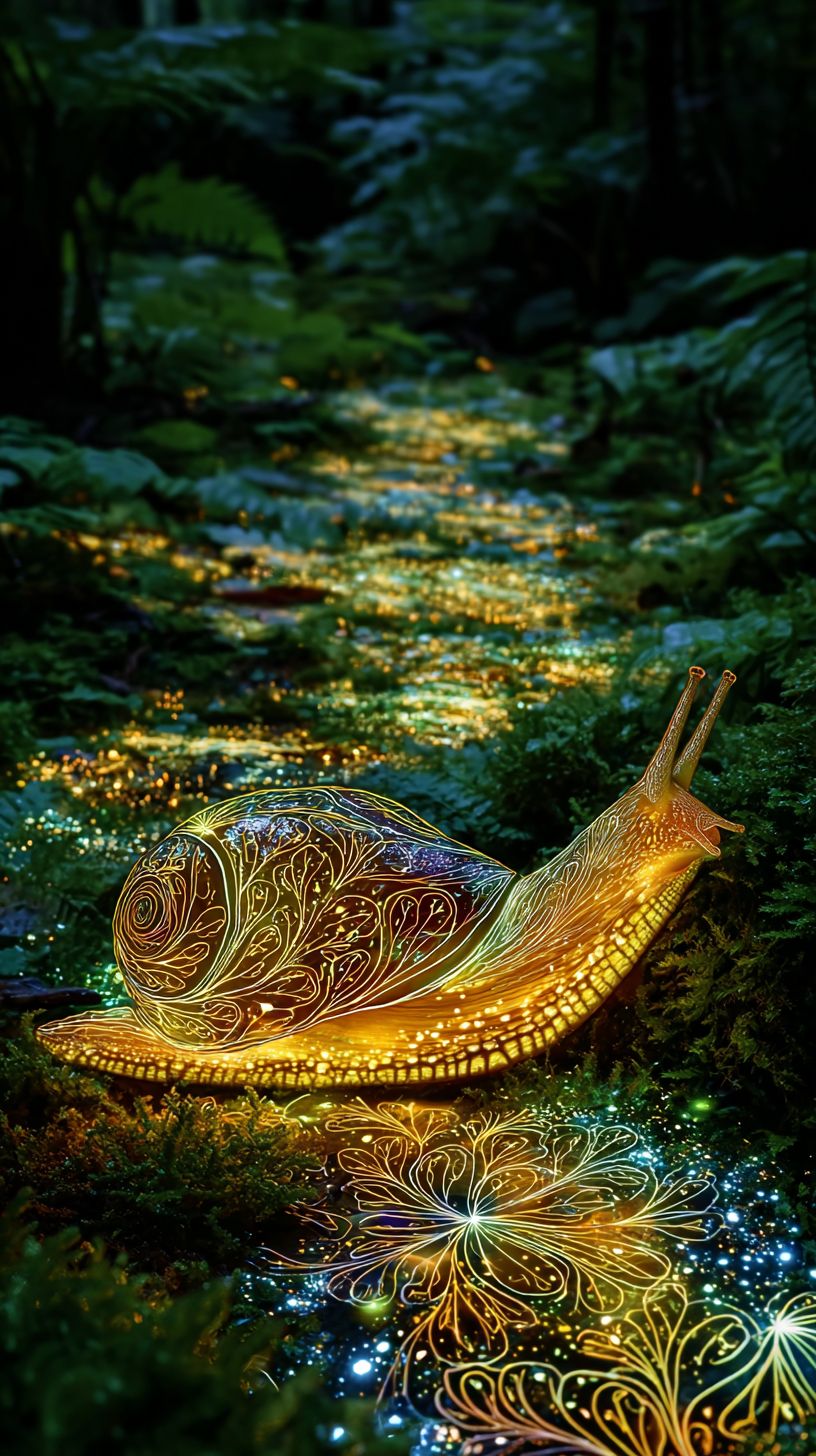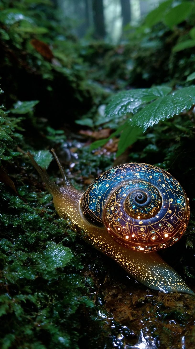 一只蜗牛在苔藓覆盖的森林地面上爬行,身上有发光的阴阳图案