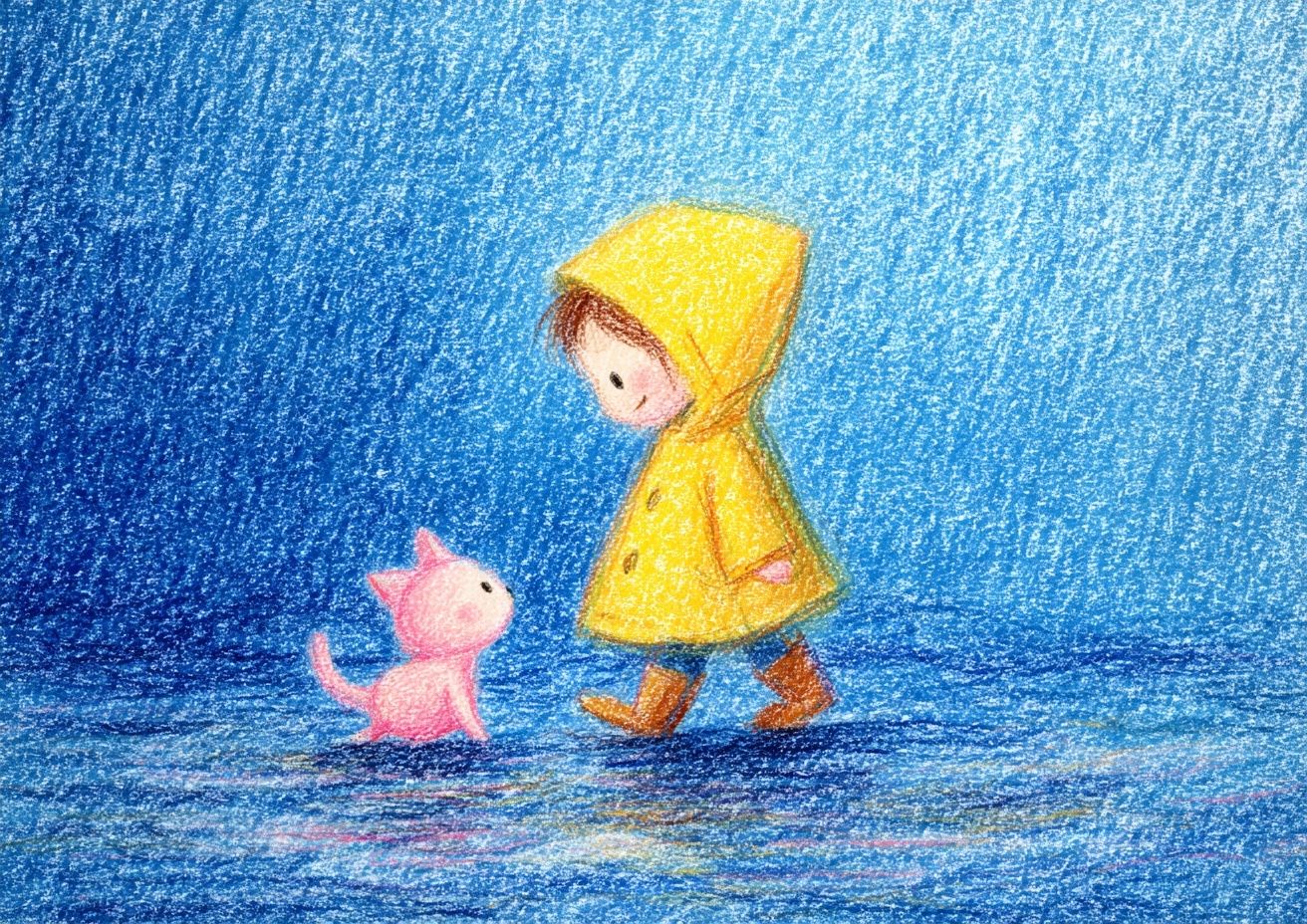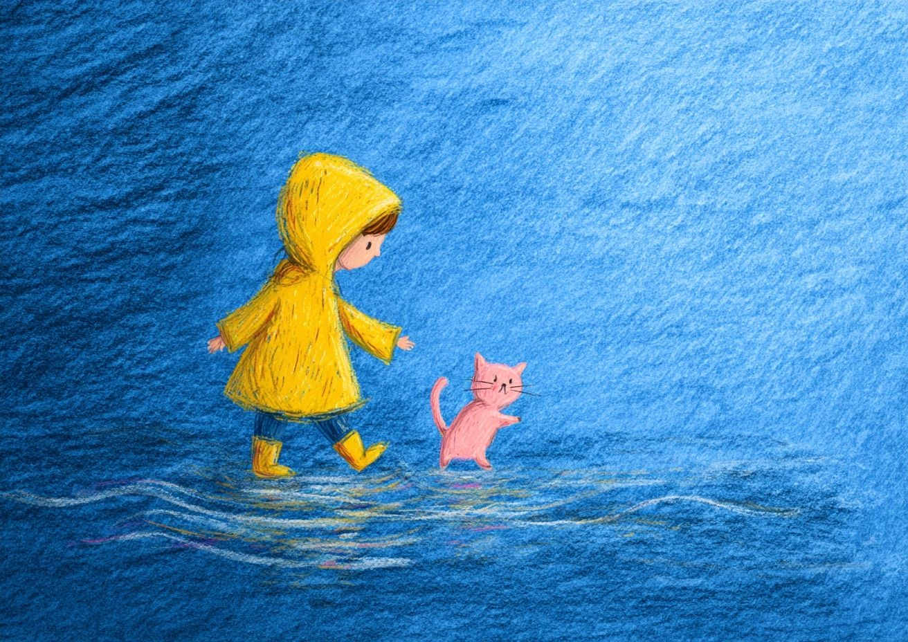 A cute little child wearing a yellow raincoat is stepping on a puddle, followed by a pink kitten. The background is blue, illustrated with colored pencils, featuring brush hand-drawn strokes and texture. There is a large area of blue, a clean background, and a vast scene where the characters are small. The artwork has a healing style with soft color combinations. --ar 7:5 --v 7.0