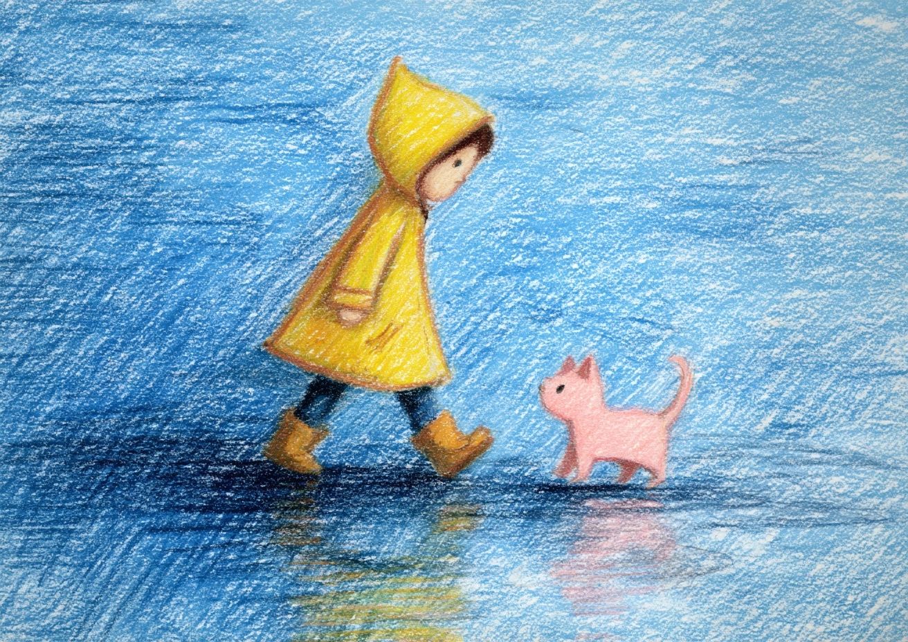 一个可爱的小孩穿着黄色雨衣正在踩水坑,身后跟着一只粉色的小猫。背景是蓝色的,用彩色铅笔绘制,包含手绘的笔触和纹理。大面积的蓝色背景干净,场景广阔,角色显得很小。艺术作品具有治愈风格,色彩组合柔和。