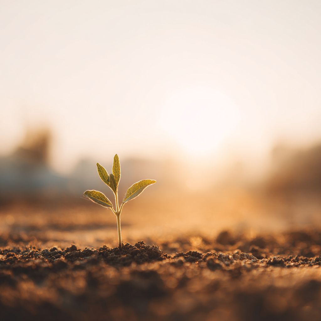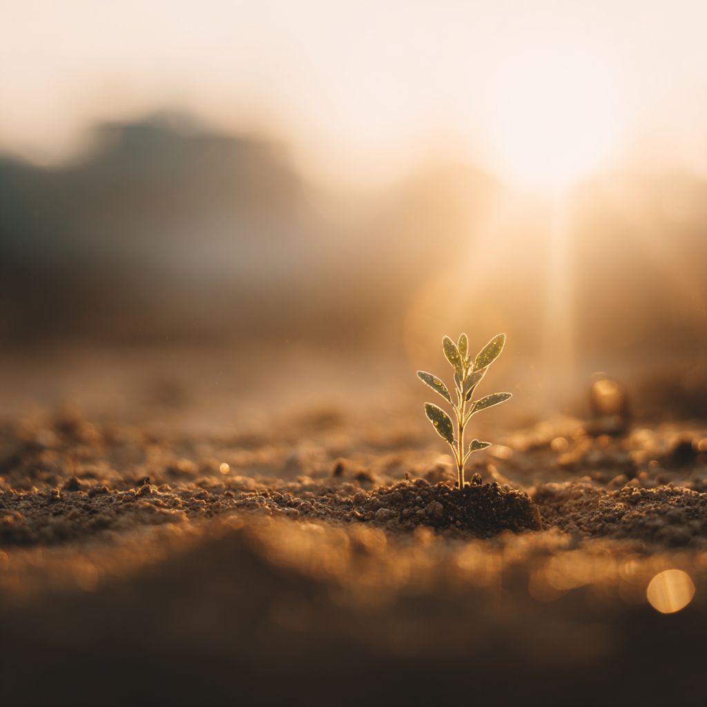 一株绿苗在淡米色土壤中破土而出,阳光柔和温暖,传递新生的希望