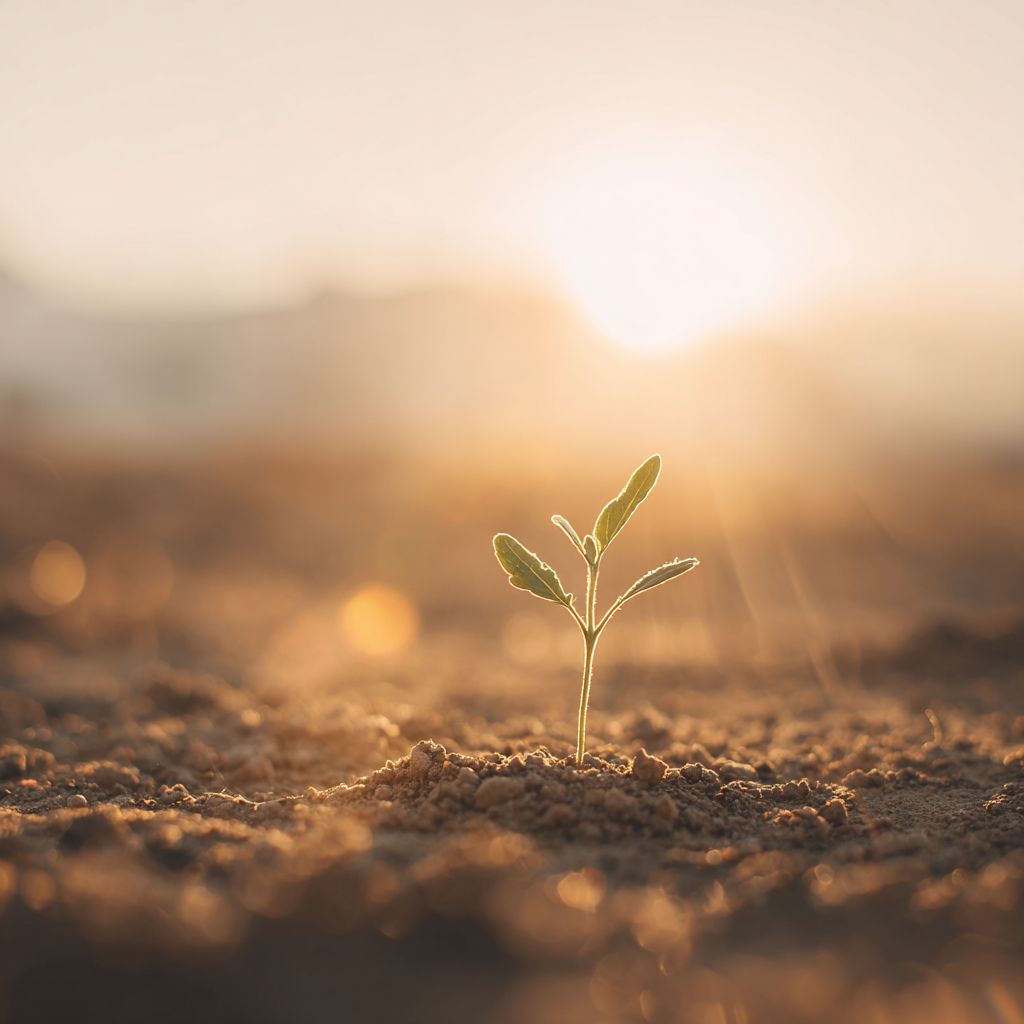single green seedling sprouting from pale beige earth, soft warm sunlight illuminating the scene, blurred bright background with hints of sky glow, minimal and uplifting composition, focus on new beginnings, light and peaceful atmosphere, no people --ar 1:1 --v 7.0 --p o3iqr93